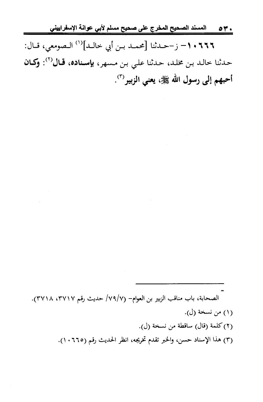 10666 - ز- حدثنا [محمد بن أبي خالد] (¬1) الصومعي، قال: حدثنا خالد بن مخلد، حدثنا علي بن مسهر، وإسناده، قال (¬2): وكان أحبهم إلى رسول الله -صلى الله عليه وسلم-، يعني الزبير (¬3).