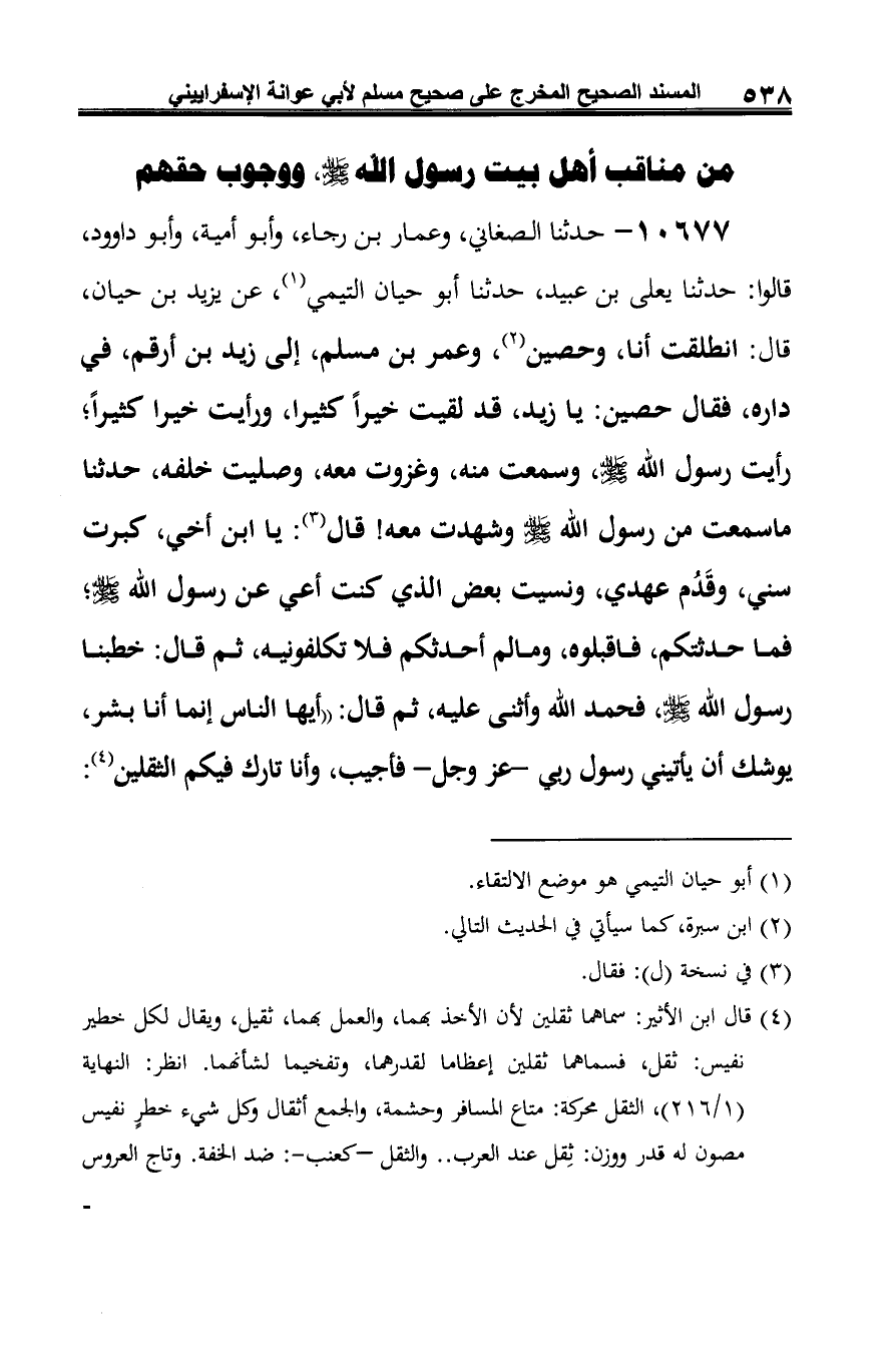 (¬4) قال ابن الأثير: سماهما ثقلين لأن الأخذ بهما، والعمل بهما، ثقيل، ويقال لكل خطير نفيس: ثقل، فسماهما ثقلين إعظاما لقدرهما، وتفخيما لشأنهما. انظر: النهاية (1/ 216)، الثقل محركة: متاع المسافر وحشمة، والجمع أثقال كل شيء خطرٍ نفيس مصون له قدر ووزن: ثِقل عند العرب .. والثقل -كعنب-: ضد التحفة. وتاج العروس =