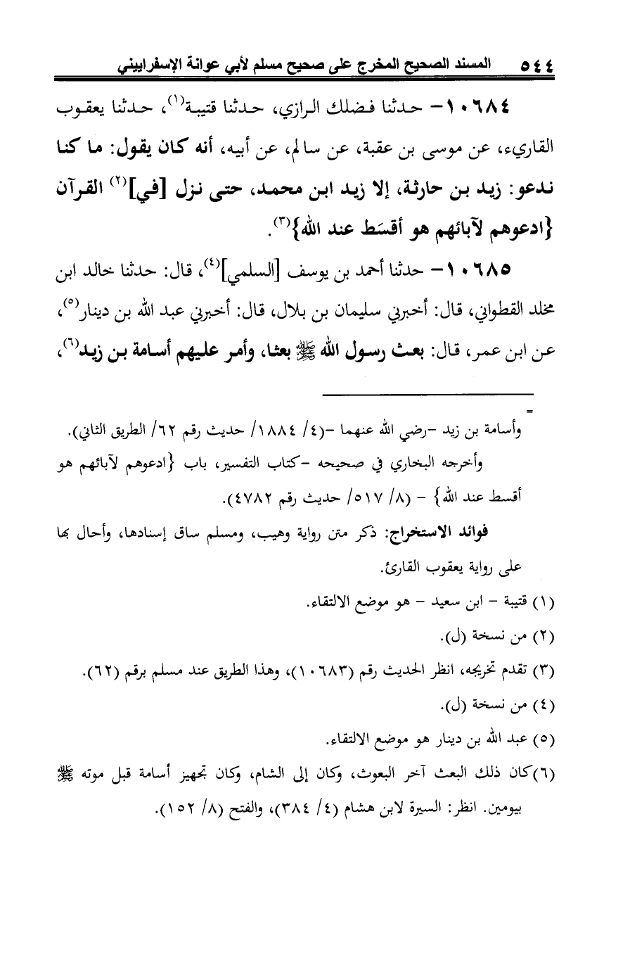 10684 - حدثنا فضلك الرازي، حدثنا قتيبة (¬1)، حدثنا يعقوب القاريء، عن موسى بن عقبة، عن سالم، عن أبيه، أنه كان يقول: ما كنا ندعو: زيد بن حارثة، إلا زيد ابن محمَّد، حتى نزل [في] (¬2) القرآن {ادْعُوهُمْ لِآبَائِهِمْ هُوَ أَقْسَطُ عِنْدَ اللَّهِ} (¬3).