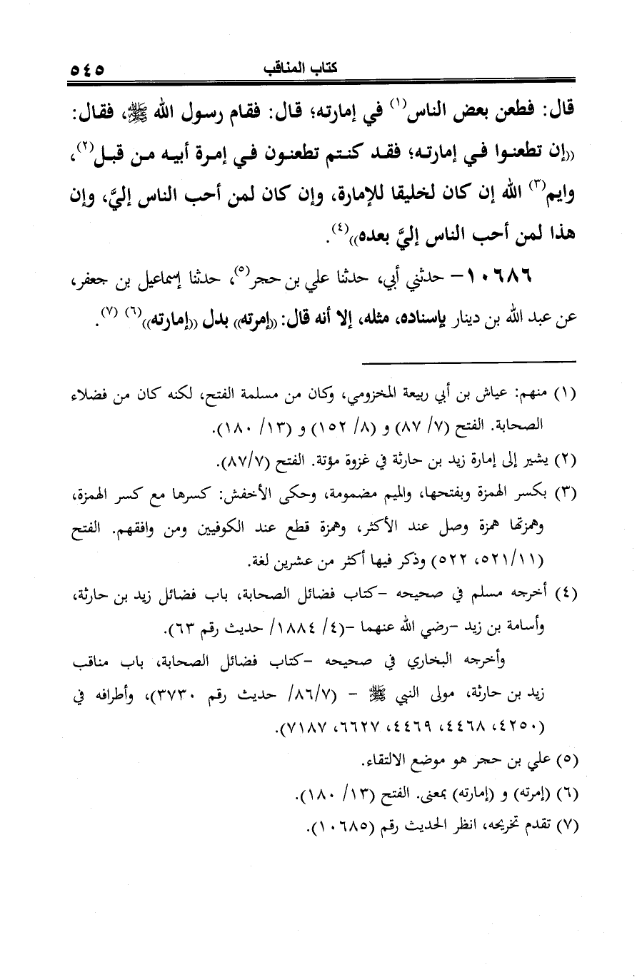 10686 - حدثني أبي، حدثنا علي بن حجر (¬1)، حدثنا إسماعيل بن جعفر، عن عبد الله بن دينار بإسناده، مثله، إلا أنه قال: "إمرته" بدل "إمارته" (¬2) (¬3).