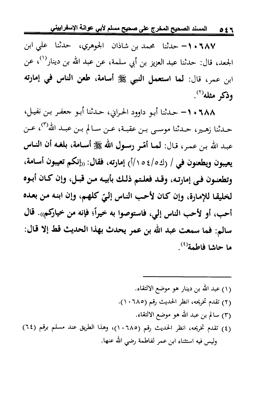 10688 - حدثنا أبو داوود الحراني، حدثنا أبو جعفر بن نفيل، حدثنا زهير، حدثنا موسى بن عقبة، عن سالم بن عبد الله (¬1)، عن عبد الله بن عمر، قال: لما أمّر رسول الله -صلى الله عليه وسلم- أسامة، بلغه أن الناس يعيبون ويطعنون في إمارته، فقال: "إنكم تعيبون أسامة، وتطعنون في إمارته، وقد فعلتم ذلك بأبيه من قبل، وإن كان أبوه لخليقا للإمارة، وإن كان لأحب الناس إليّ كلهم، وإن ابنه من بعده أحب، أو لأحب الناس إلي، فاستوصوا به خيرًا؛ فإنه من خياركم". قال سالم: فما سمعت عبد الله بن عمر يحدث بهذا الحديث قط إلا قال: ما حاشا فاطمة (¬2).