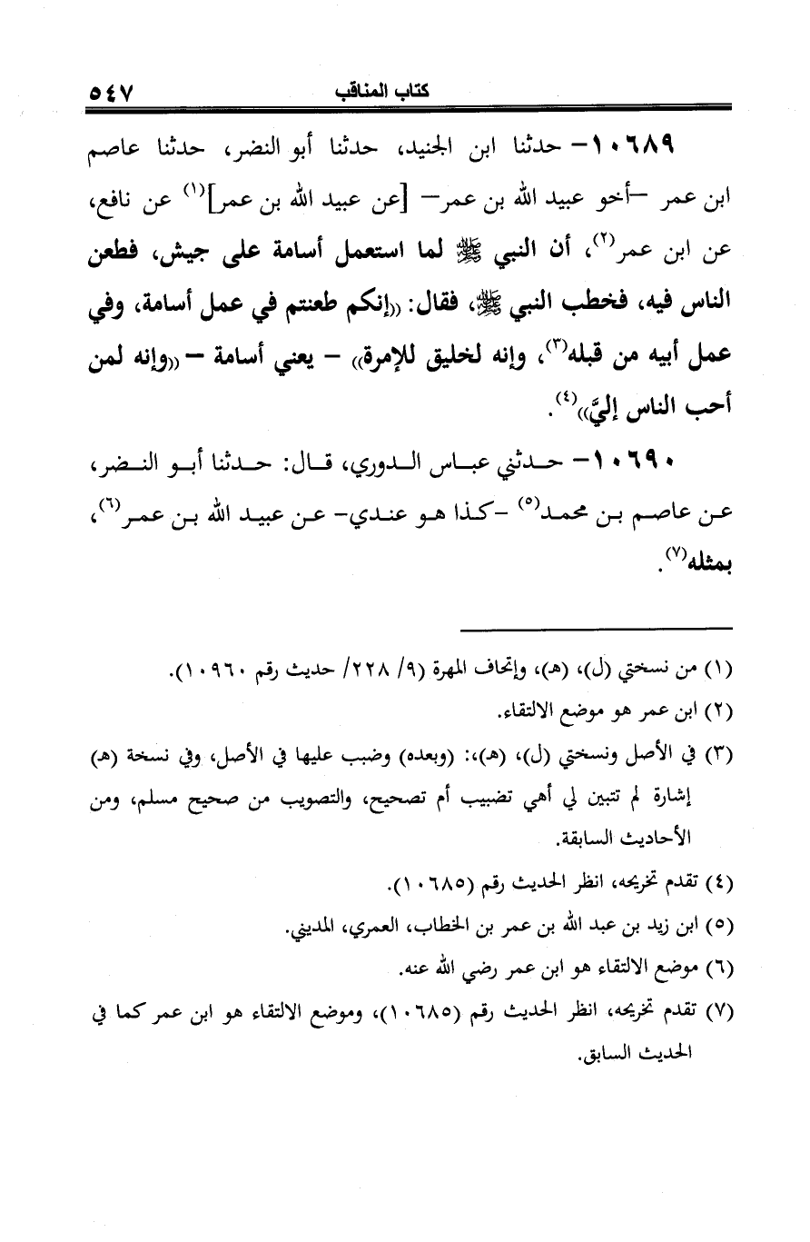 10689 - حدثنا ابن الجنيد، حدثنا أبو النضر، حدثنا عاصم ابن عمر-أخو عبيد الله بن عمر-[عن عبيد الله بن عمر] (¬1) عن نافع، عن ابن عمر (¬2)، أن النبي -صلى الله عليه وسلم- لما استعمل أسامة على جيش، فطعن الناس فيه، فخطب النبي -صلى الله عليه وسلم-، فقال: "إنكم طعنتم في عمل أسامة، وفي عمل أبيه من قبله (¬3)، وإنه لخليق للإمرة" -يعني أسامة- "وإنه لمن أحب الناس إليَّ" (¬4).