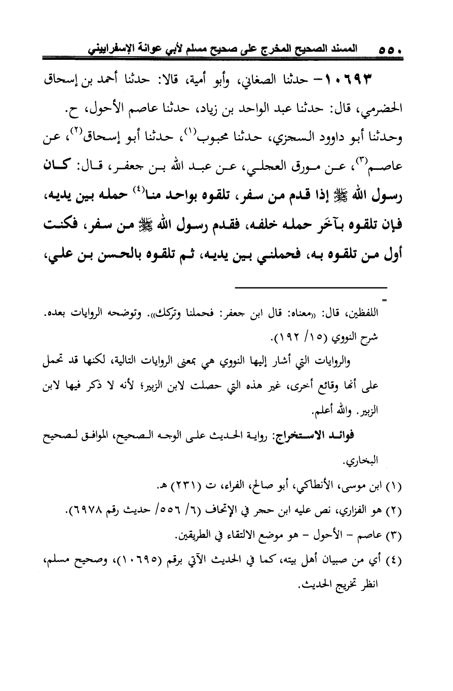 وحدثنا أبو داوود السجزي، حدثنا محبوب (¬1)، حدثنا أبو إسحاق (¬2)، عن عاصم (¬3)، عن مورق العجليّ، عن عبد الله بن جعفر، قال: كان رسول الله - صلى الله عليه وسلم - إذا قدم من سفر، تلقوه بواحد منا (¬4) حمله بين يديه، فإن تلقوه بآخَر حمله خلفه، فقدم رسول الله -صلى الله عليه وسلم- من سفر، فكنت أول من تلقوه به، فحملني بين يديه، ثم تلقوه بالحسن بن علي،