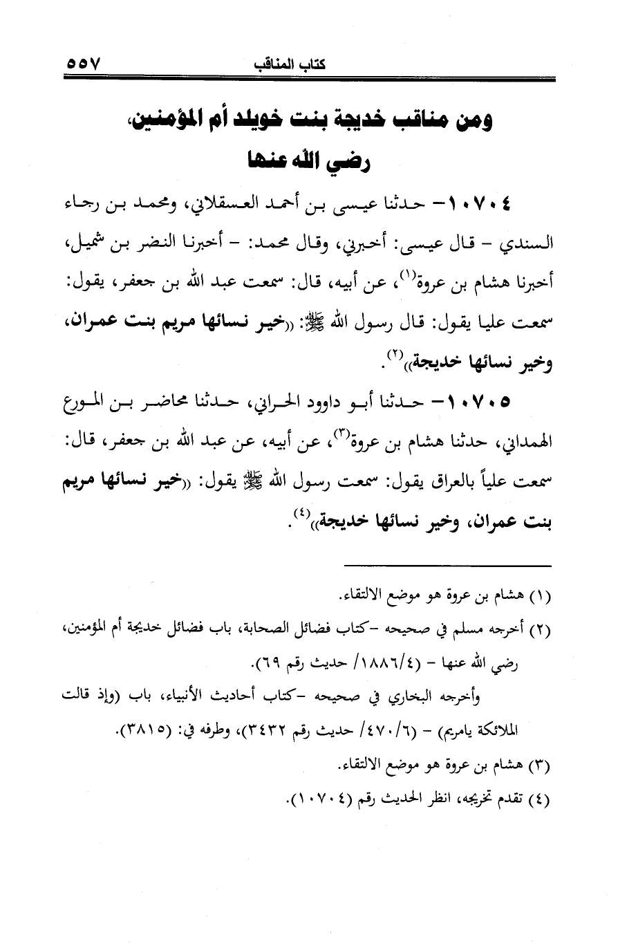 10704 - حدثنا عيسى بن أحمد العسقلاني، ومحمد بن رجاء السندي -قال عيسى: أخبرني، وقال محمَّد: - أخبرنا النضر بن شميل، أخبرنا هشام بن عروة (¬1)، عن أبيه، قال: سمعت عبد الله بن جعفر، يقول: سمعت عليا يقول: قال رسول الله -صلى الله عليه وسلم-: "خير نسائها مريم بنت عمران، وخير نسائها خديجة" (¬2).