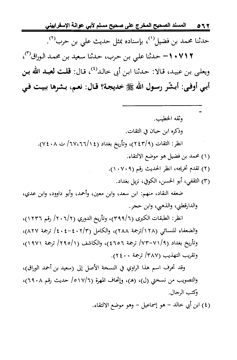 10712 - حدثنا علي بن حرب، حدثنا سعيد بن محمَّد الوراق (¬1)، ويعلى بن عبيد، قالا: حدثنا ابن أبي خالد (¬2)، قال: قلت لعبد الله بن أبي أوفى: أبشّر رسول الله -صلى الله عليه وسلم- خديجة؟ قال: نعم، بشرها ببيت في
