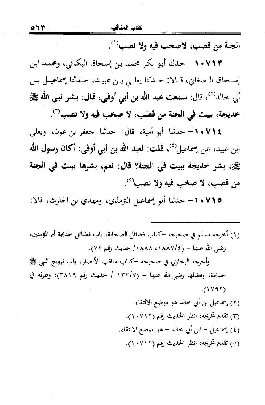 10713 - حدثنا أبو بكر محمَّد بن إسحاق البكائي، ومحمد ابن إسحاق الصغاني، قالا: حدثنا يعلى بن عبيد، حدثنا إسماعيل بن أبي خالد (¬1)، قال: سمعت عبد الله بن أبي أوفى، قال: بشر نبي الله -صلى الله عليه وسلم- خديجة، ببيت في الجنة من قصَب، لا صخب فيه ولا نصب (¬2).