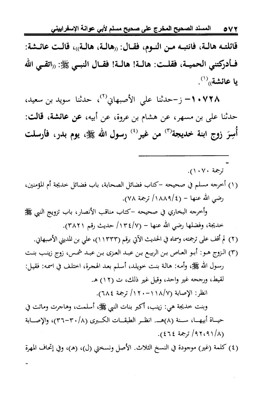10728 - ز- حدثنا علي الأصبهاني (¬1)، حدثنا سويد بن سعيد، حدثنا علي بن مسهر، عن هشام بن عروة، عن أبيه، عن عائشة، قالت: أُسِرَ زوج ابنة خديجة (¬2) من غير (¬3) رسول الله -صلى الله عليه وسلم-، يوم بدر، فأرسلت
