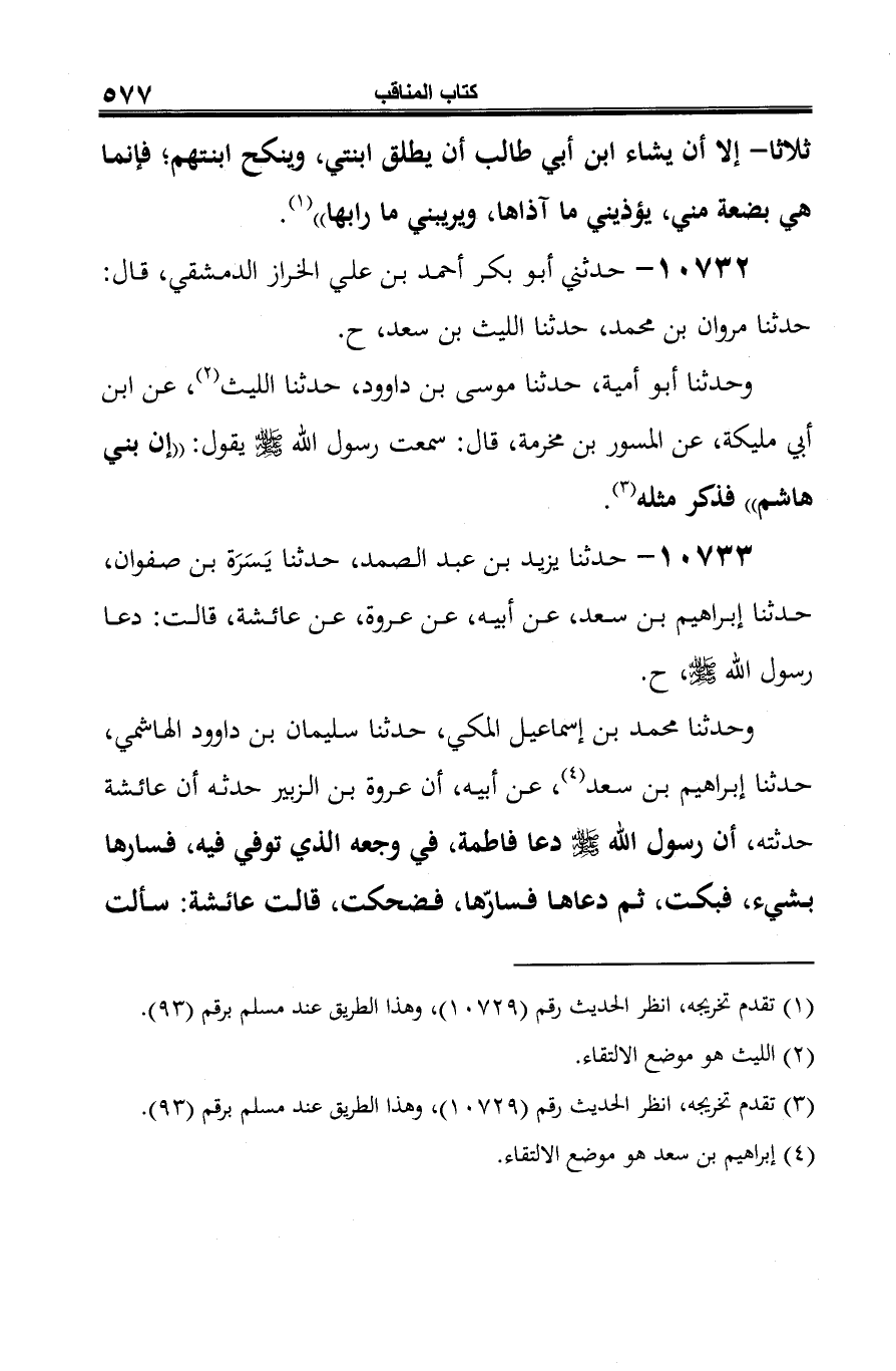 وحدثنا محمد بن إسماعيل المكي، حدثنا سليمان بن داوود الهاشمي، حدثنا إبراهيم بن سعد (¬1)، عن أبيه، أن عروة بن الزبير حدثه أن عائشة حدثته، أن رسول الله -صلى الله عليه وسلم- دعا فاطمة، في وجعه الذي توفي فيه، فسارها بشيء، فبكت، ثم دعاها فسارّها، فضحكت، قالت عائشة: سألت