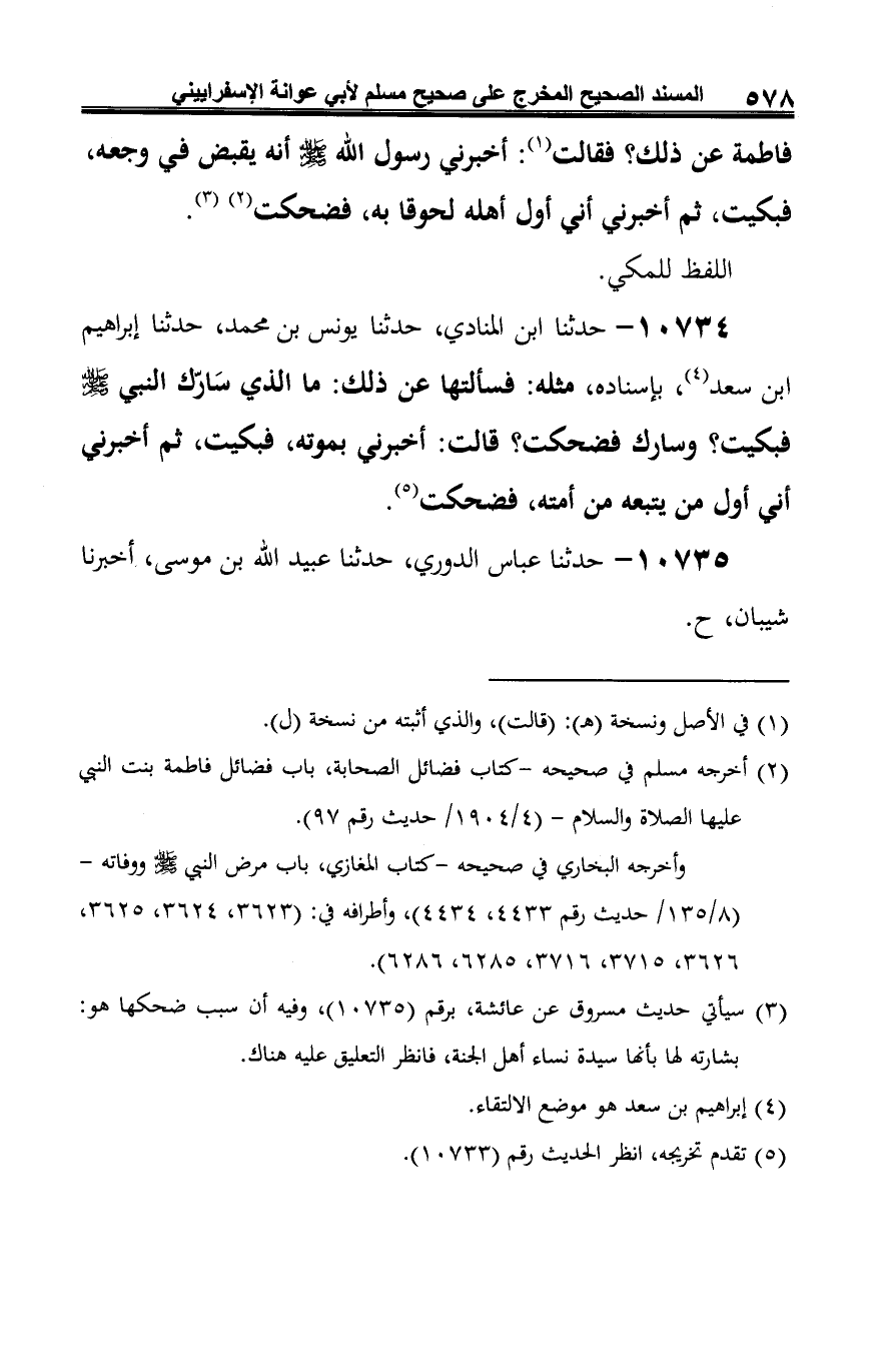 10734 - حدثنا ابن المنادي، حدثنا يونس بن محمد، حدثنا إبراهيم ابن سعد (¬1)، بإسناده، مثله: فسألتها عن ذلك: ما الذي سَارّك النبي -صلى الله عليه وسلم- فبكيت؟ وسارك فضحكت؟ قالت: أخبرني بموته، فبكيت، ثم أخبرني أني أول من يتبعه من أمته، فضحكت (¬2).