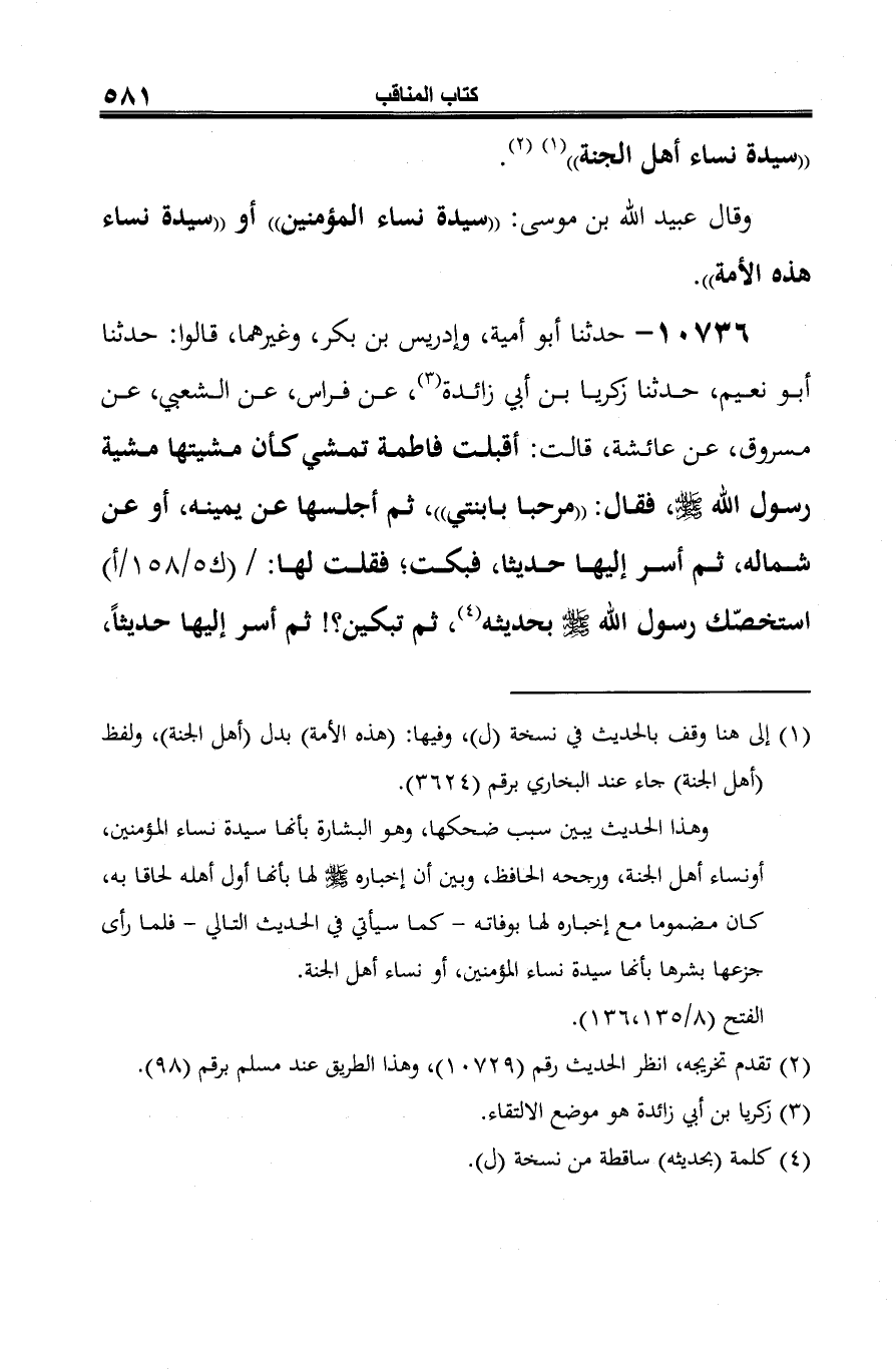 10736 - حدثنا أبو أمية، وإدريس بن بكر، وغيرهما، قالوا: حدثنا أبو نعيم، حدثنا زكريا بن أبي زائدة (¬1)، عن فراس، عن الشعبي، عن مسروق، عن عائشة، قالت: أقبلت فاطمة تمشي كأن مشيتها مشية رسول الله -صلى الله عليه وسلم-، فقال: "مرحبًا بابنتي"، ثم أجلسها عن يمينه، أو عن شماله، ثم أسر إليها حديثًا، فبكت، فقلت لها: استخصّك رسول الله -صلى الله عليه وسلم- بحديثه (¬2)، ثم تبكين؟! ثم أسر إليها حديثًا،
