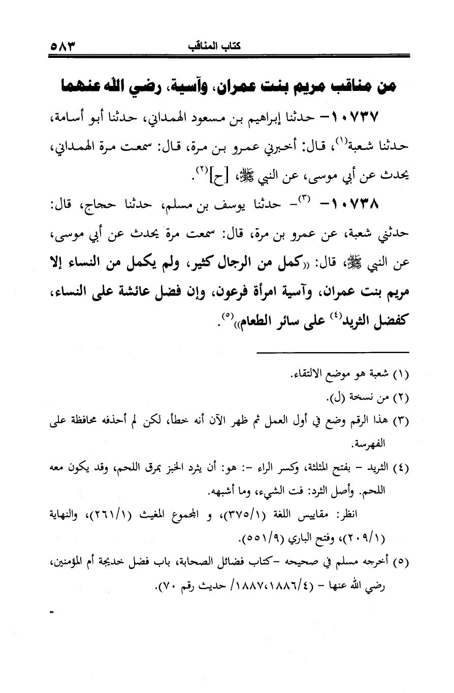 10738 - (¬1) - حدثنا يوسف بن مسلم، حدثنا حجاج، قال: حدثني شعبة، عن عمرو بن مرة، قال: سمعت مرة يحدث عن أبي موسى، عن النبي -صلى الله عليه وسلم-، قال: "كمل من الرجال كثير، ولم يكمل من النساء إلا مريم بنت عمران، وآسية امرأة فرعون، وإن فضل عائشة على النساء، كفضل الثريد (¬2) على سائر الطعام" (¬3).