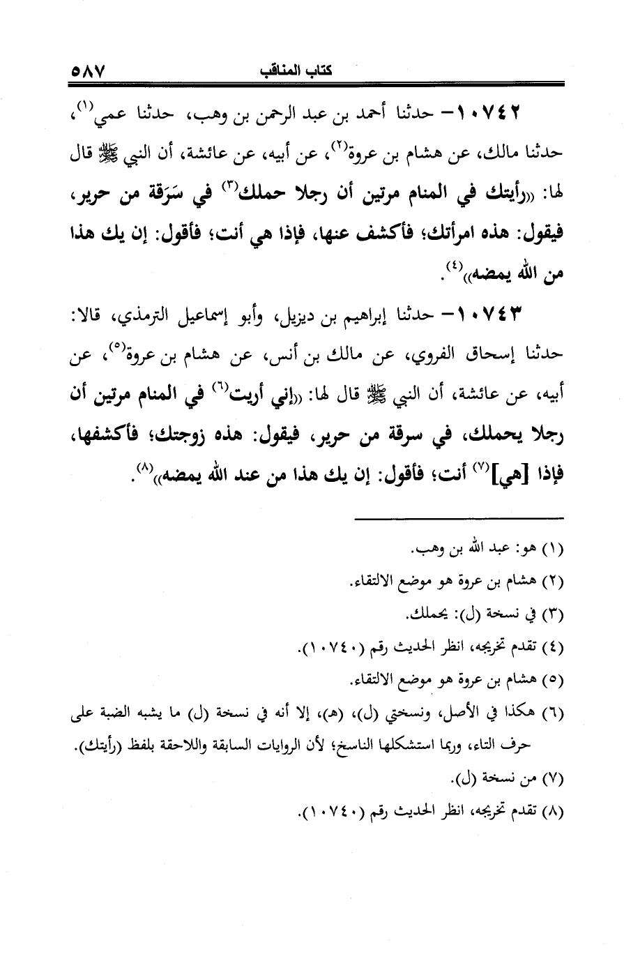 10742 - حدثنا أحمد بن عبد الرحمن بن وهب، حدثنا عمي (¬1)، حدثنا مالك، عن هشام بن عروة (¬2)، عن أبيه، عن عائشة، أن النبي-صلى الله عليه وسلم- قال لها: "رأيتك في المنام مرتين أن رجلًا حملك (¬3) في سَرَقة من حرير، فيقول: هذه امرأتك؛ فأكشف عنها، فإذا هي أنت؛ فأقول: إن يك هذا من الله يمضه" (¬4).