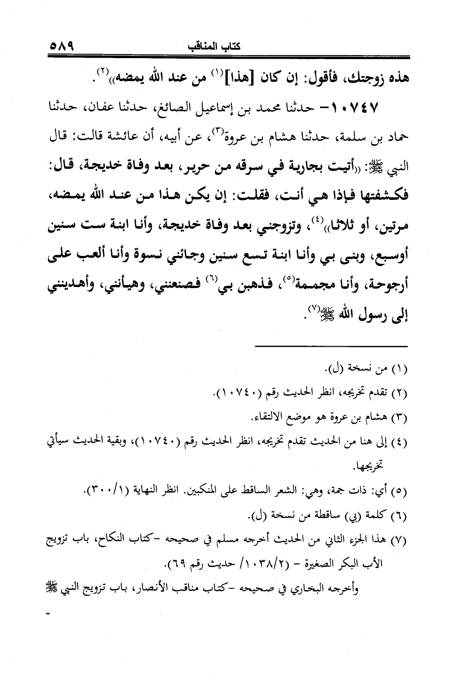 10747 - حدثنا محمد بن إسماعيل الصائغ، حدثنا عفان، حدثنا حماد بن سلمة، حدثنا هشام بن عروة (¬1)، عن أبيه، أن عائشة قالت: قال النبي -صلى الله عليه وسلم-: "أتيت بجارية في سرقه من حرير، بعد وفاة خديجة، قال: فكشفتها فإذا هي أنت، فقلت: إن يكن هذا من عند الله يمضه، مرتين، أو ثلاثًا" (¬2)، وتزوجني بعد وفاة خديجة، وأنا ابنة ست سنين أو سبع، وبنى بي وأنا ابنة تسع سنين وجائني نسوة وأنا ألعب على أرجوحة، وأنا مجممة (¬3)، فذهبن بي (¬4) فصنعنني، وهيأنني، وأهدينني إلى رسول الله -صلى الله عليه وسلم- (¬5).