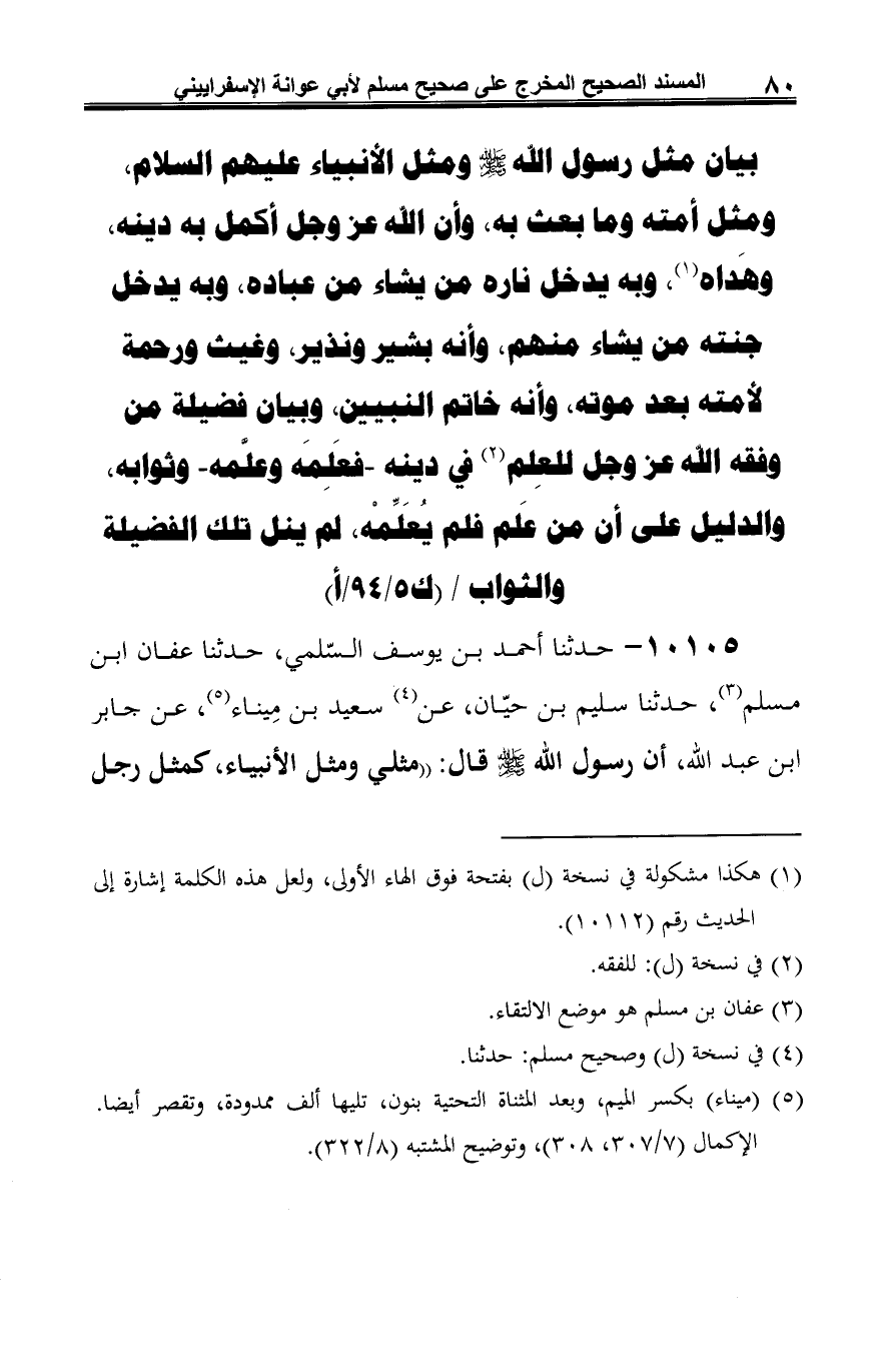 10105 - حدّثنا أحمد بن يوسف السّلمي، حدّثنا عفان ابن مسلم (¬1)، حدّثنا سليم بن حيّان، عن (¬2) سعيد بن مِيناء (¬3)، عن جابر ابن عبد الله، أن رسول الله -صلى الله عليه وسلم- قال: "مثلي ومثل الأنبياء، كمثل رجل