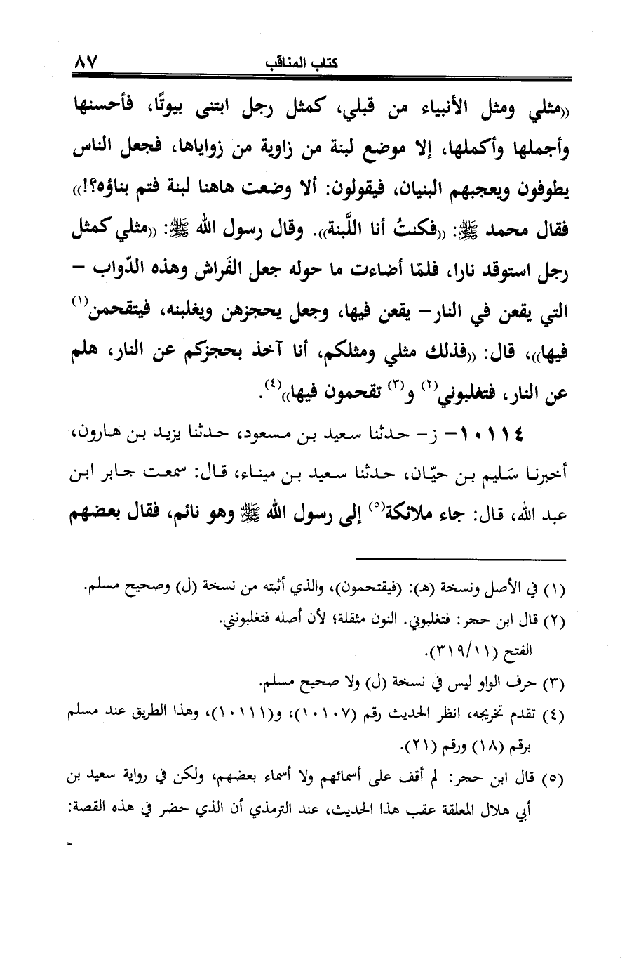 10114 - ز- حدّثنا سعيد بن مسعود، حدّثنا يزيد بن هارون، أخبرنا سَليم بن حيّان، حدّثنا سعيد بن ميناء، قال: سمعت جابر ابن عبد الله، قال: جاء ملائكة (¬1) إلى رسول الله -صلى الله عليه وسلم- وهو نائم، فقال بعضهم