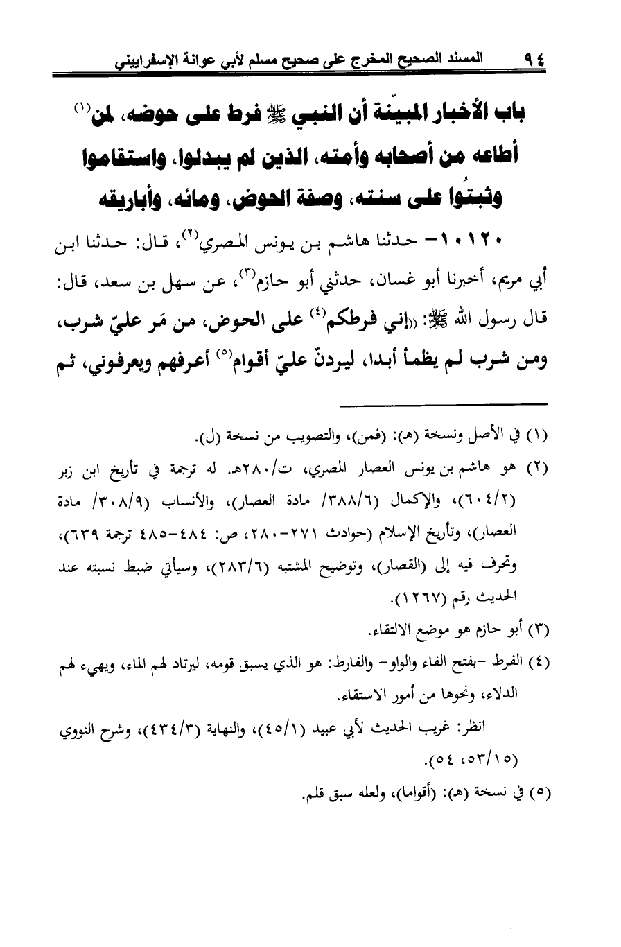 10120 - حدّثنا هاشم بن يونس المصري (¬1)، قال: حدّثنا ابن أبي مريم، أخبرنا أبو غسان، حدثني أبو حازم (¬2)، عن سهل بن سعد، قال: قال رسول الله -صلى الله عليه وسلم-: "إنِّي فرطكم (¬3) على الحوض، من مَر عليّ شرب، ومن شرب لم يظمأ أبدا، ليردنّ عليّ أقوام (¬4) أعرفهم ويعرفوني، ثمّ