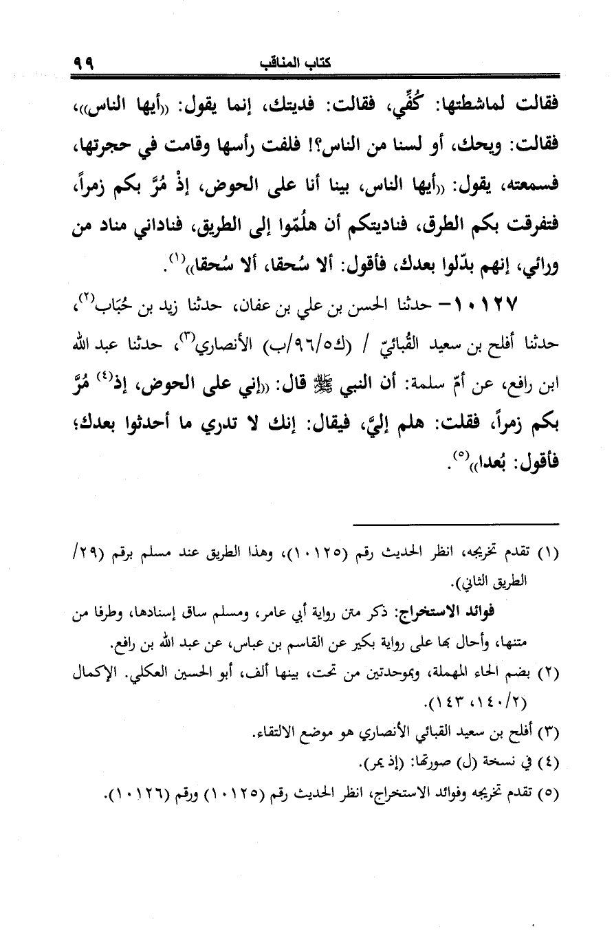 10127 - حدّثنا الحسن بن علي بن عفان، حدّثنا زيد بن حُبَاب (¬1)، حدّثنا أفلح بن سعيد القُبائيّ الأنصاري (¬2)، حدّثنا عبد الله ابن رافع، عن أمّ سلمة: أن النّبيّ -صلى الله عليه وسلم- قال: "إنِّي على الحوض، إذ (¬3) مُرَّ بكم زمرًا، فقلت: هلم إليَّ، فيقال: إنك لا تدري ما أحدثوا بعدك؛ فأقول: بُعدا" (¬4).