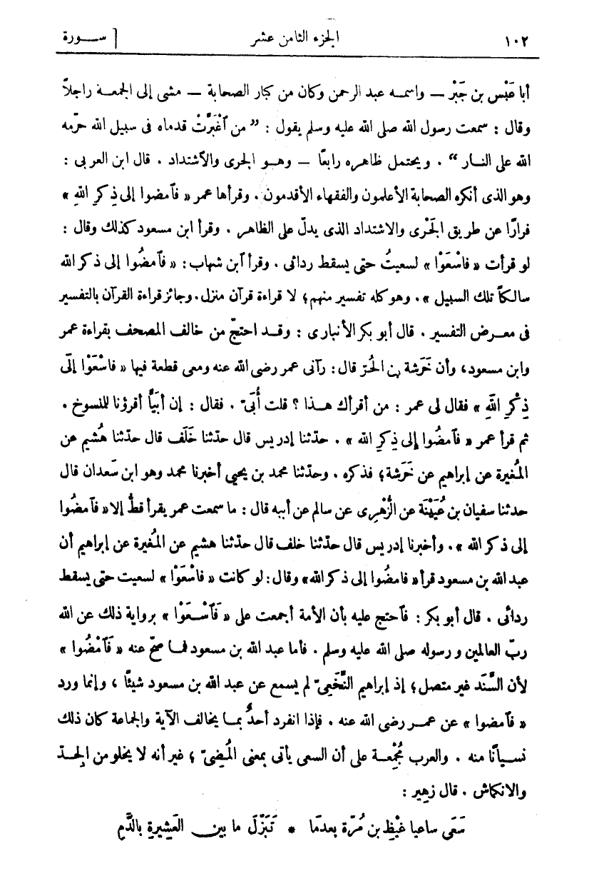 أَبَا عَبْسِ بْنِ جَبْرٍ- وَاسْمُهُ عَبْدُ الرَّحْمَنِ وَكَانَ مِنْ كِبَارِ الصَّحَابَةِ- مَشَى إِلَى الْجُمْعَةِ رَاجِلًا وَقَالَ: سَمِعْتُ رَسُولَ اللَّهِ صَلَّى اللَّهُ عَلَيْهِ وَسَلَّمَ يَقُولُ: (مَنِ اغْبَرَّتْ قَدَمَاهُ فِي سَبِيلِ اللَّهِ حَرَّمَهُ اللَّهُ عَلَى النَّارِ). وَيَحْتَمِلُ ظَاهِرُهُ رَابِعًا: وَهُوَ الْجَرْيُ وَالِاشْتِدَادُ قَالَ ابْنُ الْعَرَبِيِّ: وَهُوَ الَّذِي أَنْكَرَهُ الصَّحَابَةُ الْأَعْلَمُونَ وَالْفُقَهَاءُ الْأَقْدَمُونَ. وَقَرَأَهَا عُمَرُ:" فَامْضُوا إِلَى ذِكْرِ اللَّهِ" فِرَارًا عَنْ طَرِيقِ الْجَرْيِ وَالِاشْتِدَادِ الَّذِي يَدُلُّ عَلَى الظَّاهِرِ. وَقَرَأَ ابْنُ مَسْعُودٍ كَذَلِكَ وَقَالَ: لَوْ قَرَأْتُ فَاسْعَوْا لَسَعَيْتُ حَتَّى يَسْقُطَ رِدَائِي. وَقَرَأَ ابْنُ شِهَابٍ:" فَامْضُوا إِلَى ذِكْرِ اللَّهِ سَالِكًا تِلْكَ السَّبِيلَ". وَهُوَ كُلُّهُ تَفْسِيرٌ مِنْهُمْ، لَا قِرَاءَةَ قُرْآنٍ مُنَزَّلٍ. وَجَائِزٌ قِرَاءَةُ الْقُرْآنِ بِالتَّفْسِيرِ فِي مَعْرِضِ التَّفْسِيرِ. قَالَ أَبُو بَكْرٍ الْأَنْبَارِيُّ: وَقَدِ احْتَجَّ مَنْ خَالَفَ الْمُصْحَفَ بِقِرَاءَةِ عُمَرَ وَابْنِ مَسْعُودٍ، وَأَنَّ خَرَشَةَ بْنَ الْحُرِّ قَالَ: رَآنِي عُمَرُ رَضِيَ اللَّهُ عَنْهُ وَمَعِي قِطْعَةٌ فِيهَا فَاسْعَوْا إِلى ذِكْرِ اللَّهِ فَقَالَ لِي عُمَرُ: مَنْ أَقْرَأَكَ هَذَا؟ قُلْتُ أُبَيٌّ. فَقَالَ: إِنَّ أُبَيًّا أَقْرَؤُنَا لِلْمَنْسُوخِ. ثُمَّ قَرَأَ عُمَرُ" فَامْضُوا إِلَى ذِكْرِ اللَّهِ". حَدَّثَنَا إِدْرِيسُ قَالَ حَدَّثَنَا خَلَفٌ قَالَ حَدَّثَنَا هُشَيْمٌ عَنِ الْمُغِيرَةِ عَنْ إِبْرَاهِيمَ عَنْ خَرَشَةَ، فَذَكَرَهُ. وَحَدَّثَنَا مُحَمَّدُ بْنُ يَحْيَى أَخْبَرَنَا مُحَمَّدٌ وَهُوَ ابْنُ سَعْدَانَ قَالَ حَدَّثَنَا سُفْيَانُ بْنُ عُيَيْنَةَ عَنِ الزُّهْرِيِّ عَنْ سَالِمٍ عَنْ أَبِيهِ قَالَ: مَا سَمِعْتُ عُمَرَ يَقْرَأُ قَطُّ إِلَّا" فَامْضُوا إِلَى ذِكْرِ اللَّهِ". وَأَخْبَرَنَا إِدْرِيسُ قَالَ حَدَّثَنَا خَلَفٌ قَالَ حَدَّثَنَا هُشَيْمٌ عَنِ الْمُغِيرَةِ عَنْ إِبْرَاهِيمَ أَنَّ عَبْدَ اللَّهِ بْنَ مَسْعُودٍ قَرَأَ" فَامْضُوا إِلَى ذِكْرِ اللَّهِ" وَقَالَ: لَوْ كَانَتْ فَاسْعَوْا لَسَعَيْتُ حَتَّى يَسْقُطَ رِدَائِي. قَالَ أَبُو بَكْرٍ: فَاحْتَجَّ عَلَيْهِ بِأَنَّ الْأُمَّةَ أَجْمَعَتْ عَلَى فَاسْعَوْا بِرِوَايَةِ ذَلِكَ عَنِ اللَّهِ رَبِّ الْعَالَمِينَ وَرَسُولِهِ صَلَّى اللَّهُ عَلَيْهِ وَسَلَّمَ. فَأَمَّا عَبْدُ اللَّهِ بْنُ مَسْعُودٍ فَمَا صَحَّ عَنْهُ" فَامْضُوا" لِأَنَّ السَّنَدَ غَيْرُ مُتَّصِلٍ، إِذْ إِبْرَاهِيمُ النَّخَعِيُّ لَمْ يَسْمَعْ عَنْ عَبْدِ اللَّهِ بْنِ مَسْعُودٍ شَيْئًا، وَإِنَّمَا وَرَدَ" فَامْضُوا" عَنْ عُمَرَ رَضِيَ اللَّهُ عَنْهُ. فَإِذَا انْفَرَدَ أَحَدٌ بِمَا يُخَالِفُ الْآيَةَ وَالْجَمَاعَةَ كَانَ ذَلِكَ نِسْيَانًا مِنْهُ. وَالْعَرَبُ مُجْمِعَةٌ عَلَى أَنَّ السَّعْيَ يَأْتِي بِمَعْنَى الْمُضِيِّ، غَيْرَ أَنَّهُ لَا يَخْلُو مِنَ الْجِدِّ وَالِانْكِمَاشِ. قَالَ زهير:
