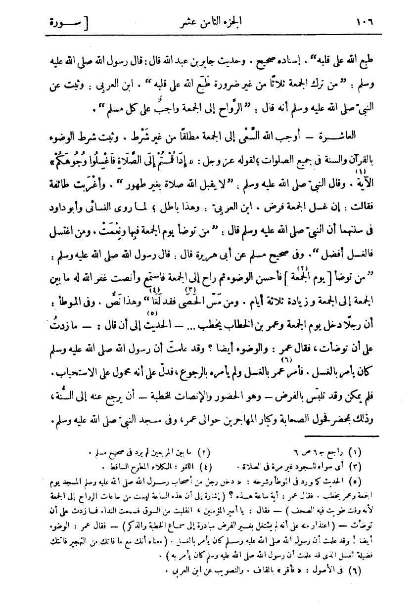 طَبَعَ اللَّهُ عَلَى قَلْبِهِ (. إِسْنَادُهُ صَحِيحٌ. وَحَدِيثُ جَابِرِ بْنِ عَبْدِ اللَّهِ قَالَ: قَالَ رَسُولُ اللَّهِ صَلَّى اللَّهُ عَلَيْهِ وَسَلَّمَ:) مَنْ تَرَكَ الْجُمُعَةَ ثَلَاثًا مِنْ غَيْرِ ضَرُورَةٍ طَبَعَ اللَّهُ عَلَى قَلْبِهِ (. ابْنُ الْعَرَبِيِّ: وَثَبَتَ عَنِ النَّبِيِّ صَلَّى اللَّهُ عَلَيْهِ وَسَلَّمَ أَنَّهُ قَالَ:) الرَّوَاحُ إِلَى الْجُمُعَةِ وَاجِبٌ عَلَى كُلِّ مُسْلِمٍ (. الْعَاشِرَةُ: أَوْجَبَ اللَّهُ السَّعْيَ إِلَى الْجُمُعَةِ مُطْلَقًا مِنْ غَيْرِ شَرْطٍ. وَثَبَتَ شَرْطُ الْوُضُوءِ بِالْقُرْآنِ وَالسُّنَّةِ فِي جَمِيعِ الصَّلَوَاتِ، لِقَوْلِهِ عَزَّ وَجَلَّ: إِذا قُمْتُمْ إِلَى الصَّلاةِ فَاغْسِلُوا وُجُوهَكُمْ [المائدة: ٦] الْآيَةَ «١». وَقَالَ النَّبِيُّ صَلَّى اللَّهُ عَلَيْهِ وَسَلَّمَ: (لَا يَقْبَلُ اللَّهُ صَلَاةً بِغَيْرِ طُهُورٍ). وَأَغْرَبَتْ طَائِفَةٌ فَقَالَتْ: إِنَّ غُسْلَ الْجُمْعَةِ فَرْضٌ. ابْنُ الْعَرَبِيِّ: وَهَذَا بَاطِلٌ، لِمَا رَوَى النَّسَائِيُّ وَأَبُو دَاوُدَ فِي سُنَنِهِمَا أَنَّ النَّبِيَّ صَلَّى اللَّهُ عَلَيْهِ وَسَلَّمَ قَالَ: (مَنْ تَوَضَّأَ يَوْمَ الْجُمُعَةِ فَبِهَا وَنِعْمَتْ. وَمَنِ اغْتَسَلَ فَالْغُسْلُ أَفْضَلُ). وَفِي صَحِيحِ مُسْلِمٍ عَنْ أَبِي هُرَيْرَةَ قَالَ: قَالَ رَسُولُ اللَّهِ صَلَّى اللَّهُ عَلَيْهِ وَسَلَّمَ: (من تَوَضَّأَ يَوْمَ الْجُمْعَةِ «٢» فَأَحْسَنَ الْوُضُوءَ ثُمَّ رَاحَ إِلَى الْجُمُعَةِ فَاسْتَمَعَ وَأَنْصَتَ غَفَرَ اللَّهُ لَهُ مَا بَيْنَ الْجُمُعَةِ إِلَى الْجُمُعَةِ وَزِيَادَةَ ثَلَاثَةِ أَيَّامٍ. وَمَنْ مَسَّ الْحَصَى «٣» فَقَدْ لَغَا «٤» وَهَذَا نَصٌّ. وَفِي الْمُوَطَّأِ: أَنَّ رَجُلًا دَخَلَ يَوْمَ الْجُمُعَةِ وَعُمَرُ بْنُ الْخَطَّابِ يَخْطُبُ ... - الْحَدِيثَ «٥» إِلَى أَنْ قَالَ:- مَا زِدْتُ عَلَى أَنْ تَوَضَّأْتُ، فَقَالَ عُمَرُ: وَالْوُضُوءُ أَيْضًا؟ وَقَدْ عَلِمْتَ أَنَّ رَسُولَ اللَّهِ صَلَّى اللَّهُ عَلَيْهِ وَسَلَّمَ كان يَأْمُرُ بِالْغُسْلِ. فَأَمَرَ «٦» عُمَرُ بِالْغُسْلِ وَلَمْ يَأْمُرْهُ بِالرُّجُوعِ، فَدَلَّ عَلَى أَنَّهُ مَحْمُولٌ عَلَى الِاسْتِحْبَابِ. فَلَمْ يُمْكِنْ وَقَدْ تَلَبَّسَ بِالْفَرْضِ- وَهُوَ الْحُضُورُ وَالْإِنْصَاتُ لِلْخُطْبَةِ- أَنْ يَرْجِعَ عَنْهُ إِلَى السُّنَّةِ، وَذَلِكَ بِمَحْضَرِ فُحُولِ الصَّحَابَةِ وَكِبَارِ الْمُهَاجِرِينَ حَوَالَيْ عُمَرَ، وَفِي مَسْجِدِ النَّبِيِّ صَلَّى اللَّهُ عَلَيْهِ وَسَلَّمَ.