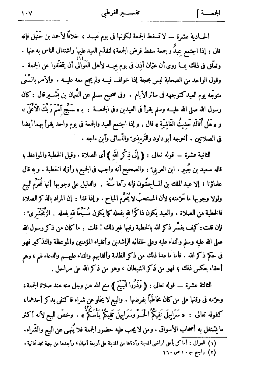 الْحَادِيَةَ عَشْرَةَ- لَا تَسْقُطُ الْجُمُعَةُ لِكَوْنِهَا فِي يَوْمِ عِيدٍ، خِلَافًا لِأَحْمَدَ بْنِ حَنْبَلٍ فَإِنَّهُ قَالَ: إِذَا اجْتَمَعَ عِيدٌ وَجُمُعَةٌ سَقَطَ فَرْضُ الْجُمُعَةِ، لِتَقَدُّمِ الْعِيدِ عَلَيْهَا وَاشْتِغَالِ النَّاسِ بِهِ عَنْهَا. وَتَعَلَّقَ فِي ذَلِكَ بِمَا رُوِيَ أَنَّ عُثْمَانَ أَذِنَ فِي يَوْمِ عِيدٍ لِأَهْلِ الْعَوَالِي «١» أَنْ يَتَخَلَّفُوا عَنِ الْجُمُعَةِ. وَقَوْلُ الْوَاحِدِ مِنَ الصَّحَابَةِ لَيْسَ بِحُجَّةٍ إِذَا خُولِفَ فِيهِ وَلَمْ يُجْمَعْ مَعَهُ عَلَيْهِ. وَالْأَمْرُ بِالسَّعْيِ مُتَوَجِّهٌ يَوْمَ الْعِيدِ كَتَوَجُّهِهِ فِي سَائِرِ الْأَيَّامِ. وَفِي صَحِيحِ مُسْلِمٍ عَنِ النُّعْمَانِ بْنِ بَشِيرٍ قَالَ: كَانَ رَسُولُ اللَّهِ صَلَّى اللَّهُ عَلَيْهِ وَسَلَّمَ يقرأ فِي الْعِيدَيْنِ وَفِي الْجُمُعَةِ: بِ سَبِّحِ اسْمَ رَبِّكَ الْأَعْلَى [الأعلى. ١] وهَلْ أَتاكَ حَدِيثُ الْغاشِيَةِ [الْغَاشِيَةِ: ١] قَالَ: وَإِذَا اجْتَمَعَ الْعِيدُ وَالْجُمُعَةُ فِي يَوْمٍ وَاحِدٍ يَقْرَأُ بِهِمَا أَيْضًا فِي الصَّلَاتَيْنِ. أَخْرَجَهُ أَبُو دَاوُدَ وَالتِّرْمِذِيُّ وَالنَّسَائِيُّ وَابْنُ مَاجَهْ. الثَّانِيَةَ عَشْرَةَ- قَوْلُهُ تَعَالَى: (إِلى ذِكْرِ اللَّهِ) أَيِ الصَّلَاةِ. وَقِيلَ الْخُطْبَةُ وَالْمَوَاعِظُ، قَالَهُ سَعِيدُ بْنُ جُبَيْرٍ. ابْنُ الْعَرَبِيِّ: وَالصَّحِيحُ أَنَّهُ وَاجِبٌ فِي الْجَمِيعِ، وَأَوَّلُهُ الْخُطْبَةُ. وَبِهِ قَالَ عُلَمَاؤُنَا، إِلَّا عَبْدَ الْمَلِكِ بْنَ الْمَاجِشُونِ فَإِنَّهُ رَآهَا سُنَّةً. وَالدَّلِيلُ عَلَى وُجُوبِهَا أَنَّهَا تُحَرِّمُ الْبَيْعَ وَلَوْلَا وُجُوبُهَا مَا حَرَّمَتْهُ، لِأَنَّ الْمُسْتَحَبَّ لَا يُحَرِّمُ الْمُبَاحَ. وَإِذَا قُلْنَا: إِنَّ الْمُرَادَ بِالذِّكْرِ الصَّلَاةُ فَالْخُطْبَةُ مِنَ الصَّلَاةِ. وَالْعَبْدُ يَكُونُ ذَاكِرًا لِلَّهِ بِفِعْلِهِ كَمَا يَكُونُ مُسَبِّحًا لِلَّهِ بِفِعْلِهِ. الزَّمَخْشَرِيُّ: فَإِنْ قُلْتَ: كَيْفَ يُفَسَّرُ ذِكْرُ اللَّهِ بِالْخُطْبَةِ وَفِيهَا غَيْرُ ذَلِكَ! قُلْتُ: مَا كَانَ مِنْ ذَكَرَ رَسُولُ اللَّهِ صَلَّى اللَّهُ عَلَيْهِ وَسَلَّمَ وَالثَّنَاءِ عَلَيْهِ وَعَلَى خُلَفَائِهِ الرَّاشِدِينَ وَأَتْقِيَاءِ الْمُؤْمِنِينَ وَالْمَوْعِظَةِ وَالتَّذْكِيرِ فَهُوَ فِي حُكْمِ ذِكْرِ اللَّهِ. فَأَمَّا مَا عَدَا ذَلِكَ مِنْ ذِكْرِ الظَّلَمَةِ وَأَلْقَابِهِمْ وَالثَّنَاءِ عَلَيْهِمْ وَالدُّعَاءِ لَهُمْ، وَهُمْ أَحِقَّاءُ بِعَكْسِ ذَلِكَ، فَهُوَ مِنْ ذِكْرِ الشَّيْطَانِ، وَهُوَ مِنْ ذِكْرِ اللَّهِ عَلَى مَرَاحِلَ. الثَّالِثَةَ عَشْرَةَ- قَوْلُهُ تَعَالَى: (وَذَرُوا الْبَيْعَ) مَنَعَ اللَّهُ عَزَّ وَجَلَّ مِنْهُ عِنْدَ صَلَاةِ الْجُمُعَةِ، وَحَرَّمَهُ فِي وَقْتِهَا عَلَى مَنْ كَانَ مُخَاطَبًا بِفَرْضِهَا. وَالْبَيْعُ لَا يَخْلُو عَنْ شِرَاءٍ فَاكْتَفَى بِذِكْرِ أَحَدِهِمَا، كَقَوْلِهِ تَعَالَى: سَرابِيلَ تَقِيكُمُ الْحَرَّ وَسَرابِيلَ تَقِيكُمْ بَأْسَكُمْ «٢» [النحل ٨١]. وَخَصَّ الْبَيْعَ لِأَنَّهُ أَكْثَرُ مَا يَشْتَغِلُ بِهِ أَصْحَابُ الْأَسْوَاقِ. وَمَنْ لَا يَجِبُ عَلَيْهِ حُضُورُ الجمعة فلا ينهى عن البيع والشراء.