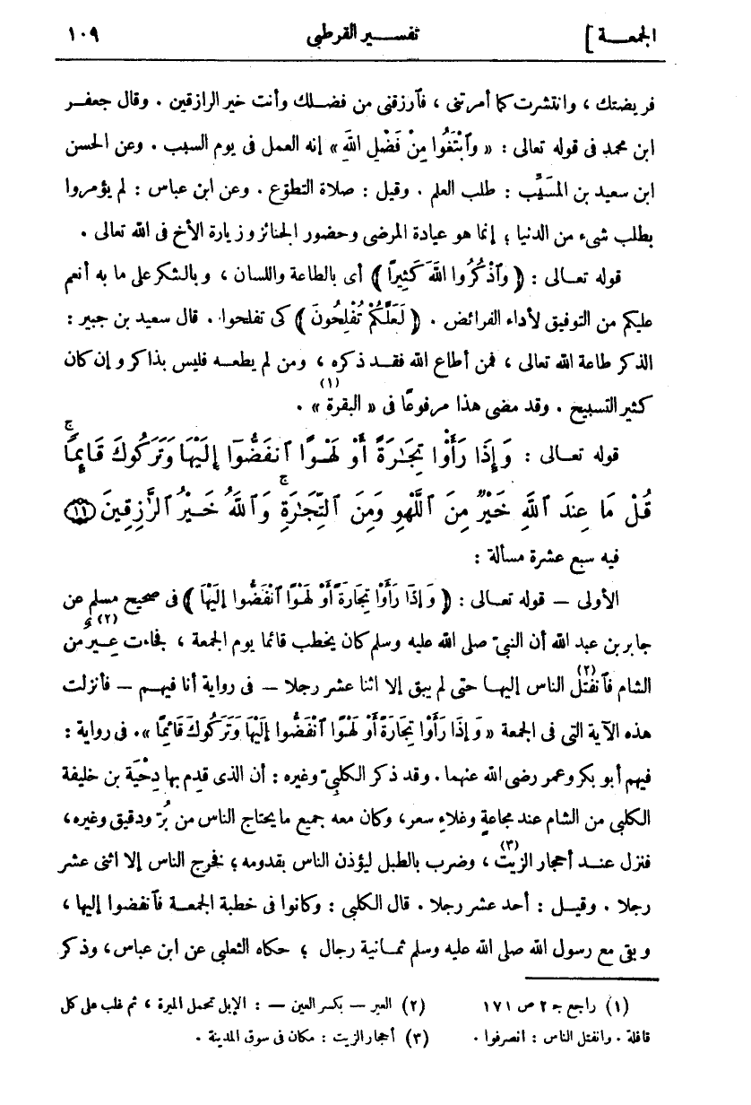 فِيهِ سَبْعَ عَشْرَةَ مَسْأَلَةً: الْأُولَى- قَوْلُهُ تَعَالَى: (وَإِذا رَأَوْا تِجارَةً أَوْ لَهْواً انْفَضُّوا إِلَيْها) فِي صَحِيحِ مُسْلِمٌ عَنْ جَابِرِ بْنِ عَبْدِ اللَّهِ أَنَّ النَّبِيَّ صَلَّى اللَّهُ عَلَيْهِ وَسَلَّمَ كَانَ يَخْطُبُ قَائِمًا يَوْمَ الْجُمُعَةِ، فَجَاءَتْ عِيرٌ «٢» مِنَ الشَّامِ فَانْفَتَلَ «٣» النَّاسُ إِلَيْهَا حَتَّى لَمْ يَبْقَ إِلَّا اثْنَا عَشَرَ رَجُلًا- فِي رِوَايَةٍ أَنَا فِيهِمْ- فَأُنْزِلَتْ هَذِهِ الْآيَةُ الَّتِي فِي الْجُمُعَةِ وَإِذا رَأَوْا تِجارَةً أَوْ لَهْواً انْفَضُّوا إِلَيْها وَتَرَكُوكَ قائِماً. فِي رِوَايَةٍ: فِيهِمْ أَبُو بَكْرٍ وَعُمَرَ رَضِيَ اللَّهُ عَنْهُمَا. وَقَدْ ذَكَرَ الْكَلْبِيُّ وَغَيْرُهُ: أَنَّ الَّذِي قَدِمَ بِهَا دِحْيَةُ بْنُ خَلِيفَةَ الْكَلْبِيُّ مِنَ الشَّامِ عِنْدَ مَجَاعَةٍ وَغَلَاءِ سِعْرٍ، وَكَانَ مَعَهُ جَمِيعُ مَا يَحْتَاجُ النَّاسُ مِنْ بُرٍّ وَدَقِيقٍ وَغَيْرِهِ، فَنَزَلَ عِنْدَ أَحْجَارِ الزَّيْتِ، «٤» وَضَرَبَ بِالطَّبْلِ لِيُؤْذِنَ النَّاسَ بِقُدُومِهِ، فَخَرَجَ النَّاسُ إِلَّا اثْنَيْ عَشَرَ رَجُلًا. وَقِيلَ: أَحَدَ عَشَرَ رَجُلًا. قَالَ الْكَلْبِيُّ: وَكَانُوا فِي خُطْبَةِ الْجُمُعَةِ فَانْفَضُّوا إِلَيْهَا، وَبَقِيَ مَعَ رَسُولِ اللَّهِ صَلَّى اللَّهُ عَلَيْهِ وَسَلَّمَ ثَمَانِيَةَ رِجَالٍ، حكاه الثعلبي عن ابن عباس، وذكر