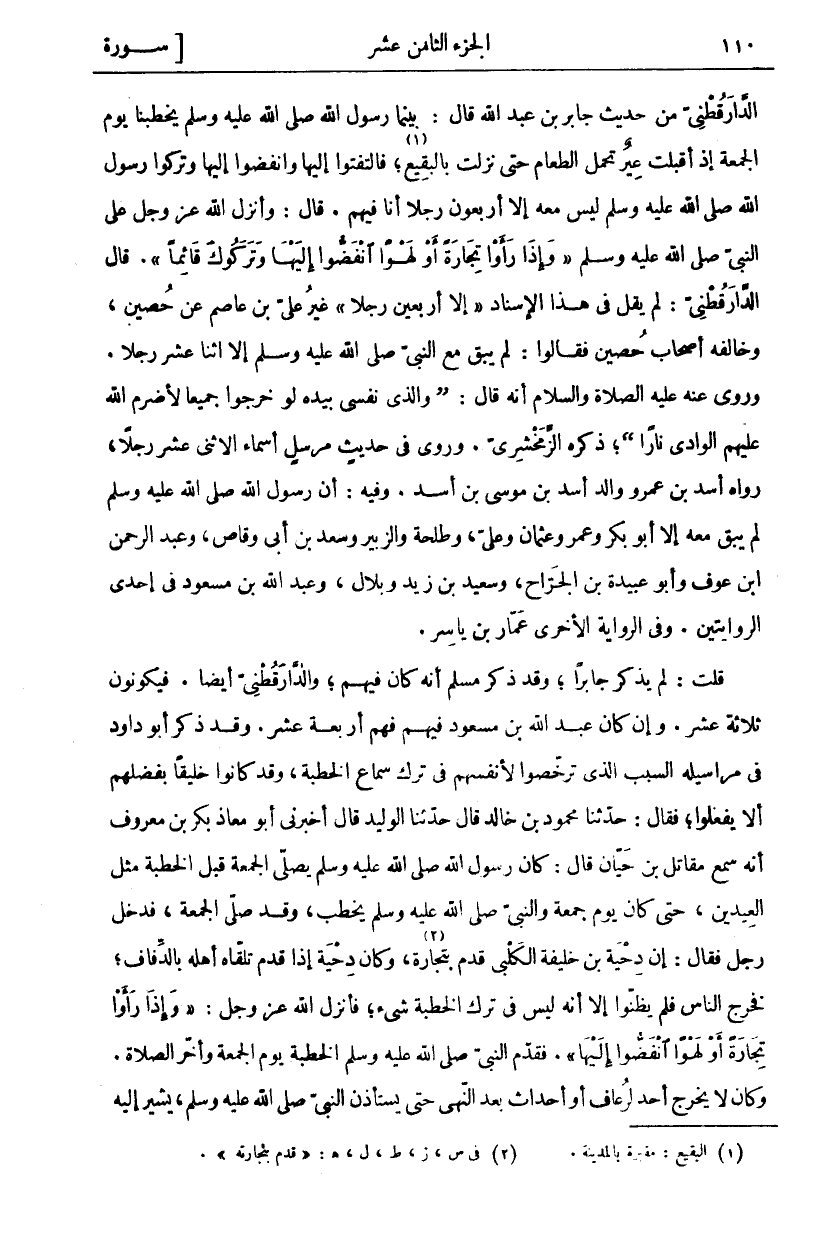 الدَّارَقُطْنِيُّ مِنْ حَدِيثِ جَابِرِ بْنِ عَبْدِ اللَّهِ قَالَ: بَيْنَمَا رَسُولُ اللَّهِ صَلَّى اللَّهُ عَلَيْهِ وَسَلَّمَ يَخْطُبُنَا يَوْمَ الْجُمُعَةِ إِذْ أَقْبَلَتْ عِيرٌ تَحْمِلُ الطَّعَامَ حَتَّى نَزَلَتْ بِالْبَقِيعِ، «١» فَالْتَفَتُوا إِلَيْهَا وانفضوا إلها وَتَرَكُوا رَسُولُ اللَّهِ صَلَّى اللَّهُ عَلَيْهِ وَسَلَّمَ لَيْسَ مَعَهُ إِلَّا أَرْبَعُونَ رَجُلًا أَنَا فِيهِمْ. قَالَ: وَأَنْزَلَ اللَّهُ عَزَّ وَجَلَّ عَلَى النَّبِيِّ صَلَّى اللَّهُ عَلَيْهِ وَسَلَّمَ وَإِذا رَأَوْا تِجارَةً أَوْ لَهْواً انْفَضُّوا إِلَيْها وَتَرَكُوكَ قائِماً). قَالَ الدَّارَقُطْنِيُّ: لَمْ يَقُلْ فِي هَذَا الْإِسْنَادِ" إِلَّا أَرْبَعِينَ رَجُلًا" غَيْرَ عَلِيِّ بْنِ عَاصِمٍ عَنْ حُصَيْنٍ، وَخَالَفَهُ أَصْحَابُ حُصَيْنٍ فَقَالُوا: لَمْ يَبْقَ مَعَ النَّبِيِّ صَلَّى اللَّهُ عَلَيْهِ وَسَلَّمَ إِلَّا اثْنَا عَشَرَ رَجُلًا. وَرُوِيَ عَنْهُ عَلَيْهِ الصَّلَاةُ وَالسَّلَامُ أَنَّهُ قَالَ: (وَالَّذِي نَفْسِي بِيَدِهِ لَوْ خَرَجُوا جَمِيعًا لَأَضْرَمَ اللَّهُ عَلَيْهِمُ الْوَادِي نَارًا)، ذَكَرَهُ الزَّمَخْشَرِيُّ. وَرُوِيَ فِي حَدِيثٍ مُرْسَلٍ أَسْمَاءُ الِاثْنَيْ عَشَرَ رَجُلًا، رَوَاهُ أَسَدُ بْنُ عَمْرٍو وَالِدُ أَسَدِ بْنِ مُوسَى بْنِ أَسَدٍ. وَفِيهِ: أَنَّ رَسُولَ اللَّهِ صَلَّى اللَّهُ عَلَيْهِ وَسَلَّمَ لَمْ يَبْقَ مَعَهُ إِلَّا أَبُو بَكْرٍ وَعُمَرُ وَعُثْمَانُ وَعَلِيٌّ، وَطَلْحَةُ وَالزُّبَيْرُ وَسَعْدُ بْنُ أَبِي وقاص، وعبد الرحمن ابن عَوْفٍ وَأَبُو عُبَيْدَةَ بْنُ الْجَرَّاحِ، وَسَعِيدُ بْنُ زَيْدٍ وَبِلَالٌ، وَعَبْدُ اللَّهِ بْنُ مَسْعُودٍ فِي إِحْدَى الرِّوَايَتَيْنِ. وَفِي الرِّوَايَةِ الْأُخْرَى عَمَّارُ بْنُ يَاسِرٍ. قُلْتُ: لَمْ يَذْكُرْ جَابِرًا، وَقَدْ ذَكَرَ مُسْلِمٌ أَنَّهُ كَانَ فِيهِمْ، وَالدَّارَقُطْنِيُّ أَيْضًا. فَيَكُونُونَ ثَلَاثَةَ عَشَرَ. وَإِنْ كَانَ عَبْدُ اللَّهِ بْنُ مَسْعُودٍ فِيهِمْ فَهُمْ أَرْبَعَةَ عَشَرَ. وَقَدْ ذَكَرَ أَبُو دَاوُدَ فِي مَرَاسِيلِهِ السَّبَبَ الَّذِي تَرَخَّصُوا لِأَنْفُسِهِمْ فِي تَرْكِ سَمَاعِ الْخُطْبَةِ، وَقَدْ كَانُوا خَلِيقًا بِفَضْلِهِمْ أَلَّا يَفْعَلُوا، فَقَالَ: حَدَّثَنَا مَحْمُودُ بْنُ خَالِدٍ قَالَ حَدَّثَنَا الْوَلِيدُ قَالَ أَخْبَرَنِي أَبُو مُعَاذٍ بَكْرُ بْنُ مَعْرُوفٍ أَنَّهُ سَمِعَ مُقَاتِلَ بْنَ حَيَّانَ قَالَ: كَانَ رَسُولُ اللَّهِ صَلَّى اللَّهُ عَلَيْهِ وَسَلَّمَ يُصَلِّي الْجُمُعَةَ قَبْلَ الْخُطْبَةِ مِثْلَ الْعِيدَيْنِ، حَتَّى كَانَ يَوْمُ جُمُعَةٍ وَالنَّبِيُّ صَلَّى اللَّهُ عَلَيْهِ وَسَلَّمَ يَخْطُبُ، وَقَدْ صَلَّى الْجُمُعَةَ، فَدَخَلَ، رَجُلٌ فَقَالَ: إِنَّ دِحْيَةَ بْنَ خَلِيفَةَ الْكَلْبِيَّ قَدِمَ بِتِجَارَةٍ، «٢» وَكَانَ دِحْيَةُ إِذَا قَدِمَ تَلَقَّاهُ أَهْلُهُ بِالدِّفَافِ، فَخَرَجَ النَّاسُ فَلَمْ يَظُنُّوا إِلَّا أَنَّهُ لَيْسَ فِي تَرْكِ الخطبة شي، فَأَنْزَلَ اللَّهُ عَزَّ وَجَلَّ: وَإِذا رَأَوْا تِجارَةً أَوْ لَهْواً انْفَضُّوا إِلَيْها. فَقَدَّمَ النَّبِيُّ صَلَّى اللَّهُ عَلَيْهِ وَسَلَّمَ الْخُطْبَةَ يَوْمَ الْجُمُعَةِ وَأَخَّرَ الصَّلَاةَ. وَكَانَ لَا يَخْرُجُ أَحَدٌ لِرُعَافٍ أَوْ أَحْدَاثٍ بَعْدَ النَّهْيِ حَتَّى يَسْتَأْذِنَ النَّبِيَّ صَلَّى اللَّهُ عَلَيْهِ وَسَلَّمَ، يشير إليه