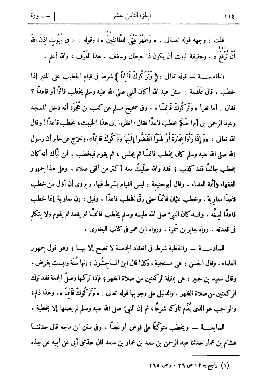 قُلْتُ: وَجْهُهُ قَوْلُهُ تَعَالَى: وَطَهِّرْ بَيْتِيَ لِلطَّائِفِينَ «١» [الحج: ٢٦]، وَقَوْلُهُ: فِي بُيُوتٍ أَذِنَ اللَّهُ أَنْ تُرْفَعَ «٢» [النور: ٣٦ وَحَقِيقَةُ الْبَيْتِ أَنْ يَكُونَ ذَا حِيطَانٍ وَسَقْفٍ. هَذَا الْعُرْفُ، وَاللَّهُ أَعْلَمُ. الْخَامِسَةُ- قَوْلُهُ تَعَالَى: (وَتَرَكُوكَ قائِماً) شَرْطٌ فِي قِيَامِ الْخَطِيبِ عَلَى الْمِنْبَرِ إِذَا خَطَبَ. قَالَ عَلْقَمَةُ: سُئِلَ عَبْدُ اللَّهِ أَكَانَ النَّبِيُّ صَلَّى اللَّهُ عَلَيْهِ وَسَلَّمَ يَخْطُبُ قَائِمًا أَوْ قَاعِدًا؟ فَقَالَ: أَمَا تَقْرَأُ وَتَرَكُوكَ قائِماً. وَفِي صَحِيحِ مُسْلِمٍ عَنْ كَعْبِ بْنِ عُجْرَةَ أَنَّهُ دَخَلَ الْمَسْجِدَ وَعَبْدُ الرَّحْمَنِ بْنُ أُمِّ الْحَكَمِ يَخْطُبُ قَاعِدًا فَقَالَ: انْظُرُوا إِلَى هَذَا الْخَبِيثِ، يَخْطُبُ قَاعِدًا وَقَالَ اللَّهُ تَعَالَى: وَإِذا رَأَوْا تِجارَةً أَوْ لَهْواً انْفَضُّوا إِلَيْها وَتَرَكُوكَ قائِماً. وَخَرَّجَ عَنْ جَابِرٍ أَنَّ رَسُولَ اللَّهِ صَلَّى اللَّهُ عَلَيْهِ وَسَلَّمَ كان يَخْطُبُ قَائِمًا ثُمَّ يَجْلِسُ، ثُمَّ يَقُومُ فَيَخْطُبُ، فَمَنْ نَبَّأَكَ أَنَّهُ كَانَ يَخْطُبُ جَالِسًا فَقَدْ كَذَبَ، فَقَدْ وَاللَّهِ صَلَّيْتُ مَعَهُ أَكْثَرَ مِنْ أَلْفَيْ صَلَاةٍ. وَعَلَى هَذَا جُمْهُورُ الْفُقَهَاءِ وَأَئِمَّةُ الْعُلَمَاءِ. وَقَالَ أَبُو حَنِيفَةَ: لَيْسَ الْقِيَامُ بِشَرْطٍ فِيهَا. وَيُرْوَى أَنَّ أَوَّلَ مَنْ خَطَبَ قَاعِدًا مُعَاوِيَةُ. وَخَطَبَ عُثْمَانُ قَائِمًا حَتَّى رَقَّ فَخَطَبَ قَاعِدًا. وَقِيلَ: إِنَّ مُعَاوِيَةَ إِنَّمَا خَطَبَ قَاعِدًا لِسِنِّهِ. وَقَدْ كَانَ النَّبِيُّ صَلَّى اللَّهُ عَلَيْهِ وَسَلَّمَ يَخْطُبُ قَائِمًا ثُمَّ يَقْعُدُ ثُمَّ يَقُومُ وَلَا يَتَكَلَّمُ فِي قَعْدَتِهِ. رَوَاهُ جَابِرُ بْنُ سَمُرَةَ. وَرَوَاهُ ابْنُ عُمَرَ فِي كِتَابِ الْبُخَارِيِّ. السَّادِسَةُ: وَالْخُطْبَةُ شَرْطٌ فِي انْعِقَادِ الْجُمْعَةِ لَا تَصِحُّ إِلَّا بِهَا، وَهُوَ قَوْلُ جُمْهُورِ الْعُلَمَاءِ. وقال الحسن: هي مستحبة. وكذا فال ابْنُ الْمَاجِشُونِ: إِنَّهَا سُنَّةٌ وَلَيْسَتْ بِفَرْضٍ. وَقَالَ سَعِيدُ بْنُ جُبَيْرٍ: هِيَ بِمَنْزِلَةِ الرَّكْعَتَيْنِ مِنْ صَلَاةِ الظُّهْرِ، فَإِذَا تَرَكَهَا وَصَلَّى الْجُمُعَةَ فَقَدْ تَرَكَ الرَّكْعَتَيْنِ مِنْ صَلَاةِ الظُّهْرِ. وَالدَّلِيلُ عَلَى وُجُوبِهَا قَوْلُهُ تَعَالَى: وَتَرَكُوكَ قائِماً. وَهَذَا ذَمٌّ، وَالْوَاجِبُ هُوَ الَّذِي يَذُمُّ تَارِكَهُ شَرْعًا، ثُمَّ إِنَّ النَّبِيَّ صَلَّى اللَّهُ عَلَيْهِ وَسَلَّمَ لَمْ يُصَلِّهَا إِلَّا بِخُطْبَةٍ. السَّابِعَةُ: وَيَخْطُبُ مُتَوَكِّئًا عَلَى قَوْسٍ أَوْ عَصًا. وَفِي سُنَنِ ابْنِ مَاجَهْ قَالَ حَدَّثَنَا هِشَامُ بْنُ عَمَّارٍ حَدَّثَنَا عَبْدُ الرَّحْمَنِ بْنُ سَعْدِ بْنِ عَمَّارِ بْنِ سَعْدٍ قَالَ حَدَّثَنِي أَبِي عَنْ أَبِيهِ عَنْ جَدِّهِ
