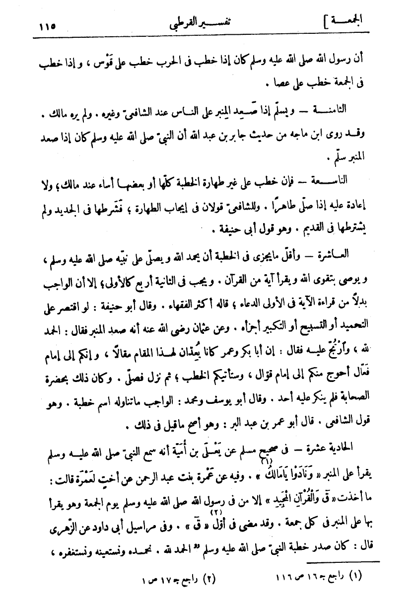 أن رسول الله صَلَّى اللَّهُ عَلَيْهِ وَسَلَّمَ كَانَ إِذَا خَطَبَ فِي الْحَرْبِ خَطَبَ عَلَى قَوْسٍ، وَإِذَا خَطَبَ فِي الْجُمْعَةِ خَطَبَ عَلَى عَصًا. الثَّامِنَةُ: وَيُسَلِّمَ إِذَا صَعِدَ الْمِنْبَرَ عَلَى النَّاسِ عِنْدَ الشَّافِعِيِّ وَغَيْرِهِ. وَلَمْ يَرَهُ مَالِكٌ. وَقَدْ رَوَى ابْنُ مَاجَهْ مِنْ حَدِيثِ جَابِرِ بْنِ عَبْدِ اللَّهِ أَنَّ النَّبِيَّ صَلَّى اللَّهُ عَلَيْهِ وَسَلَّمَ كَانَ إِذَا صَعِدَ الْمِنْبَرَ سَلَّمَ. التَّاسِعَةُ: فَإِنْ خَطَبَ عَلَى غَيْرِ طَهَارَةٍ الْخُطْبَةَ كُلَّهَا أَوْ بَعْضَهَا أَسَاءَ عِنْدَ مَالِكٍ، وَلَا إِعَادَةَ عَلَيْهِ إِذَا صَلَّى طَاهِرًا. وَلِلشَّافِعِيِّ قَوْلَانِ فِي إِيجَابِ الطَّهَارَةِ، فَشَرَطَهَا فِي الْجَدِيدِ وَلَمْ يَشْتَرِطْهَا فِي الْقَدِيمِ. وَهُوَ قَوْلُ أَبِي حَنِيفَةَ. الْعَاشِرَةُ: وَأَقَلُّ مَا يَجْزِي فِي الْخُطْبَةِ أَنْ يَحْمَدَ اللَّهَ وَيُصَلِّيَ عَلَى نَبِيِّهِ صَلَّى اللَّهُ عَلَيْهِ وَسَلَّمَ، وَيُوصِي بِتَقْوَى اللَّهِ وَيَقْرَأُ آيَةً مِنَ الْقُرْآنِ. وَيَجِبُ فِي الثَّانِيَةِ أَرْبَعٌ كَالْأُولَى، إِلَّا أَنَّ الْوَاجِبَ بَدَلًا مِنْ قِرَاءَةِ الْآيَةِ في الاولى الدعاء، قال أَكْثَرُ الْفُقَهَاءِ. وَقَالَ أَبُو حَنِيفَةَ: لَوِ اقْتَصَرَ عَلَى التَّحْمِيدِ أَوِ التَّسْبِيحِ أَوِ التَّكْبِيرِ أَجْزَأَهُ. وَعَنْ عُثْمَانَ رَضِيَ اللَّهُ عَنْهُ أَنَّهُ صَعِدَ الْمِنْبَرَ فَقَالَ: الْحَمْدُ لِلَّهِ، وَارْتُجَّ عَلَيْهِ فَقَالَ: إِنَّ أَبَا بَكْرٍ وَعُمَرَ كَانَا يَعُدَّانِ لِهَذَا الْمَقَامِ مَقَالًا، وَإِنَّكُمْ إِلَى إِمَامٍ فَعَّالٍ أَحْوَجُ مِنْكُمْ إِلَى إِمَامٍ قَوَّالٍ، وَسَتَأْتِيكُمُ الْخُطَبُ، ثُمَّ نَزَلَ فَصَلَّى. وَكَانَ ذَلِكَ بِحَضْرَةِ الصَّحَابَةِ فَلَمْ يُنْكِرْ عَلَيْهِ أَحَدٌ. وَقَالَ أَبُو يُوسُفَ وَمُحَمَّدٌ: الْوَاجِبُ مَا تَنَاوَلَهُ اسْمُ خُطْبَةٍ. وَهُوَ قَوْلُ الشَّافِعِيِّ. قَالَ أَبُو عُمَرَ بْنُ عَبْدِ الْبَرِّ: وَهُوَ أَصَحُّ مَا قِيلَ فِي ذَلِكَ. الْحَادِيَةَ عَشْرَةَ: فِي صَحِيحِ مُسْلِمٍ عَنْ يَعْلَى بْنِ أُمَيَّةَ أَنَّهُ سَمِعَ النَّبِيَّ صَلَّى اللَّهُ عَلَيْهِ وَسَلَّمَ يَقْرَأُ عَلَى الْمِنْبَرِ وَنادَوْا يَا مالِكُ «١» [الزخرف: ٧٧]. وَفِيهِ عَنْ عَمْرَةَ بِنْتِ عَبْدِ الرَّحْمَنِ عَنْ أُخْتٍ لِعَمْرَةَ قَالَتْ: مَا أَخَذَتُ ق وَالْقُرْآنِ الْمَجِيدِ [ق: ١] إِلَّا مِنْ فِي رَسُولِ اللَّهِ صَلَّى اللَّهُ عَلَيْهِ وَسَلَّمَ يَوْمَ الْجُمُعَةِ وَهُوَ يَقْرَأُ بِهَا عَلَى الْمِنْبَرِ فِي كُلِّ جُمُعَةٍ. وَقَدْ مَضَى فِي أَوَّلِ «٢» " ق". وَفِي مَرَاسِيلِ أَبِي دَاوُدَ عَنِ الزُّهْرِيِّ قَالَ: كَانَ صَدْرُ خُطْبَةِ النَّبِيِّ صَلَّى اللَّهُ عَلَيْهِ وَسَلَّمَ (الْحَمْدُ لِلَّهِ. نَحْمَدُهُ ونستعينه ونستغفره،