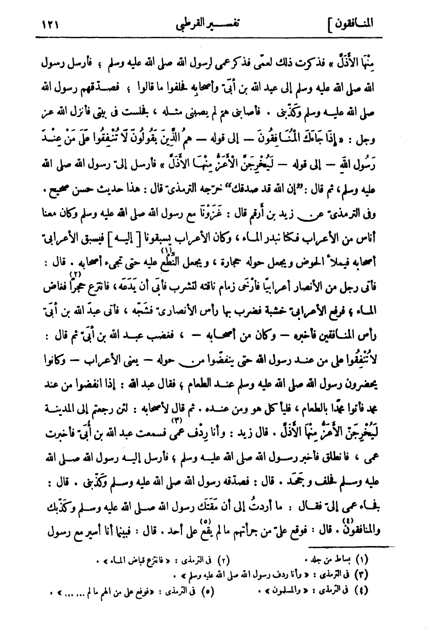 فَذَكَرْتُ ذَلِكَ لِعَمِّي فَذَكَرَ عَمِّي لِرَسُولِ اللَّهِ صَلَّى اللَّهُ عَلَيْهِ وَسَلَّمَ، فَأَرْسَلَ رَسُولُ اللَّهِ صَلَّى اللَّهُ عَلَيْهِ وَسَلَّمَ إِلَى عَبْدِ اللَّهِ بْنِ أُبَيٍّ وَأَصْحَابِهِ فَحَلَفُوا مَا قَالُوا، فَصَدَّقَهُمْ رَسُولُ اللَّهِ صَلَّى اللَّهُ عَلَيْهِ وَسَلَّمَ وَكَذَّبَنِي. فَأَصَابَنِي هَمٌّ لَمْ يُصِبْنِي مِثْلُهُ، فَجَلَسْتُ فِي بَيْتِي فَأَنْزَلَ اللَّهُ عَزَّ وَجَلَّ: إِذا جاءَكَ الْمُنافِقُونَ- إِلَى قَوْلِهِ- هُمُ الَّذِينَ يَقُولُونَ لَا تُنْفِقُوا عَلى مَنْ عِنْدَ رَسُولِ اللَّهِ- إِلَى قَوْلِهِ- لَيُخْرِجَنَّ الْأَعَزُّ مِنْهَا الْأَذَلَّ" فَأَرْسَلَ إِلَى رَسُولِ اللَّهِ صَلَّى اللَّهُ عَلَيْهِ وَسَلَّمَ، ثُمَّ قَالَ: (إِنَّ اللَّهَ قَدْ صَدَّقَكَ) خَرَّجَهُ التِّرْمِذِيُّ قَالَ: هَذَا حَدِيثٌ حَسَنٌ صَحِيحٌ. وَفِي التِّرْمِذِيِّ عَنْ زَيْدِ بْنِ أَرْقَمَ قَالَ: غَزَوْنَا مَعَ رَسُولِ اللَّهِ صَلَّى اللَّهُ عَلَيْهِ وَسَلَّمَ وَكَانَ مَعَنَا أُنَاسٌ مِنَ الْأَعْرَابِ فَكُنَّا نبد الْمَاءَ، وَكَانَ الْأَعْرَابُ يَسْبِقُونَا إِلَيْهِ فَيَسْبِقُ الْأَعْرَابِيُّ أَصْحَابَهُ فَيَمْلَأُ الْحَوْضَ وَيَجْعَلُ حَوْلَهُ حِجَارَةً، وَيَجْعَلُ النطع «١» عليه حتى تجئ أَصْحَابُهُ. قَالَ: فَأَتَى رَجُلٌ مِنَ الْأَنْصَارِ أَعْرَابِيًّا فَأَرْخَى زِمَامَ نَاقَتِهِ لِتَشْرَبَ فَأَبَى أَنْ يَدَعَهُ، فَانْتَزَعَ حَجَرًا «٢» فَغَاضَ الْمَاءُ، فَرَفَعَ الْأَعْرَابِيُّ خَشَبَةً فَضَرَبَ بِهَا رَأْسَ الْأَنْصَارِيِّ فَشَجَّهُ، فَأَتَى عَبْدَ اللَّهِ بْنَ أُبَيٍّ رَأْسَ الْمُنَافِقِينَ فَأَخْبَرَهُ- وَكَانَ مِنْ أَصْحَابِهِ- فَغَضِبَ عَبْدُ اللَّهِ بْنُ أُبَيٍّ ثُمَّ قَالَ: لَا تُنْفِقُوا عَلَى مَنْ عِنْدَ رَسُولِ اللَّهِ حَتَّى يَنْفَضُّوا مِنْ حَوْلِهِ- يَعْنِي الْأَعْرَابَ- وَكَانُوا يَحْضُرُونَ رَسُولُ اللَّهِ صَلَّى اللَّهُ عَلَيْهِ وَسَلَّمَ عِنْدَ الطَّعَامِ، فَقَالَ عَبْدُ اللَّهِ: إِذَا انْفَضُّوا مِنْ عِنْدِ مُحَمَّدٍ فَأْتُوا مُحَمَّدًا بِالطَّعَامِ، فَلْيَأْكُلْ هُوَ وَمَنْ عِنْدَهُ. ثُمَّ قَالَ لِأَصْحَابِهِ: لَئِنْ رَجَعْتُمْ إِلَى الْمَدِينَةِ لَيُخْرِجَنَّ الْأَعَزُّ مِنْهَا الْأَذَلَّ. قَالَ زَيْدٌ: وَأَنَا رِدْفُ «٣» عَمِّي فَسَمِعْتُ عَبْدَ اللَّهِ بْنَ أُبَيٍّ فَأَخْبَرْتُ عَمِّي، فَانْطَلَقَ فَأَخْبَرَ رَسُولِ اللَّهِ صَلَّى اللَّهُ عَلَيْهِ وَسَلَّمَ، فَأَرْسَلَ إِلَيْهِ رَسُولُ اللَّهِ صَلَّى اللَّهُ عَلَيْهِ وَسَلَّمَ فَحَلَفَ وَجَحَدَ. قَالَ: فَصَدَّقَهُ رَسُولُ اللَّهِ صَلَّى اللَّهُ عَلَيْهِ وَسَلَّمَ وَكَذَّبَنِي. قَالَ: فَجَاءَ عَمِّي إِلَيَّ فَقَالَ: مَا أَرَدْتَ إِلَى أَنْ مَقَتَكَ رَسُولُ اللَّهِ صَلَّى اللَّهُ عَلَيْهِ وَسَلَّمَ وَكَذَّبَكَ وَالْمُنَافِقُونَ «٤». قَالَ: فَوَقَعَ عَلَيَّ مِنْ جُرْأَتِهِمْ مَا لَمْ يَقَعْ «٥» عَلَى أَحَدٍ. قَالَ: فبينما أنا أسير مع رسول