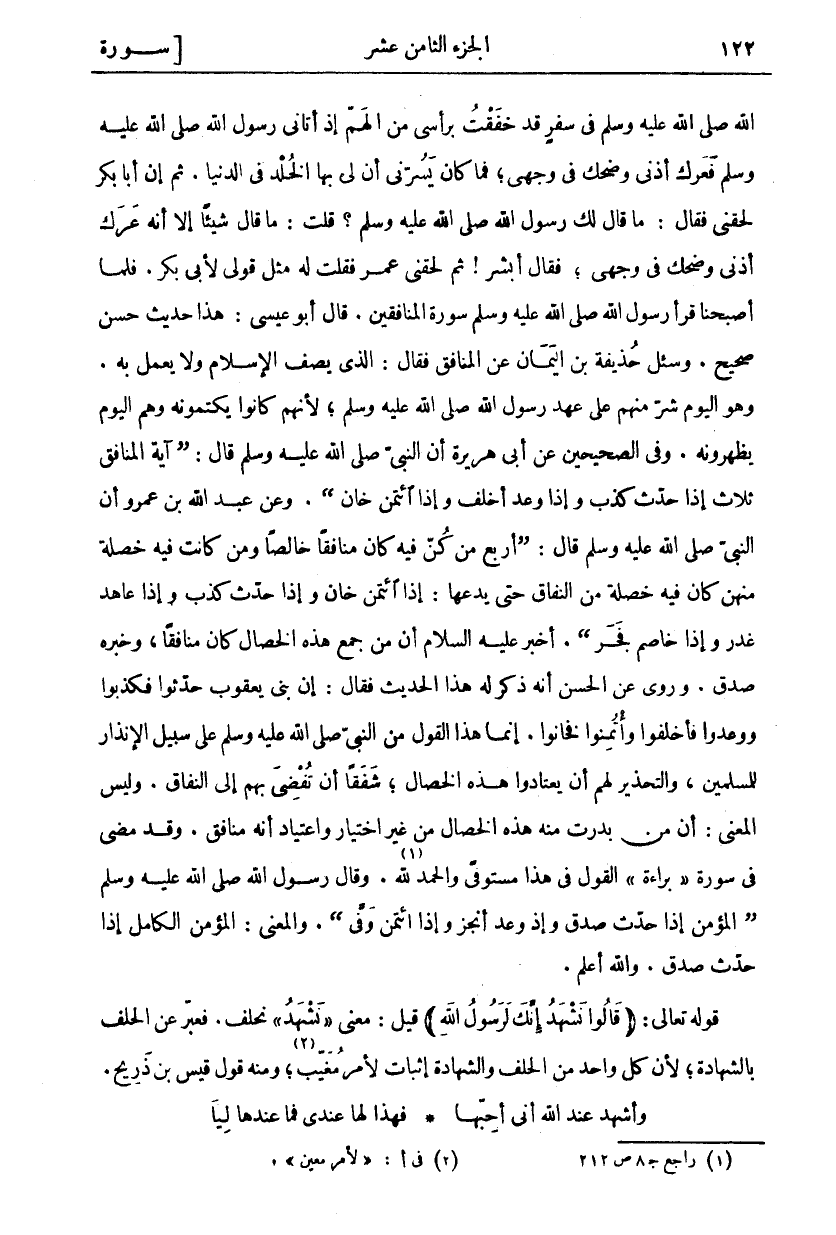 اللَّهِ صَلَّى اللَّهُ عَلَيْهِ وَسَلَّمَ فِي سَفَرٍ قد خفقت بِرَأْسِي مِنَ الْهَمِّ إِذْ أَتَانِي رَسُولُ اللَّهِ صَلَّى اللَّهُ عَلَيْهِ وَسَلَّمَ فَعَرَكَ أُذُنِي وَضَحِكَ فِي وَجْهِي، فَمَا كَانَ يَسُرُّنِي أَنَّ لِي بِهَا الْخُلْدَ فِي الدُّنْيَا. ثُمَّ إِنَّ أَبَا بَكْرٍ لَحِقَنِي فَقَالَ: مَا قَالَ لَكَ رَسُولِ اللَّهِ صَلَّى اللَّهُ عَلَيْهِ وَسَلَّمَ قُلْتُ: مَا قَالَ شَيْئًا إِلَّا أَنَّهُ عَرَكَ أُذُنِي وَضَحِكَ فِي وَجْهِي، فَقَالَ أَبْشِرْ! ثُمَّ لَحِقَنِي عُمَرُ فَقُلْتُ لَهُ مِثْلَ قَوْلِي لِأَبِي بَكْرٍ. فَلَمَّا أَصْبَحْنَا قَرَأَ رَسُولُ اللَّهِ صَلَّى اللَّهُ عَلَيْهِ وَسَلَّمَ سُورَةَ الْمُنَافِقِينَ. قَالَ أَبُو عِيسَى: هَذَا حَدِيثٌ حَسَنٌ صَحِيحٌ. وسيل حُذَيْفَةُ بْنُ الْيَمَانِ عَنِ الْمُنَافِقِ، فَقَالَ: الَّذِي يَصِفُ الْإِسْلَامَ وَلَا يَعْمَلُ بِهِ. وَهُوَ الْيَوْمَ شَرٌّ مِنْهُمْ عَلَى عَهْدِ رَسُولِ اللَّهِ صَلَّى اللَّهُ عَلَيْهِ وَسَلَّمَ، لِأَنَّهُمْ كَانُوا يَكْتُمُونَهُ وَهُمُ الْيَوْمَ يُظْهِرُونَهُ. وَفِي الصَّحِيحَيْنِ عَنْ أَبِي هُرَيْرَةَ أَنَّ النَّبِيَّ صَلَّى اللَّهُ عَلَيْهِ وَسَلَّمَ قَالَ: (آيَةُ الْمُنَافِقِ ثَلَاثٌ إِذَا حَدَّثَ كَذَبَ وَإِذَا وَعَدَ أَخْلَفَ وَإِذَا ائتمن خَانَ). وَعَنْ عَبْدِ اللَّهِ بْنِ عَمْرِو أَنَّ النَّبِيَّ صَلَّى اللَّهُ عَلَيْهِ وَسَلَّمَ قَالَ: (أَرْبَعٌ مَنْ كُنَّ فِيهِ كَانَ مُنَافِقًا خَالِصًا وَمَنْ كَانَتْ فِيهِ خَصْلَةٌ مِنْهُنَّ كَانَ فِيهِ خَصْلَةٌ مِنَ النِّفَاقِ حَتَّى يَدَعَهَا: إِذَا ائتمن خَانَ وَإِذَا حَدَّثَ كَذَبَ وَإِذَا عَاهَدَ غَدَرَ وَإِذَا خَاصَمَ فَجَرَ (. أَخْبَرَ عَلَيْهِ السَّلَامُ أَنَّ مَنْ جَمَعَ هَذِهِ الْخِصَالَ كَانَ مُنَافِقًا، وَخَبَرُهُ صِدْقٌ. وَرُوِيَ عَنِ الْحَسَنِ أَنَّهُ ذُكِرَ لَهُ هَذَا الْحَدِيثُ فَقَالَ: إِنَّ بَنِي يَعْقُوبَ حَدَّثُوا فكذبوا ووعدوا فأخلفوا وأتمنوا فَخَانُوا. إِنَّمَا هَذَا الْقَوْلُ مِنَ النَّبِيِّ صَلَّى اللَّهُ عَلَيْهِ وَسَلَّمَ عَلَى سَبِيلِ الْإِنْذَارِ لِلْمُسْلِمِينَ، وَالتَّحْذِيرِ لَهُمْ أَنْ يَعْتَادُوا هَذِهِ الْخِصَالَ، شَفَقًا أَنْ تَقْضِيَ بِهِمْ إِلَى النِّفَاقِ. وَلَيْسَ الْمَعْنَى: أَنَّ مَنْ بَدَرَتْ مِنْهُ هَذِهِ الْخِصَالُ مِنْ غَيْرِ اخْتِيَارٍ وَاعْتِيَادٍ أَنَّهُ مُنَافِقٌ. وَقَدْ مَضَى في سورة" براءة" الْقَوْلُ فِي هَذَا مُسْتَوْفًى وَالْحَمْدُ لِلَّهِ «١». وَقَالَ رَسُولُ اللَّهِ صَلَّى اللَّهُ عَلَيْهِ وَسَلَّمَ (الْمُؤْمِنُ إِذَا حَدَّثَ صَدَقَ وَإِذَا وَعَدَ أَنْجَزَ وَإِذَا ائتمن وَفَّى). وَالْمَعْنَى: الْمُؤْمِنُ الْكَامِلُ إِذَا حَدَّثَ صَدَقَ. وَاللَّهُ أَعْلَمُ. قَوْلُهُ تَعَالَى: (قالُوا نَشْهَدُ إِنَّكَ لَرَسُولُ اللَّهِ) قِيلَ: مَعْنَى نَشْهَدُ نَحْلِفُ. فَعَبَّرَ عَنِ الْحَلِفِ بِالشَّهَادَةِ، لِأَنَّ كُلَّ وَاحِدٍ مِنَ الْحَلِفِ وَالشَّهَادَةِ إِثْبَاتٌ لِأَمْرٍ مُغَيَّبٍ «٢» وَمِنْهُ قَوْلُ قَيْسِ بْنِ ذُرَيْحٍ.