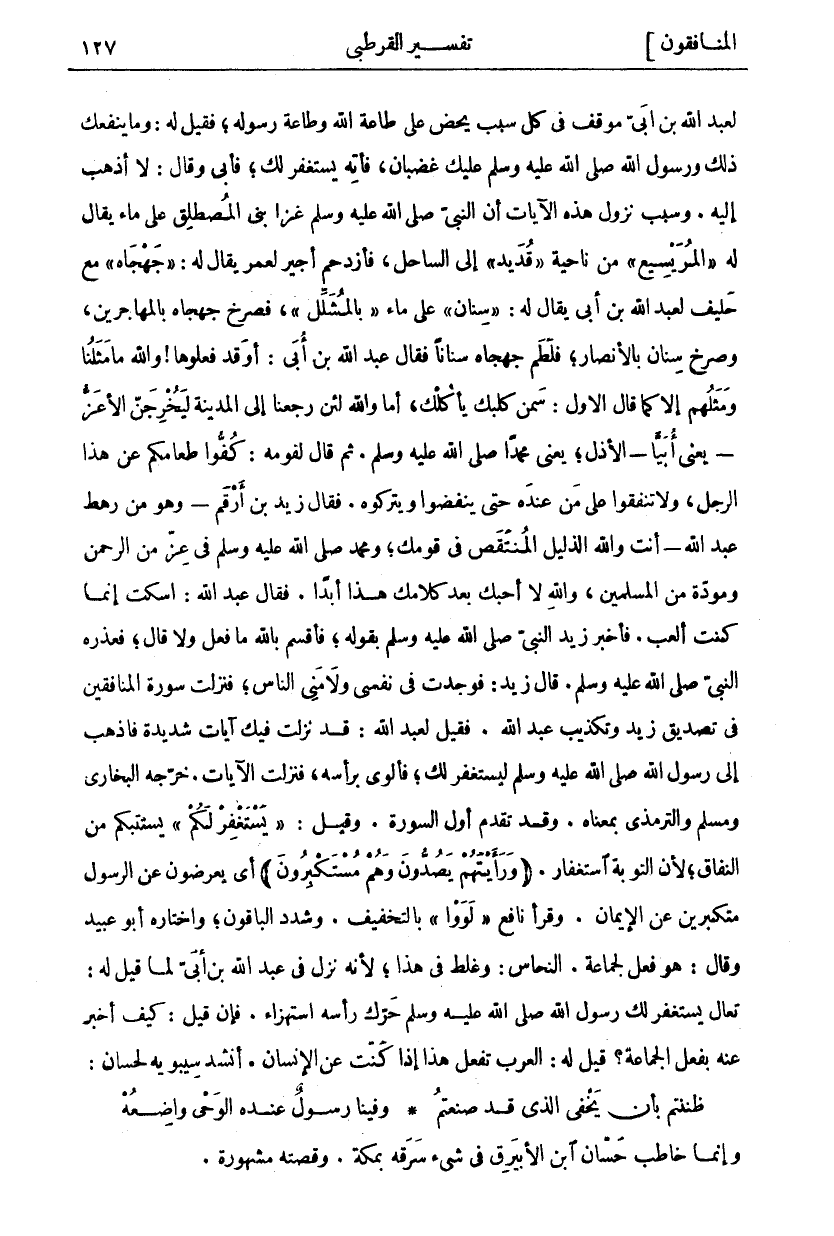 لِعَبْدِ اللَّهِ بْنِ أُبَيٍّ مَوْقِفٌ فِي كُلِّ سَبَبٍ يَحُضُّ عَلَى طَاعَةِ اللَّهِ وَطَاعَةِ رَسُولِهِ، فَقِيلَ لَهُ: وَمَا يَنْفَعُكَ ذَلِكَ وَرَسُولُ اللَّهِ صَلَّى اللَّهُ عَلَيْهِ وَسَلَّمَ غَضْبَانٌ: فَأْتِهِ يَسْتَغْفِرْ لَكَ، فَأَبَى وَقَالَ: لَا أَذْهَبُ إِلَيْهِ. وَسَبَبُ نُزُولِ هَذِهِ الْآيَاتِ أَنَّ النَّبِيَّ صَلَّى اللَّهُ عَلَيْهِ وَسَلَّمَ غَزَا بَنِي الْمُصْطَلِقِ عَلَى مَاءٍ يُقَالُ لَهُ" الْمُرَيْسِيعُ" مِنْ نَاحِيَةِ" قُدَيْدٍ" إِلَى السَّاحِلِ، فَازْدَحَمَ أَجِيرٌ لِعُمَرَ يُقَالُ لَهُ:" جَهْجَاهُ" مَعَ حَلِيفٍ لِعَبْدِ اللَّهِ بْنِ أُبَيٍّ يُقَالُ لَهُ:" سِنَانٌ" عَلَى مَاءٍ" بِالْمُشَلَّلِ"، فَصَرَخَ جَهْجَاهُ بِالْمُهَاجِرِينَ، وَصَرَخَ سِنَانٌ بِالْأَنْصَارِ، فَلَطَمَ جَهْجَاهُ سِنَانًا فقال عبد الله بن أبي: أو قد فَعَلُوهَا! وَاللَّهِ مَا مَثَلُنَا وَمَثَلُهُمْ إِلَّا كَمَا قَالَ الْأَوَّلُ: سَمِّنْ كَلْبَكَ يَأْكُلْكَ، أَمَا وَاللَّهِ لَئِنْ رَجَعْنَا إِلَى الْمَدِينَةِ لَيُخْرِجَنَّ الْأَعَزُّ- يَعْنِي أُبَيًّا- الْأَذَلَّ، يَعْنِي مُحَمَّدًا صَلَّى اللَّهُ عَلَيْهِ وَسَلَّمَ. ثُمَّ قَالَ لِقَوْمِهِ: كُفُّوا طَعَامَكُمْ عَنْ هَذَا الرَّجُلِ، وَلَا تُنْفِقُوا عَلَى مَنْ عِنْدَهُ حَتَّى يَنْفَضُّوا وَيَتْرُكُوهُ. فَقَالَ زَيْدُ بْنُ أَرْقَمَ- وَهُوَ مِنْ رَهْطِ عَبْدِ اللَّهِ- أَنْتَ وَاللَّهِ الذَّلِيلُ الْمُنْتَقَصُ فِي قَوْمِكَ، وَمُحَمَّدٌ صَلَّى اللَّهُ عَلَيْهِ وَسَلَّمَ فِي عِزٍّ مِنَ الرَّحْمَنِ وَمَوَدَّةٍ مِنَ الْمُسْلِمِينَ، وَاللَّهِ لَا أُحِبُّكَ بَعْدَ كَلَامِكَ هَذَا أَبَدًا. فَقَالَ عَبْدُ اللَّهِ: اسْكُتْ إِنَّمَا كُنْتُ أَلْعَبُ. فَأَخْبَرَ زَيْدٌ النَّبِيَّ صَلَّى اللَّهُ عَلَيْهِ وَسَلَّمَ بِقَوْلِهِ: فَأَقْسَمَ بِاللَّهِ مَا فَعَلَ وَلَا قَالَ، فَعَذَرَهُ النَّبِيُّ صَلَّى اللَّهُ عَلَيْهِ وَسَلَّمَ. قال زيد: فوجدت في نفسي ولا مني النَّاسُ، فَنَزَلَتْ سُورَةُ الْمُنَافِقِينَ فِي تَصْدِيقِ زَيْدٍ وَتَكْذِيبِ عَبْدِ اللَّهِ. فَقِيلَ لِعَبْدِ اللَّهِ: قَدْ نَزَلَتْ فِيكَ آيَاتٌ شَدِيدَةٌ فَاذْهَبْ إِلَى رَسُولِ اللَّهِ صَلَّى اللَّهُ عَلَيْهِ وَسَلَّمَ لِيَسْتَغْفِرَ لَكَ، فَأَلْوَى بِرَأْسِهِ، فَنَزَلَتِ الْآيَاتُ. خَرَّجَهُ الْبُخَارِيُّ وَمُسْلِمٌ وَالتِّرْمِذِيُّ بِمَعْنَاهُ. وَقَدْ تَقَدَّمَ أَوَّلَ السُّورَةِ. وَقِيلَ: يَسْتَغْفِرْ لَكُمْ يَسْتَتِبْكُمْ مِنَ النِّفَاقِ، لِأَنَّ التَّوْبَةَ اسْتِغْفَارٌ. (وَرَأَيْتَهُمْ يَصُدُّونَ وَهُمْ مُسْتَكْبِرُونَ) أَيْ يُعْرِضُونَ عَنِ الرَّسُولِ مُتَكَبِّرِينَ عَنِ الْإِيمَانِ. وَقَرَأَ نَافِعٌ" لَوَوْا" بِالتَّخْفِيفِ. وَشَدَّدَ الْبَاقُونَ، وَاخْتَارَهُ أَبُو عُبَيْدٍ وَقَالَ: هُوَ فِعْلٌ لِجَمَاعَةٍ. النَّحَّاسُ: وَغَلِطَ فِي هَذَا، لِأَنَّهُ نَزَلَ فِي عَبْدِ اللَّهِ بْنِ أُبَيٍّ لَمَّا قِيلَ لَهُ: تَعَالَ يَسْتَغْفِرْ لَكَ رَسُولُ اللَّهِ صَلَّى اللَّهُ عَلَيْهِ وَسَلَّمَ حَرَّكَ رَأْسَهُ اسْتِهْزَاءً. فَإِنْ قِيلَ: كَيْفَ أَخْبَرَ عَنْهُ بِفِعْلِ الْجَمَاعَةِ؟ قِيلَ لَهُ: الْعَرَبُ تَفْعَلُ هَذَا إِذَا كَنَّتْ عَنِ الْإِنْسَانِ. أَنْشَدَ سِيبَوَيْهِ لِحَسَّانَ: