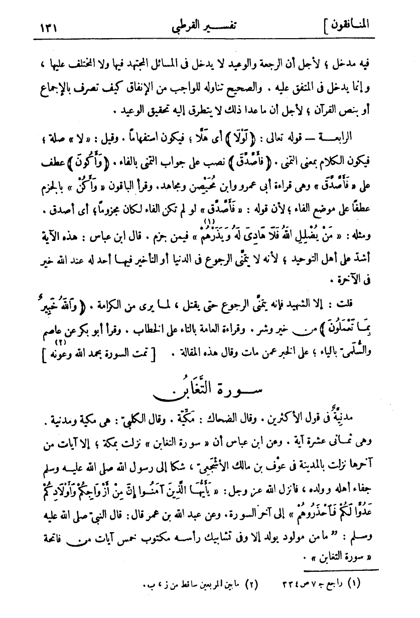 فِيهِ مَدْخَلٌ، لِأَجْلِ أَنَّ الرَّجْعَةَ وَالْوَعِيدَ لَا يَدْخُلُ فِي الْمَسَائِلِ الْمُجْتَهَدِ فِيهَا وَلَا الْمُخْتَلَفِ عَلَيْهَا، وَإِنَّمَا يَدْخُلُ فِي الْمُتَّفَقِ عَلَيْهِ. وَالصَّحِيحُ تَنَاوُلُهُ لِلْوَاجِبِ مِنَ الْإِنْفَاقِ كَيْفَ تُصْرَفُ بِالْإِجْمَاعِ أَوْ بِنَصِّ الْقُرْآنِ، لِأَجْلِ أَنَّ مَا عَدَا ذَلِكَ لَا يَتَطَرَّقُ إِلَيْهِ تَحْقِيقُ الْوَعِيدِ. الرَّابِعَةُ- قوله تعالى: لَوْلا أَيْ هَلَّا، فَيَكُونُ اسْتِفْهَامًا. وَقِيلَ: لَا صِلَةَ، فَيَكُونُ الْكَلَامُ بِمَعْنَى التَّمَنِّي. فَأَصَّدَّقَ نَصْبٌ عَلَى جواب التمني بالفاء. وَأَكُنْ عطف على فَأَصَّدَّقَ وهي قراءة أبى عَمْرٍو وَابْنِ مُحَيْصِنٍ وَمُجَاهِدٍ. وَقَرَأَ الْبَاقُونَ وَأَكُنْ بِالْجَزْمِ عَطْفًا عَلَى مَوْضِعِ الْفَاءِ، لِأَنَّ قَوْلَهُ: فَأَصَّدَّقَ لَوْ لَمْ تَكُنِ الْفَاءُ لَكَانَ مَجْزُومًا، أَيْ أَصَّدَّقَ. وَمِثْلُهُ: مَنْ يُضْلِلِ اللَّهُ فَلا هادِيَ لَهُ وَيَذَرُهُمْ «١» [الأعراف: ١٨٦] فِيمَنْ جَزَمَ. قَالَ ابْنُ عَبَّاسٍ: هَذِهِ الْآيَةُ أَشَدُّ عَلَى أَهْلِ التَّوْحِيدِ، لِأَنَّهُ لَا يَتَمَنَّى الرُّجُوعَ فِي الدُّنْيَا أَوِ التَّأْخِيرَ فِيهَا أَحَدٌ لَهُ عِنْدَ اللَّهِ خَيْرٌ فِي الْآخِرَةِ. قُلْتُ: إِلَّا الشَّهِيدَ فَإِنَّهُ يَتَمَنَّى الرُّجُوعَ حَتَّى يُقْتَلَ، لِمَا يَرَى مِنَ الْكَرَامَةِ. (وَاللَّهُ خَبِيرٌ بِما تَعْمَلُونَ) مِنْ خَيْرٍ وَشَرٍّ. وَقِرَاءَةُ الْعَامَّةِ بِالتَّاءِ عَلَى الْخِطَابِ. وَقَرَأَ أَبُو بَكْرٍ عَنْ عَاصِمٍ وَالسُّلَمِيِّ بِالْيَاءِ، عَلَى الْخَبَرِ عَمَّنْ مَاتَ وَقَالَ هَذِهِ الْمَقَالَةَ." تَمَّتِ السُّورَةُ بِحَمْدِ اللَّهِ وَعَوْنِهِ «٢» "