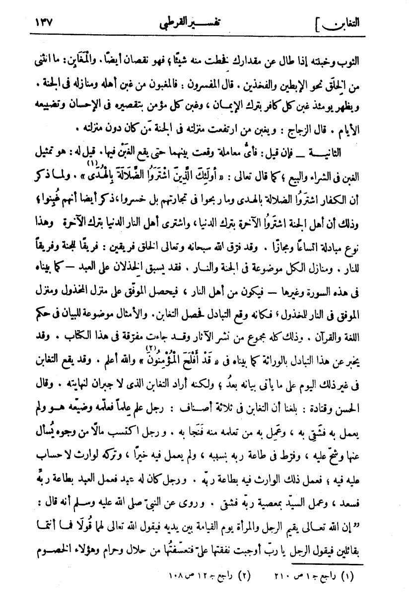 الثَّوْبَ وَخَبَنْتُهُ إِذَا طَالَ عَنْ مِقْدَارِكَ فَخِطْتَ مِنْهُ شَيْئًا، فَهُوَ نُقْصَانٌ أَيْضًا. وَالْمَغَابِنُ: مَا انْثَنَى مِنَ الْخِلَقِ نَحْوَ الْإِبْطَيْنِ وَالْفَخِذَيْنِ. قَالَ الْمُفَسِّرُونَ: فَالْمَغْبُونُ مَنْ غُبِنَ أَهْلُهُ وَمَنَازِلُهُ فِي الْجَنَّةِ وَيَظْهَرُ يَوْمَئِذٍ غَبْنُ كُلِّ كَافِرٍ بِتَرْكِ الْإِيمَانِ، وَغَبْنُ كُلِّ مُؤْمِنٍ بِتَقْصِيرِهِ فِي الْإِحْسَانِ وَتَضْيِيعِهِ الْأَيَّامَ. قَالَ الزَّجَّاجُ: وَيَغْبِنُ مَنِ ارْتَفَعَتْ مَنْزِلَتُهُ فِي الْجَنَّةِ مَنْ كَانَ دُونَ مَنْزِلَتِهِ. الثَّانِيَةُ- فَإِنْ قِيلَ: فَأَيُّ مُعَامَلَةٍ وَقَعَتْ بَيْنَهُمَا حَتَّى يَقَعَ الْغَبْنُ فِيهَا. قِيلَ لَهُ: هُوَ تَمْثِيلُ الْغَبْنِ فِي الشِّرَاءِ وَالْبَيْعِ، كَمَا قَالَ تَعَالَى: أُولئِكَ الَّذِينَ اشْتَرَوُا الضَّلالَةَ بِالْهُدى «١» [البقرة: ١٦]. وَلَمَّا ذَكَرَ أَنَّ الْكُفَّارَ اشْتَرَوُا الضَّلَالَةَ بِالْهُدَى وما ربحوا في تجارتهم بل خسروا، وذكر أَيْضًا أَنَّهُمْ غُبِنُوا، وَذَلِكَ أَنَّ أَهْلَ الْجَنَّةِ اشْتَرَوُا الْآخِرَةَ بِتَرْكِ الدُّنْيَا، وَاشْتَرَى أَهْلُ النَّارِ الدُّنْيَا بِتَرْكِ الْآخِرَةِ. وَهَذَا نَوْعُ مُبَادَلَةٍ اتِّسَاعًا وَمَجَازًا. وَقَدْ فَرَّقَ اللَّهُ سُبْحَانَهُ وَتَعَالَى الْخَلْقَ فَرِيقَيْنِ: فَرِيقًا لِلْجَنَّةِ وَفَرِيقًا لِلنَّارِ. وَمَنَازِلُ الْكُلِّ مَوْضُوعَةٌ فِي الْجَنَّةِ وَالنَّارِ. فَقَدْ يَسْبِقُ الْخِذْلَانُ عَلَى الْعَبْدِ- كَمَا بَيَّنَّاهُ فِي هَذِهِ السُّورَةِ وَغَيْرِهَا- فَيَكُونُ مِنْ أَهْلِ النَّارِ، فَيَحْصُلُ الْمُوَفَّقُ عَلَى مَنْزِلِ الْمَخْذُولِ وَمَنْزِلُ الْمُوَفَّقِ فِي النَّارِ لِلْمَخْذُولِ، فَكَأَنَّهُ وَقَعَ التَّبَادُلُ فَحَصَلَ التَّغَابُنُ. وَالْأَمْثَالُ مَوْضُوعَةٌ لِلْبَيَانِ فِي حِكَمِ اللُّغَةِ وَالْقُرْآنِ. وَذَلِكَ كُلُّهُ مَجْمُوعٌ مِنْ نَشْرِ الْآثَارِ وَقَدْ جَاءَتْ مُفَرَّقَةً فِي هَذَا الْكِتَابِ. وَقَدْ يُخْبِرُ عَنْ هَذَا التَّبَادُلِ بِالْوِرَاثَةِ كَمَا بَيَّنَّاهُ فِي قَدْ أَفْلَحَ الْمُؤْمِنُونَ «٢» [الْمُؤْمِنُونَ: ١] وَاللَّهُ أَعْلَمُ. وَقَدْ يَقَعُ التَّغَابُنُ فِي غَيْرِ ذَلِكَ الْيَوْمِ عَلَى مَا يَأْتِي بَيَانُهُ بَعْدُ، وَلَكِنَّهُ أَرَادَ التَّغَابُنَ الَّذِي لَا جُبْرَانَ لِنِهَايَتِهِ. وَقَالَ الْحَسَنُ وَقَتَادَةُ: بَلَغَنَا أَنَّ التَّغَابُنَ فِي ثَلَاثَةِ أَصْنَافٍ: رَجُلٌ عَلِمَ عِلْمًا فَعَلَّمَهُ وَضَيَّعَهُ هُوَ وَلَمْ يَعْمَلْ بِهِ فَشَقِيَ بِهِ، وَعَمِلَ بِهِ مَنْ تَعَلَّمَهُ مِنْهُ فَنَجَا بِهِ. وَرَجُلٌ اكْتَسَبَ مَالًا مِنْ وُجُوهٍ يُسْأَلُ عَنْهَا وَشَحَّ عَلَيْهِ، وَفَرَّطَ فِي طَاعَةِ رَبِّهِ بِسَبَبِهِ، وَلَمْ يَعْمَلْ فِيهِ خَيْرًا، وَتَرَكَهُ لِوَارِثٍ لَا حِسَابَ عَلَيْهِ فِيهِ، فَعَمِلَ ذَلِكَ الْوَارِثُ فِيهِ بِطَاعَةِ رَبِّهِ. وَرَجُلٌ كَانَ لَهُ عَبْدٌ فَعَمِلَ الْعَبْدُ بِطَاعَةِ رَبِّهِ فَسَعِدَ، وَعَمِلَ السَّيِّدُ بِمَعْصِيَةِ وبه فَشَقِيَ. وَرُوِيَ عَنِ النَّبِيِّ صَلَّى اللَّهُ عَلَيْهِ وَسَلَّمَ أَنَّهُ قَالَ: (إِنَّ اللَّهَ تَعَالَى يُقِيمُ الرَّجُلَ وَالْمَرْأَةَ يَوْمَ الْقِيَامَةِ بَيْنَ يَدَيْهِ فَيَقُولُ اللَّهُ تَعَالَى لَهُمَا قَوْلًا فَمَا أَنْتُمَا بِقَائِلِينَ فَيَقُولُ الرَّجُلُ يَا رَبِّ أَوْجَبْتَ نَفَقَتَهَا عَلَيَّ فتعسفتها من حلال وحرام وهؤلاء الخصوم
