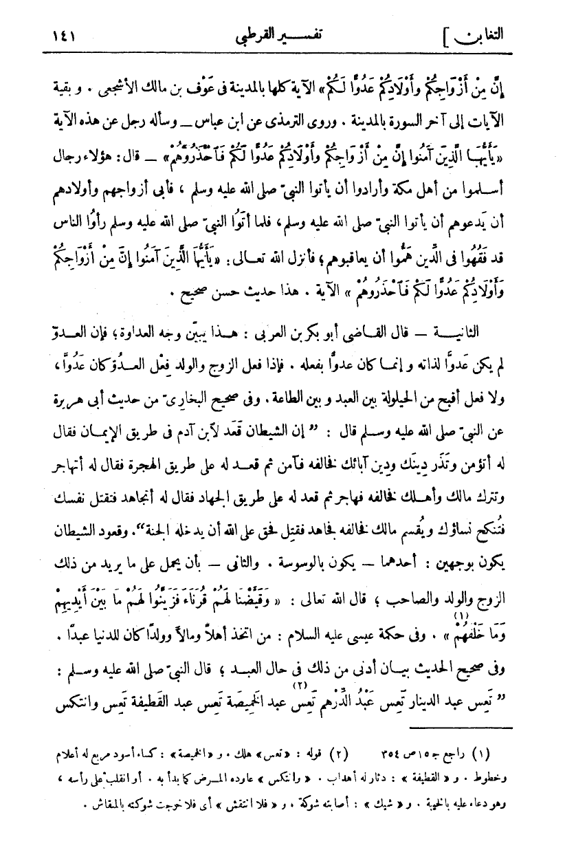 الْآيَةُ كُلُّهَا بِالْمَدِينَةِ فِي عَوْفِ بْنِ مَالِكٍ الْأَشْجَعِيِّ. وَبَقِيَّةُ الْآيَاتِ إِلَى آخِرِ السُّورَةِ بِالْمَدِينَةِ. وَرَوَى التِّرْمِذِيُّ عَنِ ابْنِ عَبَّاسٍ- وَسَأَلَهُ رَجُلٌ عَنْ هَذِهِ الْآيَةِ يَا أَيُّهَا الَّذِينَ آمَنُوا إِنَّ مِنْ أَزْواجِكُمْ وَأَوْلادِكُمْ عَدُوًّا لَكُمْ فَاحْذَرُوهُمْ- قَالَ: هَؤُلَاءِ رِجَالٌ أَسْلَمُوا مِنْ أَهْلِ مَكَّةَ وَأَرَادُوا أَنْ يَأْتُوا النَّبِيَّ صَلَّى اللَّهُ عَلَيْهِ وَسَلَّمَ، فَأَبَى أَزْوَاجُهُمْ وَأَوْلَادُهُمْ أَنْ يَدَعُوهُمْ أَنْ يَأْتُوا النَّبِيَّ صَلَّى اللَّهُ عَلَيْهِ وَسَلَّمَ، فَلَمَّا أَتَوُا النَّبِيَّ صَلَّى اللَّهُ عَلَيْهِ وَسَلَّمَ رَأَوُا النَّاسَ قَدْ فَقِهُوا فِي الدِّينِ هَمُّوا أَنْ يُعَاقِبُوهُمْ، فَأَنْزَلَ اللَّهُ تَعَالَى: يَا أَيُّهَا الَّذِينَ آمَنُوا إِنَّ مِنْ أَزْواجِكُمْ وَأَوْلادِكُمْ عَدُوًّا لَكُمْ فَاحْذَرُوهُمْ الْآيَةَ. هَذَا حَدِيثٌ حَسَنٌ صَحِيحٌ. الثَّانِيَةُ- قَالَ الْقَاضِي أَبُو بَكْرِ بْنُ الْعَرَبِيِّ: هَذَا يُبَيِّنُ وَجْهَ الْعَدَاوَةِ، فَإِنَّ الْعَدُوَّ لَمْ يَكُنْ عَدُوًّا لِذَاتِهِ وَإِنَّمَا كَانَ عَدُوًّا بِفِعْلِهِ. فَإِذَا فَعَلَ الزَّوْجُ وَالْوَلَدُ فِعْلَ الْعَدُوِّ كَانَ عَدُوًّا، وَلَا فِعْلَ أَقْبَحُ مِنَ الْحَيْلُولَةِ بَيْنَ الْعَبْدِ وَبَيْنَ الطَّاعَةِ. وَفِي صَحِيحِ الْبُخَارِيِّ مِنْ حَدِيثُ أَبِي هُرَيْرَةَ عَنِ النَّبِيِّ صَلَّى اللَّهُ عَلَيْهِ وَسَلَّمَ قَالَ: (إِنَّ الشَّيْطَانَ قَعَدَ لِابْنِ آدَمَ فِي طَرِيقِ الْإِيمَانِ فَقَالَ لَهُ أَتُؤْمِنُ وَتَذَرُ دِينَكَ وَدِينَ آبَائِكَ فَخَالَفَهُ فَآمَنَ ثُمَّ قَعَدَ لَهُ عَلَى طَرِيقِ الْهِجْرَةِ فَقَالَ لَهُ أَتُهَاجِرُ وَتَتْرُكُ مَالَكَ وَأَهْلَكَ فَخَالَفَهُ فَهَاجَرَ ثُمَّ قَعَدَ لَهُ عَلَى طَرِيقِ الْجِهَادِ فَقَالَ لَهُ أَتُجَاهِدُ فَتَقْتُلُ نَفْسَكَ فَتُنْكَحُ نِسَاؤُكَ وَيُقْسَمُ مَالُكَ فَخَالَفَهُ فَجَاهَدَ فَقُتِلَ، فَحَقٌّ عَلَى اللَّهِ أَنْ يُدْخِلَهُ الْجَنَّةَ (. وَقُعُودُ الشَّيْطَانِ يَكُونُ بِوَجْهَيْنِ: أَحَدُهُمَا: يَكُونُ بِالْوَسْوَسَةِ. وَالثَّانِي- بِأَنْ يُحْمَلَ عَلَى مَا يُرِيدُ مِنْ ذَلِكَ الزَّوْجِ وَالْوَلَدِ وَالصَّاحِبِ، قَالَ اللَّهُ تَعَالَى: وَقَيَّضْنا لَهُمْ قُرَناءَ فَزَيَّنُوا لَهُمْ مَا بَيْنَ أَيْدِيهِمْ وَما خَلْفَهُمْ «١» [فصلت: ٢٥]. وَفِي حِكْمَةِ عِيسَى عَلَيْهِ السَّلَامُ: مَنِ اتَّخَذَ أَهْلًا وَمَالًا وَوَلَدًا كَانَ لِلدُّنْيَا عَبْدًا. وَفِي صَحِيحِ الْحَدِيثِ بَيَانُ أَدْنَى مِنْ ذَلِكَ فِي حَالِ الْعَبْدِ، قَالَ النَّبِيُّ صَلَّى اللَّهُ عَلَيْهِ وَسَلَّمَ: (تَعِسَ عَبْدُ الدِّينَارِ تَعِسَ عَبْدُ الدِّرْهَمِ تَعِسَ «٢» عَبْدُ الْخَمِيصَةِ تَعِسَ عَبْدُ الْقَطِيفَةِ تَعِسَ وانتكس