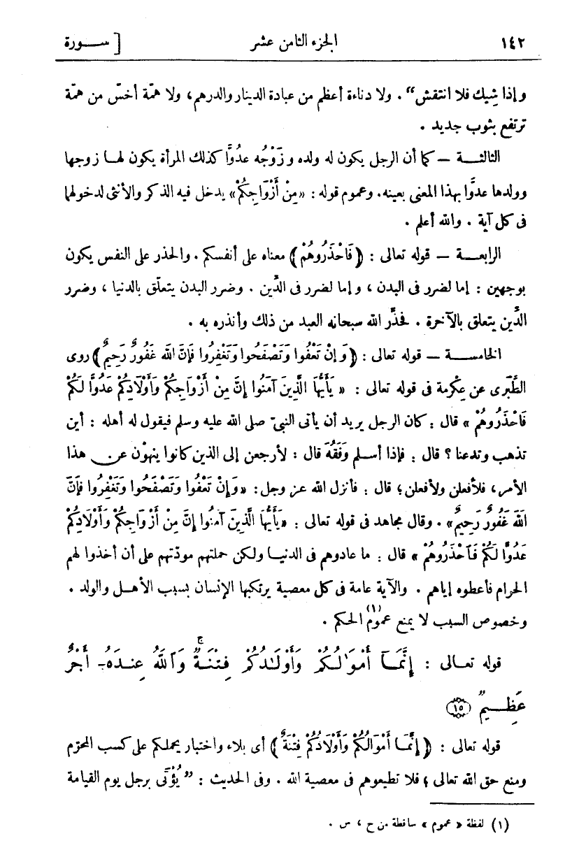 وَإِذَا شِيكَ فَلَا انْتَقَشَ (. وَلَا دَنَاءَةَ أَعْظَمَ مِنْ عِبَادَةِ الدِّينَارِ وَالدِّرْهَمِ، وَلَا هِمَّةَ أَخَسَّ مِنْ هِمَّةٍ تَرْتَفِعُ بِثَوْبٍ جَدِيدٍ. الثَّالِثَةُ- كَمَا أَنَّ الرَّجُلَ يَكُونُ لَهُ وَلَدُهُ وَزَوْجُهُ عَدُوًّا كَذَلِكَ الْمَرْأَةُ يَكُونُ لَهَا زَوْجُهَا وَوَلَدُهَا عَدُوًّا بِهَذَا الْمَعْنَى بِعَيْنِهِ. وَعُمُومُ قَوْلِهِ: مِنْ أَزْواجِكُمْ يَدْخُلُ فِيهِ الذَّكَرُ وَالْأُنْثَى لِدُخُولِهِمَا فِي كُلِّ آيَةٍ. وَاللَّهُ أَعْلَمُ. الرَّابِعَةُ- قَوْلُهُ تَعَالَى: (فَاحْذَرُوهُمْ) مَعْنَاهُ عَلَى أَنْفُسِكُمْ. وَالْحَذَرُ عَلَى النَّفْسِ يَكُونُ بِوَجْهَيْنِ: إِمَّا لِضَرَرٍ فِي الْبَدَنِ، وَإِمَّا لِضَرَرٍ فِي الدِّينِ. وَضَرَرُ الْبَدَنِ يَتَعَلَّقُ بِالدُّنْيَا، وَضَرَرُ الدِّينِ يَتَعَلَّقُ بِالْآخِرَةِ. فَحَذَّرَ اللَّهُ سُبْحَانَهُ الْعَبْدَ مِنْ ذَلِكَ وَأَنْذَرَهُ بِهِ. الْخَامِسَةُ- قَوْلُهُ تَعَالَى: (وَإِنْ تَعْفُوا وَتَصْفَحُوا وَتَغْفِرُوا فَإِنَّ اللَّهَ غَفُورٌ رَحِيمٌ) رَوَى الطَّبَرِيُّ عَنْ عِكْرِمَةَ فِي قَوْلِهِ تَعَالَى: يَا أَيُّهَا الَّذِينَ آمَنُوا إِنَّ مِنْ أَزْواجِكُمْ وَأَوْلادِكُمْ عَدُوًّا لَكُمْ فَاحْذَرُوهُمْ قَالَ: كَانَ الرَّجُلُ يُرِيدُ أَنْ يَأْتِيَ النَّبِيَّ صَلَّى اللَّهُ عَلَيْهِ وَسَلَّمَ فَيَقُولُ لَهُ أَهْلُهُ: أَيْنَ تَذْهَبُ وَتَدَعُنَا؟ قَالَ: فَإِذَا أَسْلَمَ وَفَقِهَ قَالَ: لَأَرْجِعَنَّ إِلَى الَّذِينَ كَانُوا يَنْهَوْنَ عَنْ هَذَا الْأَمْرِ، فلا فعلن وَلَأَفْعَلَنَّ، قَالَ: فَأَنْزَلَ اللَّهُ عَزَّ وَجَلَّ: وَإِنْ تَعْفُوا وَتَصْفَحُوا وَتَغْفِرُوا فَإِنَّ اللَّهَ غَفُورٌ رَحِيمٌ. وَقَالَ مُجَاهِدٌ فِي قَوْلِهِ تَعَالَى: يَا أَيُّهَا الَّذِينَ آمَنُوا إِنَّ مِنْ أَزْواجِكُمْ وَأَوْلادِكُمْ عَدُوًّا لَكُمْ فَاحْذَرُوهُمْ قَالَ: مَا عَادُوهُمْ فِي الدُّنْيَا وَلَكِنْ حَمَلَتْهُمْ مَوَدَّتُهُمْ عَلَى أَنْ أَخَذُوا لَهُمُ الْحَرَامَ فَأَعْطَوْهُ إِيَّاهُمْ. وَالْآيَةُ عَامَّةٌ فِي كُلِّ مَعْصِيَةٍ يَرْتَكِبُهَا الْإِنْسَانُ بِسَبَبِ الْأَهْلِ وَالْوَلَدِ. وَخُصُوصُ السبب لا يمنع عموم «١» الحكم.