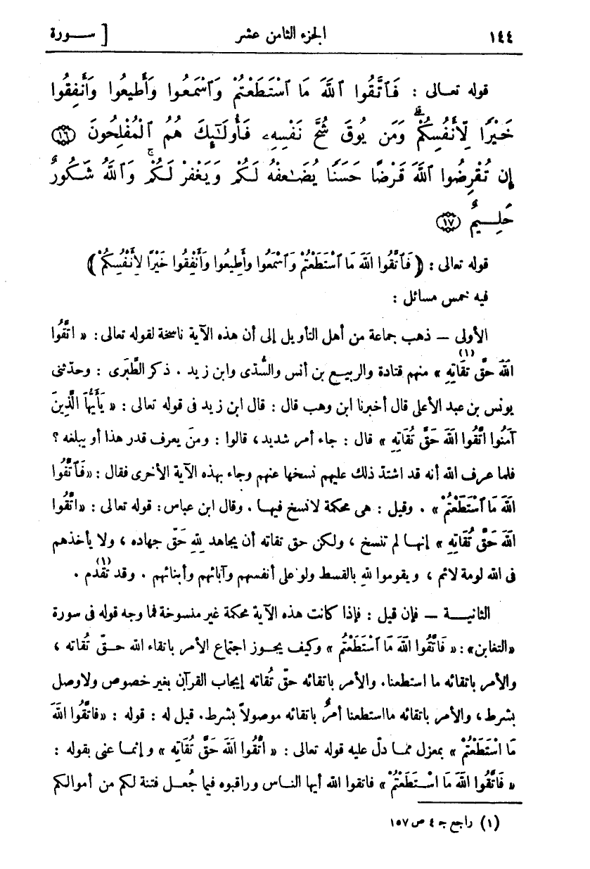 قَوْلُهُ تَعَالَى: (فَاتَّقُوا اللَّهَ مَا اسْتَطَعْتُمْ وَاسْمَعُوا وَأَطِيعُوا وَأَنْفِقُوا خَيْراً لِأَنْفُسِكُمْ) فِيهِ خَمْسُ مَسَائِلَ: الْأُولَى- ذَهَبَ جَمَاعَةٌ مِنْ أَهْلِ التَّأْوِيلِ إِلَى أَنَّ هَذِهِ الْآيَةَ نَاسِخَةٌ لقوله تعالى: اتَّقُوا اللَّهَ حَقَّ تُقاتِهِ «١» [آل عمران: ١٠٢] مِنْهُمْ قَتَادَةُ وَالرَّبِيعُ بْنُ أَنَسٍ وَالسُّدِّيُّ وَابْنُ زَيْدٍ. ذَكَرَ الطَّبَرِيُّ: وَحَدَّثَنِي يُونُسُ بْنُ عَبْدِ الْأَعْلَى قَالَ أَخْبَرَنَا ابْنُ وَهْبٍ قَالَ: قَالَ ابْنُ زَيْدٍ فِي قَوْلِهِ تَعَالَى: يَا أَيُّهَا الَّذِينَ آمَنُوا اتَّقُوا اللَّهَ حَقَّ تُقاتِهِ [آل عمران: ١٠٢] قَالَ: جَاءَ أَمْرٌ شَدِيدٌ، قَالُوا: وَمَنْ يَعْرِفُ قَدْرَ هَذَا أَوْ يَبْلُغُهُ؟ فَلَمَّا عَرَفَ اللَّهُ أَنَّهُ قَدِ اشْتَدَّ ذَلِكَ عَلَيْهِمْ نَسَخَهَا عَنْهُمْ وَجَاءَ بِهَذِهِ الْآيَةِ الْأُخْرَى فَقَالَ: فَاتَّقُوا اللَّهَ مَا اسْتَطَعْتُمْ. وَقِيلَ: هِيَ مُحْكَمَةٌ لَا نَسْخَ فِيهَا. وَقَالَ ابْنُ عَبَّاسٍ: قَوْلُهُ تَعَالَى: اتَّقُوا اللَّهَ حَقَّ تُقاتِهِ [آل عمران: ١٠٢] إِنَّهَا لَمْ تُنْسَخْ، وَلَكِنَّ حَقَّ تُقَاتِهِ أَنْ يُجَاهَدَ لِلَّهِ حَقَّ جِهَادِهِ، وَلَا يَأْخُذَهُمْ فِي اللَّهِ لَوْمَةُ لَائِمٍ، وَيَقُومُوا لِلَّهِ بِالْقِسْطِ وَلَوْ عَلَى أَنْفُسِهِمْ وَآبَائِهِمْ وَأَبْنَائِهِمْ. وَقَدْ تَقَدَّمَ «٢». الثَّانِيَةُ- فَإِنْ قِيلَ: فَإِذَا كَانَتْ هَذِهِ الْآيَةُ مُحْكَمَةٌ غَيْرُ مَنْسُوخَةٍ فَمَا وَجْهُ قَوْلِهِ فِي سُورَةِ التَّغَابُنِ: فَاتَّقُوا اللَّهَ مَا اسْتَطَعْتُمْ وَكَيْفَ يَجُوزُ اجْتِمَاعُ الْأَمْرِ بِاتِّقَاءِ اللَّهِ حَقَّ تُقَاتِهِ وَالْأَمْرُ بِاتِّقَائِهِ مَا اسْتَطَعْنَا. وَالْأَمْرُ بِاتِّقَائِهِ حَقَّ تُقَاتِهِ إِيجَابُ الْقُرْآنِ بِغَيْرِ خُصُوصٍ وَلَا وَصْلَ بِشَرْطٍ، وَالْأَمْرُ بِاتِّقَائِهِ مَا اسْتَطَعْنَا أَمْرٌ بِاتِّقَائِهِ مَوْصُولًا بِشَرْطٍ. قِيلَ لَهُ: قَوْلُهُ: فَاتَّقُوا اللَّهَ مَا اسْتَطَعْتُمْ بِمَعْزِلٍ مِمَّا دَلَّ عَلَيْهِ قَوْلُهُ تَعَالَى: اتَّقُوا اللَّهَ حَقَّ تُقاتِهِ [آل عمران: ١٠٢] وَإِنَّمَا عَنَى بِقَوْلِهِ: فَاتَّقُوا اللَّهَ مَا اسْتَطَعْتُمْ فَاتَّقُوا اللَّهَ أَيُّهَا النَّاسُ وَرَاقِبُوهُ فِيمَا جَعَلَ فتنة لكم من أموالكم