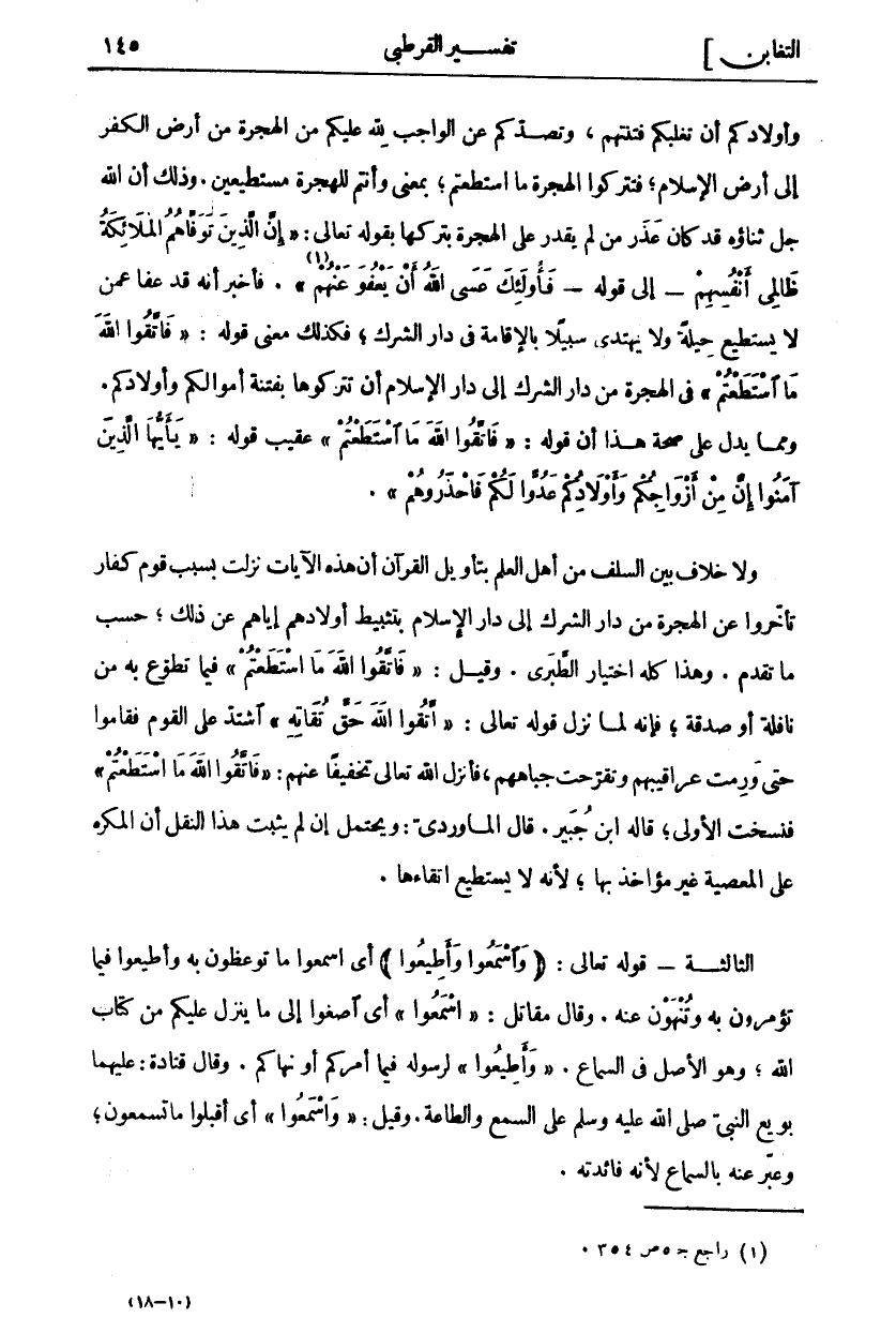 وَأَوْلَادِكُمْ أَنْ تَغْلِبَكُمْ فِتْنَتُهُمْ، وَتَصُدَّكُمْ عَنِ الْوَاجِبِ لِلَّهِ عَلَيْكُمْ مِنَ الْهِجْرَةِ مِنْ أَرْضِ الْكُفْرِ إِلَى أَرْضِ الْإِسْلَامِ، فَتَتْرُكُوا الْهِجْرَةَ مَا اسْتَطَعْتُمْ، بِمَعْنَى وَأَنْتُمْ لِلْهِجْرَةِ مُسْتَطِيعِينَ. وَذَلِكَ أَنَّ اللَّهَ جَلَّ ثَنَاؤُهُ قَدْ كَانَ عَذَرَ مَنْ لَمْ يَقْدِرْ عَلَى الْهِجْرَةِ بِتَرْكِهَا بِقَوْلِهِ تَعَالَى: إِنَّ الَّذِينَ تَوَفَّاهُمُ الْمَلائِكَةُ ظالِمِي أَنْفُسِهِمْ إِلَى قَوْلِهِ فَأُولئِكَ عَسَى اللَّهُ أَنْ يَعْفُوَ عَنْهُمْ «١» [النساء: ٩٩ - ٩٧]. فَأَخْبَرَ أَنَّهُ قَدْ عَفَا عَمَّنْ لَا يَسْتَطِيعُ حِيلَةً وَلَا يَهْتَدِي سَبِيلًا بِالْإِقَامَةِ فِي دَارِ الشِّرْكِ، فَكَذَلِكَ مَعْنَى قَوْلِهِ: فَاتَّقُوا اللَّهَ مَا اسْتَطَعْتُمْ فِي الْهِجْرَةِ مِنْ دَارِ الشِّرْكِ إِلَى دَارِ الْإِسْلَامِ أَنْ تَتْرُكُوهَا بِفِتْنَةِ أَمْوَالِكُمْ وَأَوْلَادِكُمْ. وَمِمَّا يَدُلُّ عَلَى صِحَّةِ هَذَا أَنَّ قَوْلَهُ: فَاتَّقُوا اللَّهَ مَا اسْتَطَعْتُمْ عَقِيبَ قَوْلِهِ: يَا أَيُّهَا الَّذِينَ آمَنُوا إِنَّ مِنْ أَزْواجِكُمْ وَأَوْلادِكُمْ عَدُوًّا لَكُمْ فَاحْذَرُوهُمْ. وَلَا خِلَافَ بَيْنَ السَّلَفِ مِنْ أَهْلِ الْعِلْمِ بِتَأْوِيلِ الْقُرْآنِ أَنَّ هَذِهِ الْآيَاتِ نَزَلَتْ بِسَبَبِ قَوْمٍ كُفَّارٍ تَأَخَّرُوا عَنِ الْهِجْرَةِ مِنْ دَارِ الشِّرْكِ إِلَى دَارِ الْإِسْلَامِ بِتَثْبِيطِ أَوْلَادِهِمْ إِيَّاهُمْ عَنْ ذَلِكَ، حَسْبَ مَا تَقَدَّمَ. وَهَذَا كُلُّهُ اخْتِيَارُ الطَّبَرِيِّ. وَقِيلَ: فَاتَّقُوا اللَّهَ مَا اسْتَطَعْتُمْ فِيمَا تَطَوَّعَ بِهِ مِنْ نَافِلَةٍ أَوْ صَدَقَةٍ، فَإِنَّهُ لَمَّا نَزَلَ قَوْلُهُ تعالى: اتَّقُوا اللَّهَ حَقَّ تُقاتِهِ [آل عمران: ١٠٢] اشْتَدَّ عَلَى الْقَوْمِ فَقَامُوا حَتَّى وَرِمَتْ عَرَاقِيبُهُمْ وَتَقَرَّحَتْ جِبَاهُهُمْ، فَأَنْزَلَ اللَّهُ تَعَالَى تَخْفِيفًا عَنْهُمْ: فَاتَّقُوا اللَّهَ مَا اسْتَطَعْتُمْ فَنَسَخَتِ الْأُولَى، قَالَهُ ابْنُ جُبَيْرٍ. قَالَ الْمَاوَرْدِيُّ: وَيَحْتَمِلُ إِنْ لَمْ يَثْبُتْ هَذَا النَّقْلُ أَنَّ الْمُكْرَهَ عَلَى الْمَعْصِيَةِ غَيْرُ مُؤَاخَذٍ بِهَا، لِأَنَّهُ لَا يَسْتَطِيعُ اتِّقَاءَهَا. الثَّالِثَةُ- قَوْلُهُ تَعَالَى: (وَاسْمَعُوا وَأَطِيعُوا) أَيِ اسْمَعُوا مَا تُوعَظُونَ بِهِ وَأَطِيعُوا فِيمَا تُؤْمَرُونَ بِهِ وَتُنْهَوْنَ عَنْهُ. وَقَالَ مُقَاتِلٌ: اسْمَعُوا أَيِ اصْغَوْا إِلَى مَا يَنْزِلُ عَلَيْكُمْ مِنْ كِتَابِ اللَّهِ، وَهُوَ الْأَصْلُ فِي السَّمَاعِ. وَأَطِيعُوا لِرَسُولِهِ فِيمَا أَمَرَكُمْ أَوْ نَهَاكُمْ. وَقَالَ قَتَادَةُ: عَلَيْهِمَا بُويِعَ النَّبِيِّ صَلَّى اللَّهُ عَلَيْهِ وَسَلَّمَ عَلَى السَّمْعِ وَالطَّاعَةِ. وَقِيلَ: وَاسْمَعُوا أَيِ اقْبَلُوا مَا تَسْمَعُونَ، وعبر عنه بالسماع لأنه فائدته.