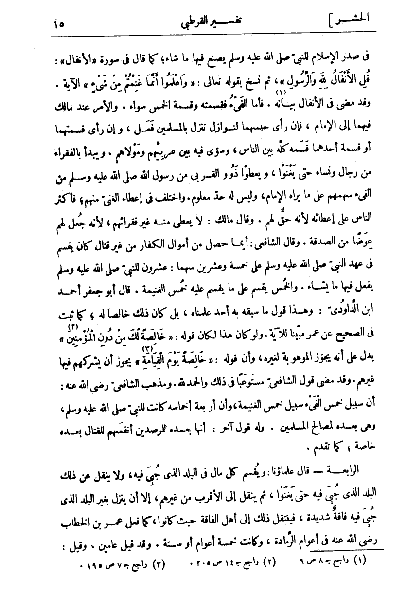 فِي صَدْرِ الْإِسْلَامِ لِلنَّبِيِّ صَلَّى اللَّهُ عَلَيْهِ وَسَلَّمَ يَصْنَعُ فِيهَا مَا شَاءَ، كَمَا قَالَ فِي سُورَةِ" الْأَنْفَالِ": قُلِ الْأَنْفالُ لِلَّهِ وَالرَّسُولِ [الأنفال: ١]، ثُمَّ نُسِخَ بِقَوْلِهِ تَعَالَى: وَاعْلَمُوا أَنَّما غَنِمْتُمْ مِنْ شَيْءٍ [الأنفال: ٤١] الْآيَةَ. وَقَدْ مَضَى فِي الْأَنْفَالِ بَيَانُهُ «١». فَأَمَّا الْفَيْءُ فَقِسْمَتُهُ وَقِسْمَةُ الْخُمُسِ سَوَاءٌ. وَالْأَمْرُ عِنْدَ مَالِكٍ فِيهِمَا إِلَى الْإِمَامِ، فَإِنْ رَأَى حَبْسَهُمَا لِنَوَازِلَ تَنْزِلُ بِالْمُسْلِمِينَ فَعَلَ، وَإِنْ رَأَى قِسْمَتَهُمَا أَوْ قِسْمَةَ أَحَدِهِمَا قَسَمَهُ كُلَّهُ بَيْنَ النَّاسِ، وَسَوَّى فِيهِ بَيْنَ عَرَبِيِّهِمْ وَمَوْلَاهُمْ. وَيَبْدَأُ بِالْفُقَرَاءِ مِنْ رِجَالٍ وَنِسَاءٍ حَتَّى يَغْنَوْا، وَيُعْطَوْا ذَوُو الْقُرْبَى مِنْ رَسُولِ اللَّهِ صَلَّى اللَّهُ عَلَيْهِ وَسَلَّمَ مِنَ الْفَيْءِ سَهْمَهُمْ عَلَى مَا يَرَاهُ الْإِمَامُ، وَلَيْسَ لَهُ حَدٌّ مَعْلُومٌ. وَاخْتُلِفَ فِي إِعْطَاءِ الْغَنِيِّ مِنْهُمْ، فَأَكْثَرُ النَّاسِ عَلَى إِعْطَائِهِ لِأَنَّهُ حَقٌّ لَهُمْ. وَقَالَ مَالِكٌ: لَا يُعْطَى مِنْهُ غَيْرُ فُقَرَائِهِمْ، لِأَنَّهُ جُعِلَ لَهُمْ عِوَضًا مِنَ الصَّدَقَةِ. وَقَالَ الشَّافِعِيُّ: أَيُّمَا حَصَلَ مِنْ أَمْوَالِ الْكُفَّارِ مِنْ غَيْرِ قِتَالٍ كَانَ يُقْسَمُ فِي عَهْدِ النَّبِيِّ صَلَّى اللَّهُ عَلَيْهِ وَسَلَّمَ عَلَى خَمْسَةٍ وَعِشْرِينَ سَهْمًا: عِشْرُونَ لِلنَّبِيِّ صَلَّى اللَّهُ عَلَيْهِ وَسَلَّمَ يَفْعَلُ فِيهَا مَا يَشَاءُ. وَالْخُمُسُ يُقْسَمُ عَلَى مَا يُقْسَمُ عَلَيْهِ خُمُسُ الغنيمة. قال أبو جعفر أحمد ابن الدَّاوُدِيِّ: وَهَذَا قَوْلٌ مَا سَبَقَهُ بِهِ أَحَدٌ عَلِمْنَاهُ، بَلْ كَانَ ذَلِكَ خَالِصًا لَهُ، كَمَا ثَبَتَ فِي الصَّحِيحِ عَنْ عُمَرَ مُبَيِّنًا لِلْآيَةِ. وَلَوْ كَانَ هَذَا لَكَانَ قَوْلُهُ: خالِصَةً لَكَ مِنْ دُونِ الْمُؤْمِنِينَ «٢» [الأحزاب: ٥٠] يدل على أنه يجوز الموهبة لغيره، وأن قوله: خالِصَةً يَوْمَ الْقِيامَةِ «٣» [الأعراف: ٣٢] يَجُوزُ أَنْ يُشْرِكَهُمْ فِيهَا غَيْرَهُمْ. وَقَدْ مَضَى قَوْلُ الشَّافِعِيِّ مُسْتَوْعَبًا فِي ذَلِكَ وَالْحَمْدُ لِلَّهِ. وَمَذْهَبُ الشَّافِعِيِّ رَضِيَ اللَّهُ عَنْهُ: أَنَّ سَبِيلَ خُمُسِ الْفَيْءِ سَبِيلُ خُمُسِ الْغَنِيمَةِ، وَأَنَّ أَرْبَعَةَ أَخْمَاسِهِ كَانَتْ لِلنَّبِيِّ صَلَّى اللَّهُ عَلَيْهِ وَسَلَّمَ، وَهِيَ بَعْدَهُ لِمَصَالِحِ الْمُسْلِمِينَ. وَلَهُ قَوْلٌ آخَرُ: أَنَّهَا بَعْدَهُ لِلْمُرْصِدِينَ أَنْفُسَهُمْ لِلْقِتَالِ بَعْدَهُ خَاصَّةً، كَمَا تَقَدَّمَ. الرَّابِعَةُ- قَالَ عُلَمَاؤُنَا: وَيُقْسَمُ كُلُّ مَالٍ فِي الْبَلَدِ الَّذِي جُبِيَ فِيهِ، وَلَا يُنْقَلُ عَنْ ذَلِكَ الْبَلَدِ الَّذِي جُبِيَ فِيهِ حَتَّى يَغْنَوْا، ثُمَّ يُنْقَلُ إِلَى الْأَقْرَبِ مِنْ غَيْرِهِمْ، إِلَّا أَنْ يَنْزِلَ بِغَيْرِ الْبَلَدِ الَّذِي جُبِيَ فِيهِ فَاقَةٌ شَدِيدَةٌ، فَيَنْتَقِلَ ذَلِكَ إِلَى أَهْلِ الْفَاقَةِ حَيْثُ كَانُوا، كَمَا فَعَلَ عُمَرَ بْنِ الْخَطَّابِ رَضِيَ اللَّهُ عَنْهُ فِي أَعْوَامِ الرَّمَادَةِ، وَكَانَتْ خَمْسَةَ أَعْوَامٍ أَوْ سِتَّةً. وَقَدْ قيل عامين. وقيل: