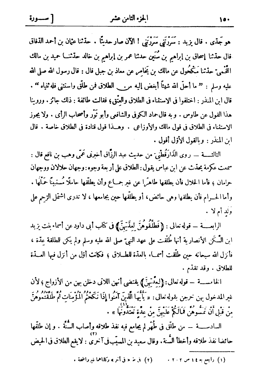 هُوَ جَدِّي. قَالَ يَزِيدُ: سَرَرْتِنِي سَرَرْتِنِي! الْآنَ صَارَ حَدِيثًا. حَدَّثَنَا عُثْمَانُ بْنُ أَحْمَدَ الدَّقَّاقُ قَالَ حَدَّثَنَا إِسْحَاقُ بْنُ إِبْرَاهِيمَ بْنِ سُنَيْنٍ حَدَّثَنَا عُمَرُ بْنُ إِبْرَاهِيمَ بْنِ خَالِدٍ حَدَّثَنَا حُمَيْدُ بْنُ مَالِكٍ اللَّخْمِيُّ حَدَّثَنَا مَكْحُولٌ عَنْ مَالِكِ بْنِ يُخَامِرَ عَنْ مُعَاذِ بْنِ جَبَلٍ قَالَ: قَالَ رَسُولُ اللَّهِ صَلَّى اللَّهُ عَلَيْهِ وَسَلَّمَ: (مَا أَحَلَّ اللَّهُ شَيْئًا أَبْغَضَ إِلَيْهِ مِنَ الطَّلَاقِ فَمَنْ طَلَّقَ وَاسْتَثْنَى فَلَهُ ثُنْيَاهُ). قَالَ ابْنُ الْمُنْذِرِ: اخْتَلَفُوا فِي الِاسْتِثْنَاءِ فِي الطَّلَاقِ وَالْعِتْقِ، فَقَالَتْ طَائِفَةٌ: ذَلِكَ جَائِزٌ. وَرُوِّينَا هَذَا الْقَوْلَ عَنْ طَاوُسٍ. وَبِهِ قَالَ حَمَّادٌ الْكُوفِيُّ وَالشَّافِعِيُّ وَأَبُو ثَوْرٍ وَأَصْحَابُ الرَّأْيِ. وَلَا يَجُوزُ الِاسْتِثْنَاءُ فِي الطَّلَاقِ فِي قَوْلِ مَالِكٍ وَالْأَوْزَاعِيِّ. وَهَذَا قَوْلُ قَتَادَةَ فِي الطَّلَاقِ خَاصَّةً. قَالَ ابْنُ الْمُنْذِرِ: وَبِالْقَوْلِ الْأَوَّلِ أَقُولُ. الثَّالِثَةُ- رَوَى الدَّارَقُطْنِيُّ مِنْ حَدِيثِ عَبْدِ الرَّزَّاقِ أَخْبَرَنِي عَمِّي وَهْبُ بْنُ نَافِعٍ قَالَ سَمِعْتُ عِكْرِمَةَ يُحَدِّثُ عَنِ ابْنِ عَبَّاسٍ يَقُولُ: الطَّلَاقُ عَلَى أَرْبَعَةِ وُجُوهٍ: وَجْهَانِ حَلَالَانِ وَوَجْهَانِ حَرَامَانِ، فَأَمَّا الْحَلَالُ فَأَنْ يُطَلِّقَهَا طَاهِرًا عَنْ غَيْرِ جِمَاعٍ وَأَنْ يُطَلِّقَهَا حَامِلًا مُسْتَبِينًا حَمْلُهَا. وَأَمَّا الْحَرَامُ فَأَنْ يُطَلِّقَهَا وَهِيَ حَائِضٌ، أَوْ يُطَلِّقَهَا حِينَ يُجَامِعُهَا، لَا تَدْرِي اشْتَمَلَ الرَّحِمُ عَلَى وَلَدٍ أَمْ لَا. الرَّابِعَةُ- قَوْلُهُ تَعَالَى: (فَطَلِّقُوهُنَّ لِعِدَّتِهِنَّ) فِي كِتَابِ أَبِي دَاوُدَ عَنْ أَسْمَاءَ بِنْتِ يزيد ابن السَّكَنِ الْأَنْصَارِيَّةِ أَنَّهَا طُلِّقَتْ عَلَى عَهْدِ النَّبِيِّ صَلَّى اللَّهُ عَلَيْهِ وَسَلَّمَ وَلَمْ يَكُنْ لِلْمُطَلَّقَةِ عِدَّةٌ، فَأَنْزَلَ اللَّهُ سُبْحَانَهُ حِينَ طُلِّقَتْ أَسْمَاءُ بِالْعِدَّةِ لِلطَّلَاقِ، فَكَانَتْ أَوَّلَ مَنْ أُنْزِلَ فِيهَا الْعِدَّةُ لِلطَّلَاقِ. وَقَدْ تَقَدَّمَ. الْخَامِسَةُ: قَوْلُهُ تَعَالَى: لِعِدَّتِهِنَّ يَقْتَضِي أَنَّهُنَّ اللَّاتِي دُخِلَ بِهِنَّ مِنَ الْأَزْوَاجِ، لِأَنَّ غَيْرَ الْمَدْخُولِ بِهِنَّ خَرَجْنَ بِقَوْلِهِ تَعَالَى: يَا أَيُّهَا الَّذِينَ آمَنُوا إِذا نَكَحْتُمُ الْمُؤْمِناتِ ثُمَّ طَلَّقْتُمُوهُنَّ مِنْ قَبْلِ أَنْ تَمَسُّوهُنَّ فَما لَكُمْ عَلَيْهِنَّ مِنْ عِدَّةٍ تَعْتَدُّونَها «١» [الأحزاب: ٤٩]. السَّادِسَةُ: مَنْ طَلَّقَ فِي طُهْرٍ لَمْ يُجَامِعْ فِيهِ نَفَذَ طَلَاقُهُ وَأَصَابَ السُّنَّةَ. وَإِنْ طَلَّقَهَا حَائِضًا نَفَذَ طَلَاقُهُ وَأَخْطَأَ السُّنَّةَ. وَقَالَ سَعِيدُ بْنُ الْمُسَيَّبِ فِي أُخْرَى: «٢» لَا يَقَعُ الطَّلَاقُ في الحيض