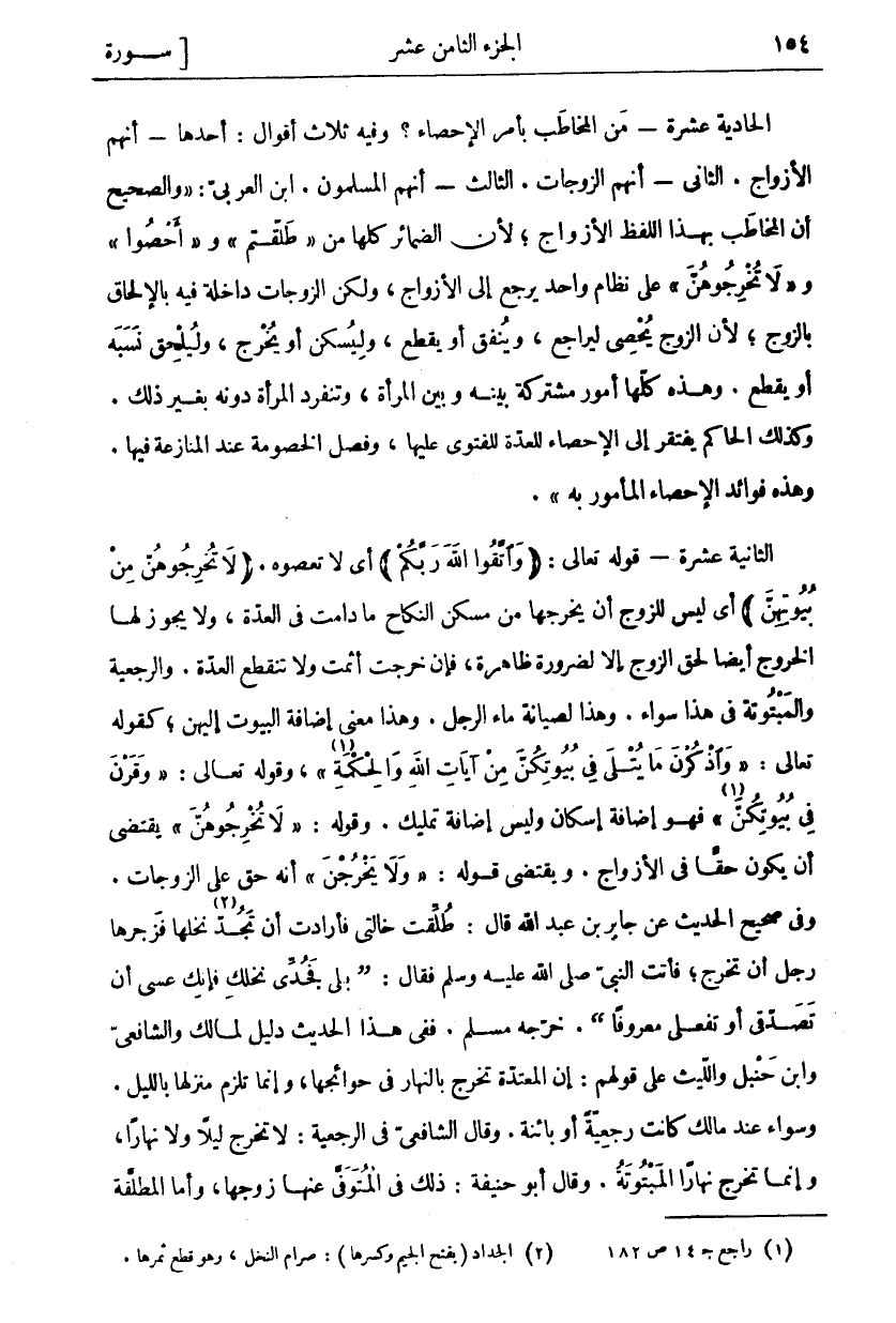الْحَادِيَةَ عَشْرَةَ: مَنِ الْمُخَاطَبُ بِأَمْرِ الْإِحْصَاءِ؟ وَفِيهِ ثَلَاثُ أَقْوَالٍ: أَحَدُهَا- أَنَّهُمُ الْأَزْوَاجُ. الثَّانِي- أَنَّهُمُ الزَّوْجَاتُ. الثَّالِثُ- أَنَّهُمُ الْمُسْلِمُونَ. ابْنُ الْعَرَبِيِّ:" وَالصَّحِيحُ أَنَّ الْمُخَاطَبَ بِهَذَا اللَّفْظِ الْأَزْوَاجُ، لِأَنَّ الضَّمَائِرَ كلها من طَلَّقْتُمُ وأَحْصُوا ولا تُخْرِجُوهُنَّ عَلَى نِظَامٍ وَاحِدٍ يَرْجِعُ إِلَى الْأَزْوَاجِ، وَلَكِنَّ الزَّوْجَاتِ دَاخِلَةٌ فِيهِ بِالْإِلْحَاقِ بِالزَّوْجِ، لِأَنَّ الزَّوْجَ يُحْصِي لِيُرَاجِعَ، وَيُنْفِقُ أَوْ يَقْطَعُ، وَلِيُسْكِنَ أَوْ يُخْرِجَ وَلِيُلْحِقَ نَسَبَهُ أَوْ يَقْطَعَ. وَهَذِهِ كُلُّهَا أُمُورٌ مُشْتَرَكَةٌ بَيْنَهُ وَبَيْنَ الْمَرْأَةِ، وَتَنْفَرِدُ الْمَرْأَةُ دُونَهُ بِغَيْرِ ذَلِكَ. وَكَذَلِكَ الْحَاكِمُ يَفْتَقِرُ إِلَى الْإِحْصَاءِ لِلْعِدَّةِ لِلْفَتْوَى عَلَيْهَا، وَفَصْلُ الْخُصُومَةِ عِنْدَ الْمُنَازَعَةِ فِيهَا. وَهَذِهِ فَوَائِدُ الْإِحْصَاءِ الْمَأْمُورِ بِهِ". الثَّانِيَةَ عَشْرَةَ- قَوْلُهُ تَعَالَى: (وَاتَّقُوا اللَّهَ رَبَّكُمْ) أَيْ لَا تَعْصُوهُ. (لَا تُخْرِجُوهُنَّ مِنْ بُيُوتِهِنَّ) أَيْ لَيْسَ لِلزَّوْجِ أَنْ يُخْرِجَهَا مِنْ مسكن النكاح ما دامت في العدة، يَجُوزُ لَهَا الْخُرُوجُ أَيْضًا لِحَقِّ الزَّوْجِ إِلَّا لِضَرُورَةٍ ظَاهِرَةٍ، فَإِنْ خَرَجَتْ أَثِمَتْ وَلَا تَنْقَطِعُ الْعِدَّةُ. وَالرَّجْعِيَّةُ وَالْمَبْتُوتَةُ فِي هَذَا سَوَاءٌ. وَهَذَا لِصِيَانَةِ مَاءِ الرَّجُلِ. وَهَذَا مَعْنَى إِضَافَةِ الْبُيُوتِ إِلَيْهِنَّ، كَقَوْلِهِ تَعَالَى: وَاذْكُرْنَ مَا يُتْلى فِي بُيُوتِكُنَّ مِنْ آياتِ اللَّهِ وَالْحِكْمَةِ «١» [الأحزاب: ٣٤]، وقوله تعالى: وَقَرْنَ فِي بُيُوتِكُنَّ «٢» [الأحزاب: ٣٣] فَهُوَ إِضَافَةُ إِسْكَانٍ وَلَيْسَ إِضَافَةَ تَمْلِيكٍ. وَقَوْلُهُ: لَا تُخْرِجُوهُنَّ يَقْتَضِي أَنْ يَكُونَ حَقًّا فِي الْأَزْوَاجِ. وَيَقْتَضِي قَوْلُهُ: وَلا يَخْرُجْنَ أَنَّهُ حَقٌّ عَلَى الزَّوْجَاتِ. وَفِي صَحِيحِ الْحَدِيثِ عَنْ جَابِرِ بْنِ عَبْدِ اللَّهِ قَالَ: طُلِّقَتْ خَالَتِي فَأَرَادَتْ أَنْ تَجُدَّ «٣» نَخْلَهَا فَزَجَرَهَا رَجُلٌ أَنْ تَخْرُجَ، فَأَتَتِ النَّبِيَّ صَلَّى اللَّهُ عَلَيْهِ وَسَلَّمَ فَقَالَ: (بَلَى فَجُدِّيَ نَخْلَكِ فَإِنَّكِ عَسَى أَنْ تَصَدَّقِي أَوْ تَفْعَلِي مَعْرُوفًا). خَرَّجَهُ مُسْلِمٌ. فَفِي هَذَا الْحَدِيثِ دَلِيلٌ لِمَالِكٍ وَالشَّافِعِيِّ وَابْنِ حَنْبَلٍ وَاللَّيْثِ عَلَى قَوْلِهِمْ: إِنَّ الْمُعْتَدَّةَ تَخْرُجُ بِالنَّهَارِ فِي حَوَائِجِهَا، وَإِنَّمَا تَلْزَمُ مَنْزِلَهَا بِاللَّيْلِ. وَسَوَاءٌ عِنْدَ مَالِكٍ كَانَتْ رَجْعِيَّةً أَوْ بَائِنَةً. وَقَالَ الشَّافِعِيُّ فِي الرَّجْعِيَّةِ: لَا تَخْرُجُ لَيْلًا وَلَا نَهَارًا، وَإِنَّمَا تَخْرُجُ نَهَارًا الْمَبْتُوتَةُ. وَقَالَ أَبُو حَنِيفَةَ: ذَلِكَ فِي الْمُتَوَفَّى عَنْهَا زَوْجُهَا، وَأَمَّا الْمُطَلَّقَةُ