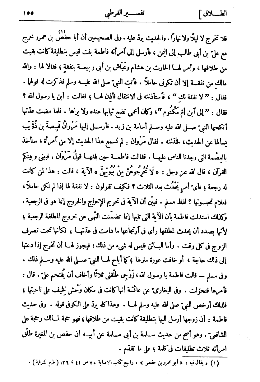 فَلَا تَخْرُجُ لَا لَيْلًا وَلَا نَهَارًا. وَالْحَدِيثُ يَرُدُّ عَلَيْهِ. وَفِي الصَّحِيحَيْنِ أَنَّ أَبَا حَفْصِ «١» بْنِ عَمْرٍو خَرَجَ مَعَ عَلِيِّ بْنِ أَبِي طَالِبٍ إِلَى الْيَمَنِ، فَأَرْسَلَ إِلَى امْرَأَتِهِ فَاطِمَةَ بنت قيس بتطلقة كَانَتْ بَقِيَتْ مِنْ طَلَاقِهَا، وَأَمَرَ لَهَا الْحَارِثَ بْنَ هِشَامٍ وَعَيَّاشَ بْنَ أَبِي رَبِيعَةَ بِنَفَقَةٍ فَقَالَا لَهَا: وَاللَّهِ مَا لَكِ مِنْ نَفَقَةٍ إِلَّا أَنْ تَكُونِي حَامِلًا. فَأَتَتِ النَّبِيِّ صَلَّى اللَّهُ عَلَيْهِ وَسَلَّمَ فَذَكَرْتُ لَهُ قَوْلُهُمَا. فَقَالَ: (لَا نَفَقَةَ لَكِ)، فَاسْتَأْذَنَتْهُ فِي الِانْتِقَالِ فَأَذِنَ لَهَا، فَقَالَتْ: أَيْنَ يَا رَسُولَ اللَّهِ؟ فَقَالَ: (إِلَى ابْنِ أُمِّ مَكْتُومٍ)، وَكَانَ أَعْمَى تَضَعُ ثِيَابَهَا عِنْدَهُ وَلَا يَرَاهَا. فَلَمَّا مَضَتْ عِدَّتُهَا أَنْكَحَهَا النَّبِيُّ صَلَّى اللَّهُ عَلَيْهِ وَسَلَّمَ أُسَامَةَ بْنَ زَيْدٍ. فَأَرْسَلَ إِلَيْهَا مَرْوَانُ قَبِيصَةَ بْنَ ذُؤَيْبٍ يَسْأَلْهَا عَنِ الْحَدِيثِ، فَحَدَّثَتْهُ. فَقَالَ مَرْوَانُ: لَمْ نَسْمَعْ هَذَا الْحَدِيثَ إِلَّا مِنَ امْرَأَةٍ، سَنَأْخُذُ بِالْعِصْمَةِ الَّتِي وَجَدْنَا النَّاسَ عَلَيْهَا. فَقَالَتْ فَاطِمَةُ حِينَ بَلَغَهَا قَوْلُ مَرْوَانَ: فَبَيْنِي وَبَيْنَكُمُ الْقُرْآنُ، قَالَ اللَّهُ عَزَّ وَجَلَّ: لَا تُخْرِجُوهُنَّ مِنْ بُيُوتِهِنَّ الْآيَةَ، قَالَتْ: هَذَا لِمَنْ كَانَتْ لَهُ رَجْعَةٌ، فَأَيُّ أَمْرٍ يَحْدُثُ بَعْدَ الثَّلَاثِ؟ فَكَيْفَ تَقُولُونَ: لَا نَفَقَةَ لَهَا إِذَا لَمْ تَكُنْ حَامِلًا، فَعَلَامَ تَحْبِسُونَهَا؟ لَفْظُ مُسْلِمٍ. فَبَيَّنَ أَنَّ الْآيَةَ فِي تَحْرِيمِ الْإِخْرَاجِ وَالْخُرُوجِ إِنَّمَا هُوَ فِي الرَّجْعِيَّةِ. وَكَذَلِكَ اسْتَدَلَّتْ فَاطِمَةُ بِأَنَّ الْآيَةَ الَّتِي تَلِيهَا إِنَّمَا تَضَمَّنَتِ النَّهْيَ عَنْ خُرُوجِ الْمُطَلَّقَةِ الرَّجْعِيَّةِ، لِأَنَّهَا بِصَدَدِ أَنْ يَحْدُثَ لِمُطَلِّقِهَا رَأْيٌ فِي ارْتِجَاعِهَا مَا دَامَتْ فِي عِدَّتِهَا، فَكَأَنَّهَا تَحْتَ تَصَرُّفِ الزَّوْجِ فِي كُلِّ وَقْتٍ. وَأَمَّا الْبَائِنُ فَلَيْسَ له شي مِنْ ذَلِكَ، فَيَجُوزُ لَهَا أَنْ تَخْرُجَ إِذَا دَعَتْهَا إِلَى ذَلِكَ حَاجَةٌ، أَوْ خَافَتْ عَوْرَةَ مَنْزِلِهَا، كَمَا أَبَاحَ لَهَا النَّبِيُّ صَلَّى اللَّهُ عَلَيْهِ وَسَلَّمَ ذَلِكَ. وَفِي مُسْلِمٍ- قَالَتْ فَاطِمَةُ يَا رَسُولَ اللَّهِ، زَوْجِي طَلَّقَنِي ثَلَاثًا وَأَخَافُ أَنْ يُقْتَحَمَ عَلَيَّ. قَالَ: فَأَمَرَهَا فَتَحَوَّلَتْ وَفِي الْبُخَارِيِّ عَنْ عَائِشَةَ أَنَّهَا كَانَتْ فِي مَكَانٍ وَحِشٍ فَخِيفَ عَلَى نَاحِيَتِهَا، فَلِذَلِكَ أَرْخَصَ النَّبِيُّ صَلَّى اللَّهُ عَلَيْهِ وَسَلَّمَ لَهَا. وَهَذَا كُلُّهُ يَرُدُّ عَلَى الْكُوفِيِّ قَوْلَهُ. وَفِي حَدِيثِ فَاطِمَةَ: أَنَّ زَوْجَهَا أَرْسَلَ إِلَيْهَا بِتَطْلِيقَةٍ كَانَتْ بَقِيَتْ مِنْ طَلَاقِهَا، فَهُوَ حُجَّةٌ لِمَالِكٍ وَحُجَّةٌ عَلَى الشَّافِعِيِّ. وَهُوَ أَصَحُّ مِنْ حَدِيثِ سَلَمَةَ بْنِ أَبِي سَلَمَةَ عَنْ أَبِيهِ أَنَّ حَفْصَ بْنَ الْمُغِيرَةِ طَلَّقَ امْرَأَتَهُ ثَلَاثَ تَطْلِيقَاتٍ فِي كَلِمَةٍ، على ما تقدم.