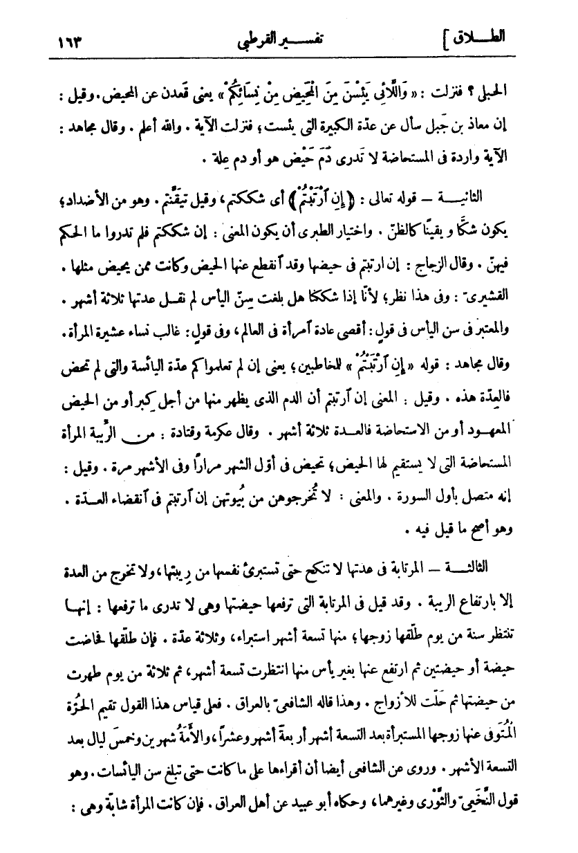 الْحُبْلَى؟ فَنَزَلَتْ: وَاللَّائِي يَئِسْنَ مِنَ الْمَحِيضِ مِنْ نِسائِكُمْ يَعْنِي قَعَدْنَ عَنِ الْمَحِيضِ. وَقِيلَ: إِنَّ مُعَاذَ بْنَ جَبَلٍ سَأَلَ عَنْ عِدَّةِ الْكَبِيرَةِ الَّتِي يَئِسَتْ، فَنَزَلَتِ الْآيَةُ. وَاللَّهُ أَعْلَمُ. وَقَالَ مُجَاهِدٌ: الْآيَةُ وَارِدَةٌ فِي الْمُسْتَحَاضَةِ لَا تَدْرِي دَمَ حَيْضٍ هُوَ أَوْ دَمَ عِلَّةٍ. الثَّانِيَةُ- قَوْلُهُ تَعَالَى: إِنِ ارْتَبْتُمْ أَيْ شَكَكْتُمْ، وَقِيلَ تَيَقَّنْتُمْ. وَهُوَ مِنَ الْأَضْدَادِ، يَكُونُ شَكًّا وَيَقِينًا كَالظَّنِّ. وَاخْتِيَارُ الطَّبَرِيِّ أَنْ يَكُونَ الْمَعْنَى: إِنْ شَكَكْتُمْ فَلَمْ تَدْرُوا مَا الْحُكْمُ فِيهِنَّ. وَقَالَ الزَّجَّاجُ: إِنِ ارْتَبْتُمْ فِي حَيْضِهَا وَقَدِ انْقَطَعَ عَنْهَا الْحَيْضُ وَكَانَتْ مِمَّنْ يَحِيضُ مِثْلُهَا. الْقُشَيْرِيُّ: وَفِي هَذَا نَظَرٌ، لِأَنَّا إِذَا شَكَكْنَا هَلْ بَلَغَتْ سِنَّ الْيَأْسِ لَمْ نَقُلْ عِدَّتَهَا ثَلَاثَةُ أَشْهُرٍ. وَالْمُعْتَبَرُ فِي سِنِّ الْيَأْسِ فِي قَوْلٍ، أَقْصَى عَادَةِ امْرَأَةٍ فِي الْعَالَمِ، وَفِي قَوْلٍ: غَالِبُ نِسَاءِ عَشِيرَةِ الْمَرْأَةِ. وَقَالَ مُجَاهِدٌ: قَوْلُهُ إِنِ ارْتَبْتُمْ لِلْمُخَاطَبِينَ، يَعْنِي إِنْ لَمْ تَعْلَمُوا كَمْ عِدَّةُ الْيَائِسَةِ وَالَّتِي لَمْ تَحِضْ فَالْعِدَّةُ هَذِهِ. وَقِيلَ: الْمَعْنَى إِنِ ارْتَبْتُمْ أَنَّ الدَّمَ الَّذِي يَظْهَرُ مِنْهَا مِنْ أَجْلِ كِبَرٍ أَوْ مِنَ الْحَيْضِ الْمَعْهُودِ أَوْ مِنَ الِاسْتِحَاضَةِ فَالْعِدَّةُ ثَلَاثَةُ أَشْهُرٍ. وَقَالَ عِكْرِمَةُ وَقَتَادَةُ: مِنَ الرِّيبَةِ الْمَرْأَةُ الْمُسْتَحَاضَةُ الَّتِي لَا يَسْتَقِيمُ لَهَا الْحَيْضُ، تَحِيضُ فِي أَوَّلِ الشَّهْرِ مِرَارًا وَفِي الْأَشْهُرِ مَرَّةً. وَقِيلَ: إِنَّهُ مُتَّصِلٌ بِأَوَّلِ السُّورَةِ. وَالْمَعْنَى: لَا تُخْرِجُوهُنَّ مِنْ بُيُوتِهِنَّ إِنِ ارْتَبْتُمْ فِي انْقِضَاءِ الْعِدَّةِ. وَهُوَ أَصَحُّ مَا قِيلَ فِيهِ. الثَّالِثَةُ- الْمُرْتَابَةُ فِي عِدَّتِهَا لَا تُنْكَحُ حَتَّى تَسْتَبْرِئَ نَفْسَهَا مِنْ رِيبَتِهَا وَلَا تَخْرُجُ مِنَ الْعِدَّةِ إِلَّا بِارْتِفَاعِ الرِّيبَةِ. وَقَدْ قِيلَ فِي الْمُرْتَابَةِ الَّتِي تَرْفَعُهَا حَيْضَتَهَا وَهِيَ لَا تَدْرِي مَا تَرْفَعُهَا: إِنَّهَا تَنْتَظِرُ سَنَةً مِنْ يَوْمِ طَلَّقَهَا زَوْجُهَا، مِنْهَا تِسْعَةُ أَشْهُرٍ اسْتِبْرَاءٌ، وَثَلَاثَةٌ عِدَّةٌ. فَإِنْ طَلَّقَهَا فَحَاضَتْ حَيْضَةً أَوْ حَيْضَتَيْنِ ثُمَّ ارْتَفَعَ عَنْهَا بِغَيْرِ يَأْسٍ مِنْهَا انْتَظَرَتْ تِسْعَةَ أَشْهُرٍ، ثُمَّ ثَلَاثَةً مِنْ يَوْمٍ طَهُرَتْ مِنْ حَيْضَتِهَا ثُمَّ حَلَّتْ لِلْأَزْوَاجِ. وَهَذَا قَالَهُ الشَّافِعِيُّ بِالْعِرَاقِ. فَعَلَى قِيَاسِ هَذَا الْقَوْلِ تُقِيمُ الْحُرَّةُ الْمُتَوَفَّى عَنْهَا زَوْجُهَا الْمُسْتَبْرَأَةُ بَعْدَ التِّسْعَةِ أَشْهُرٍ أَرْبَعَةَ أَشْهُرٍ وَعَشْرًا، وَالْأَمَةُ شَهْرَيْنِ وَخَمْسَ لَيَالٍ بَعْدَ التِّسْعَةِ الْأَشْهُرِ. وَرُوِيَ عَنِ الشَّافِعِيِّ أَيْضًا أَنَّ أَقْرَاءَهَا عَلَى مَا كَانَتْ حَتَّى تَبْلُغَ سِنَّ الْيَائِسَاتِ. وَهُوَ قَوْلُ النَّخَعِيِّ وَالثَّوْرِيِّ وَغَيْرِهِمَا، وَحَكَاهُ أَبُو عُبَيْدٍ عَنْ أَهْلِ الْعِرَاقِ. فَإِنْ كَانَتِ الْمَرْأَةُ شَابَّةً وَهِيَ: