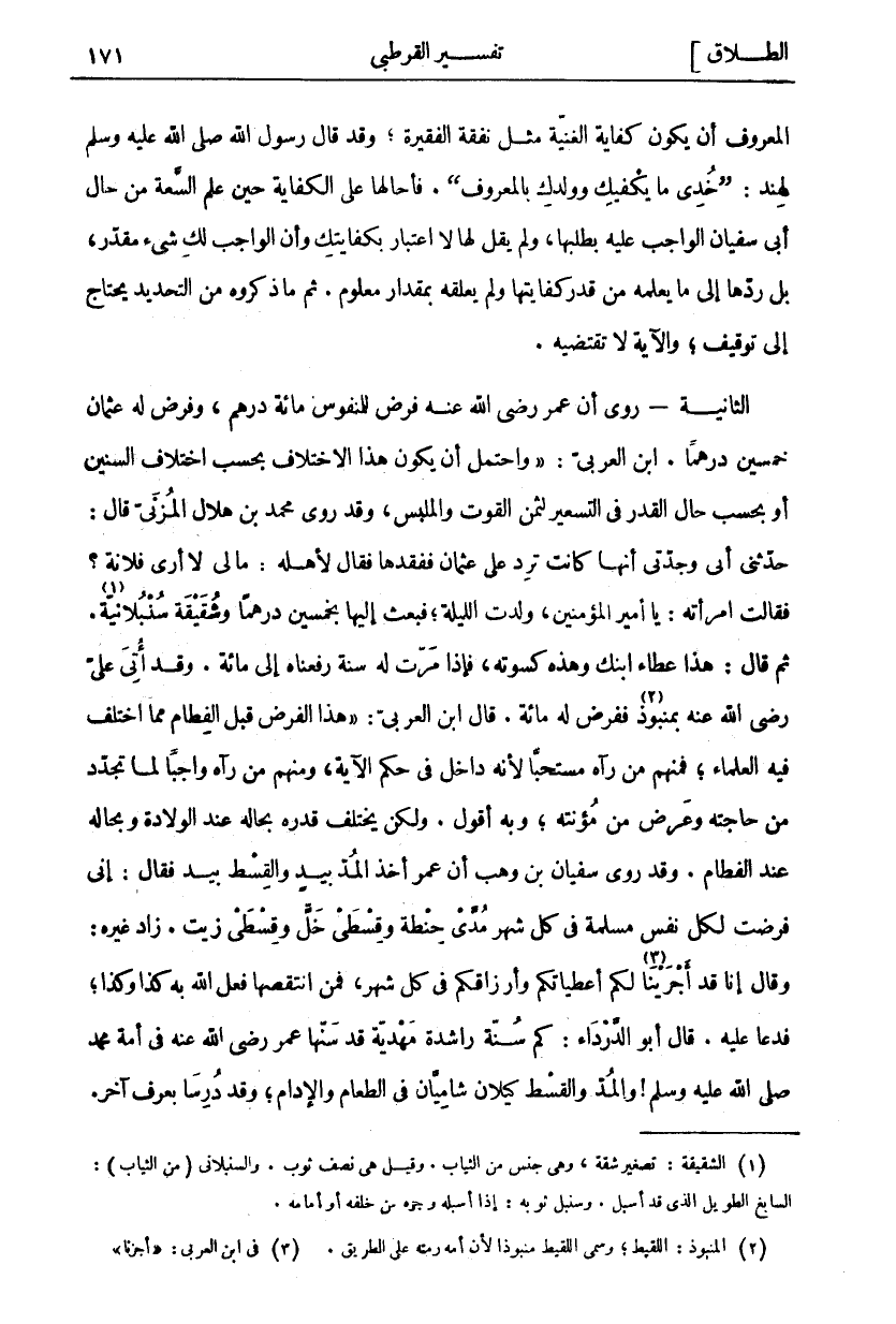 الْمَعْرُوفِ أَنْ يَكُونَ كِفَايَةُ الْغَنِيَّةِ مِثْلَ نَفَقَةِ الْفَقِيرَةِ، وَقَدْ قَالَ رَسُولُ اللَّهِ صَلَّى اللَّهُ عَلَيْهِ وسلم لهند: (خدي مَا يَكْفِيكِ وَوَلَدَكِ بِالْمَعْرُوفِ). فَأَحَالَهَا عَلَى الْكِفَايَةِ حِينَ عَلِمَ السَّعَةَ مِنْ حَالِ أَبِي سُفْيَانَ الْوَاجِبُ عَلَيْهِ بِطَلَبِهَا، وَلَمْ يَقُلْ لَهَا لَا اعتبار بكفايتك وأن الواجب لك شي مُقَدَّرٌ، بَلْ رَدَّهَا إِلَى مَا يَعْلَمُهُ مِنْ قَدْرِ كِفَايَتِهَا وَلَمْ يُعَلِّقْهُ بِمِقْدَارٍ مَعْلُومٍ. ثُمَّ مَا ذَكَرُوهُ مِنَ التَّحْدِيدِ يَحْتَاجُ إِلَى تَوْقِيفٍ، وَالْآيَةُ لَا تَقْتَضِيهِ. الثَّانِيَةُ- رُوِيَ أَنَّ عُمَرَ رَضِيَ اللَّهُ عَنْهُ فَرَضَ لِلْمَنْفُوسِ مِائَةَ دِرْهَمٍ، وَفَرَضَ لَهُ عُثْمَانُ خَمْسِينَ دِرْهَمًا. ابْنُ الْعَرَبِيِّ:" وَاحْتَمَلَ أَنْ يَكُونَ هَذَا الِاخْتِلَافُ بِحَسَبِ اخْتِلَافِ السِّنِينَ أَوْ بِحَسَبِ حَالِ الْقَدْرِ فِي التَّسْعِيرِ لِثَمَنِ الْقُوتِ وَالْمَلْبَسِ، وَقَدْ رَوَى مُحَمَّدُ بْنُ هِلَالٍ الْمُزَنِيُّ قَالَ: حَدَّثَنِي أَبِي وَجَدَّتِي أَنَّهَا كَانَتْ تَرِدُ عَلَى عُثْمَانَ فَفَقَدَهَا فَقَالَ لِأَهْلِهِ: مَا لِي لَا أَرَى فُلَانَةَ؟ فَقَالَتِ امْرَأَتُهُ: يَا أَمِيرَ الْمُؤْمِنِينَ، وَلَدَتِ اللَّيْلَةَ، فَبَعَثَ إِلَيْهَا بِخَمْسِينَ دِرْهَمًا وَشُقَيْقَةً سُنْبُلَانِيَّةً «١». ثُمَّ قَالَ: هَذَا عَطَاءُ ابْنِكِ وَهَذِهِ كَسَوْتُهُ، فَإِذَا مَرَّتْ لَهُ سَنَةً رَفَعْنَاهُ إِلَى مِائَةٍ. وَقَدْ أُتِيَ عَلِيٌّ رَضِيَ اللَّهُ عَنْهُ بِمَنْبُوذٍ «٢» فَفَرَضَ لَهُ مِائَةً. قَالَ ابْنُ الْعَرَبِيِّ: (هَذَا الْفَرْضُ قَبْلَ الْفِطَامِ مِمَّا اخْتَلَفَ فِيهِ الْعُلَمَاءُ، فَمِنْهُمْ مَنْ رَآهُ مُسْتَحَبًّا لِأَنَّهُ دَاخِلٌ فِي حُكْمِ الْآيَةِ، وَمِنْهُمْ مَنْ رَآهُ وَاجِبًا لِمَا تَجَدَّدَ مِنْ حَاجَتِهِ وَعَرَضَ مِنْ مُؤْنَتِهِ، وَبِهِ أَقُولُ. وَلَكِنْ يَخْتَلِفُ قَدْرُهُ بِحَالِهِ عِنْدَ الْوِلَادَةِ وَبِحَالِهِ عِنْدَ الْفِطَامِ. وَقَدْ رَوَى سُفْيَانُ بْنُ وَهْبٍ أَنَّ عُمَرَ أَخَذَ الْمُدَّ بِيَدٍ وَالْقِسْطَ بِيَدٍ فَقَالَ: إِنِّي فَرَضْتُ لِكُلِّ نَفْسٍ مُسْلِمَةٍ فِي كُلِّ شَهْرٍ مُدَّيْ حِنْطَةٍ وَقِسْطَيْ خَلٍّ وَقِسْطَيْ زَيْتٍ. زَادَ غَيْرُهُ: وَقَالَ إِنَّا قَدْ أَجْرَيْنَا «٣» لَكُمْ أَعْطِيَاتِكُمْ وَأَرْزَاقَكُمْ فِي كُلِّ شَهْرٍ، فَمَنِ انْتَقَصَهَا فَعَلَ اللَّهُ بِهِ كَذَا وَكَذَا، فَدَعَا عَلَيْهِ. قَالَ أَبُو الدَّرْدَاءِ: كَمْ سُنَّةٌ رَاشِدَةٌ مَهْدِيَّةٌ قَدْ سَنَّهَا عُمَرُ رَضِيَ اللَّهُ عَنْهُ فِي أُمَّةِ مُحَمَّدٍ صَلَّى اللَّهُ عَلَيْهِ وَسَلَّمَ! وَالْمُدُّ وَالْقِسْطُ كَيْلَانِ شَامِيَّانِ فِي الطَّعَامِ وَالْإِدَامِ، وَقَدْ دُرِسَا بعرف أخر.