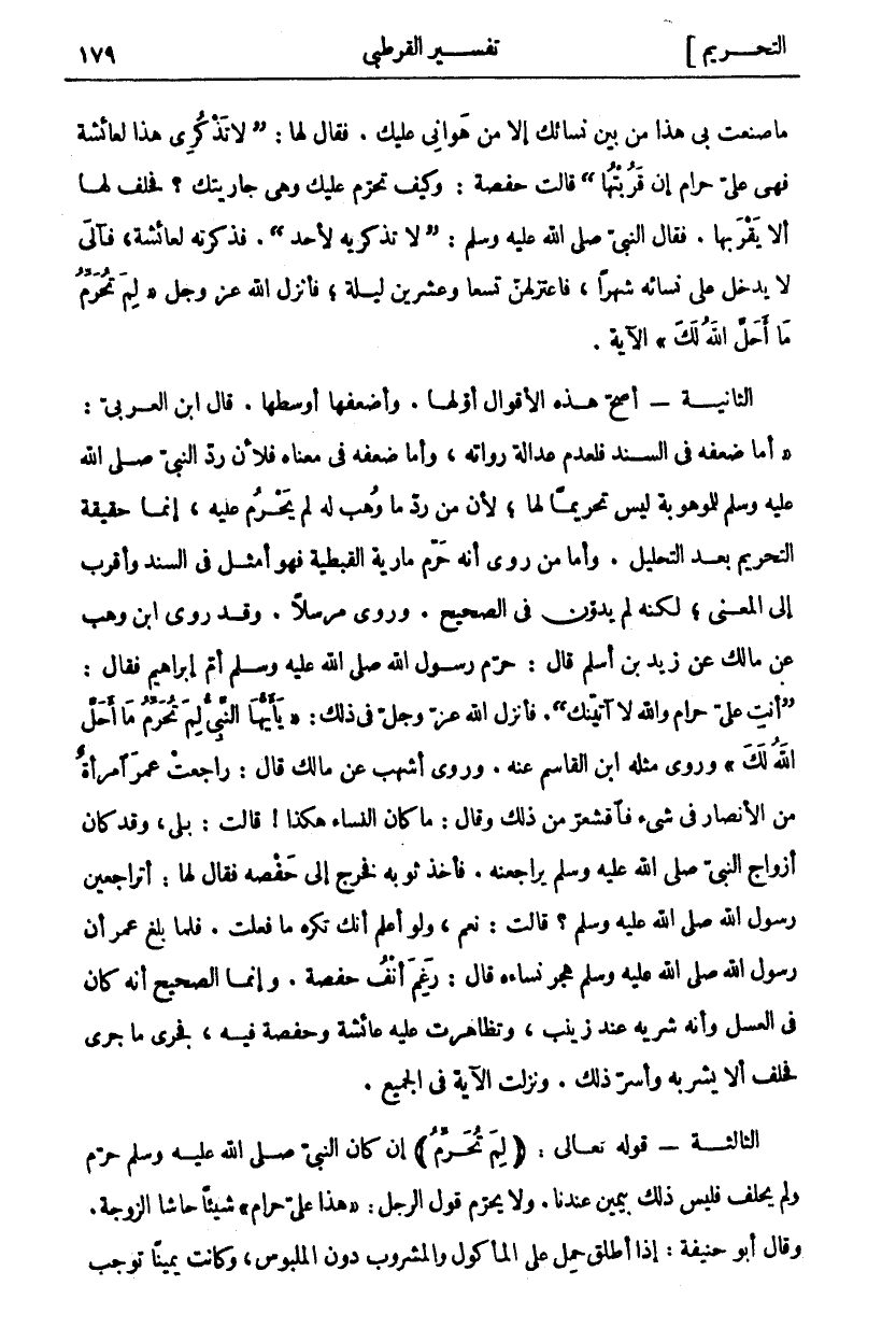 مَا صَنَعْتَ بِي هَذَا مِنْ بَيْنِ نِسَائِكَ إِلَّا مِنْ هَوَانِي عَلَيْكَ. فَقَالَ لَهَا: (لَا تَذْكُرِي هَذَا لِعَائِشَةَ فَهِيَ عَلَيَّ حَرَامٌ إِنْ قَرِبْتُهَا) قَالَتْ حَفْصَةُ: وَكَيْفَ تَحْرُمُ عَلَيْكَ وَهِيَ جَارِيَتُكَ؟ فَحَلَفَ لَهَا أَلَّا يَقْرَبَهَا. فَقَالَ النَّبِيُّ صَلَّى اللَّهُ عَلَيْهِ وَسَلَّمَ: (لَا تَذْكُرِيهِ لِأَحَدٍ). فَذَكَرَتْهُ لِعَائِشَةَ، فَآلَى لَا يَدْخُلُ عَلَى نِسَائِهِ شَهْرًا، فَاعْتَزَلَهُنَّ تِسْعًا وَعِشْرِينَ لَيْلَةً، فَأَنْزَلَ اللَّهُ عَزَّ وَجَلَّ لِمَ تُحَرِّمُ مَا أَحَلَّ اللَّهُ لَكَ الْآيَةَ. الثَّانِيَةُ- أَصَحُّ هَذِهِ الْأَقْوَالِ أَوَّلُهَا. وَأَضْعَفُهَا أَوْسَطُهَا. قَالَ ابْنُ الْعَرَبِيِّ:" أَمَّا ضَعْفُهُ فِي السَّنَدِ فَلِعَدَمِ عَدَالَةِ رُوَاتِهِ، وَأَمَّا ضَعْفُهُ فِي مَعْنَاهُ فَلِأَنَّ رَدَّ النَّبِيِّ صَلَّى اللَّهُ عَلَيْهِ وَسَلَّمَ لِلْمَوْهُوبَةِ لَيْسَ تَحْرِيمًا لَهَا، لِأَنَّ مَنْ رَدَّ مَا وُهِبَ لَهُ لَمْ يَحْرُمْ عَلَيْهِ، إِنَّمَا حَقِيقَةُ التَّحْرِيمِ بَعْدَ التَّحْلِيلِ. وَأَمَّا مَنْ رَوَى أَنَّهُ حَرَّمَ مَارِيَةَ الْقِبْطِيَّةَ فَهُوَ أَمْثَلُ فِي السَّنَدِ وَأَقْرَبُ إِلَى الْمَعْنَى، لَكِنَّهُ لَمْ يُدَوَّنْ فِي الصَّحِيحِ. وَرُوِيَ مُرْسَلًا. وَقَدْ رَوَى ابْنُ وَهْبٍ عَنْ مَالِكٍ عَنْ زَيْدِ بْنِ أَسْلَمَ قَالَ: حَرَّمَ رَسُولُ اللَّهِ صَلَّى اللَّهُ عَلَيْهِ وَسَلَّمَ أُمَّ إِبْرَاهِيمَ فَقَالَ: (أَنْتِ عَلَيَّ حَرَامٌ وَاللَّهِ لَا آتِيَنَّكِ). فَأَنْزَلَ اللَّهُ عَزَّ وَجَلَّ فِي ذَلِكَ: يَا أَيُّهَا النَّبِيُّ لِمَ تُحَرِّمُ مَا أَحَلَّ اللَّهُ لَكَ وَرَوَى مِثْلَهُ ابْنِ الْقَاسِمِ عَنْهُ. وَرَوَى أَشْهَبُ عَنْ مَالِكٍ قَالَ: رَاجَعَتْ عُمَرَ امْرَأَةٌ مِنَ الْأَنْصَارِ في شي فَاقْشَعَرَّ مِنْ ذَلِكَ وَقَالَ: مَا كَانَ النِّسَاءُ هَكَذَا! قَالَتْ: بَلَى، وَقَدْ كَانَ أَزْوَاجُ النَّبِيِّ صَلَّى اللَّهُ عَلَيْهِ وَسَلَّمَ يُرَاجِعْنَهُ. فَأَخَذَ ثَوْبَهُ فَخَرَجَ إِلَى حَفْصَةَ فَقَالَ لَهَا: أَتُرَاجِعِينَ رَسُولُ اللَّهِ صَلَّى اللَّهُ عَلَيْهِ وَسَلَّمَ؟ قَالَتِ: نَعَمْ، وَلَوْ أَعْلَمُ أَنَّكَ تَكْرَهُ مَا فَعَلْتُ. فَلَمَّا بَلَغَ عُمَرَ أَنَّ رَسُولَ اللَّهِ صَلَّى اللَّهُ عَلَيْهِ وَسَلَّمَ هَجَرَ نِسَاءَهُ قَالَ: رَغِمَ أَنْفُ حَفْصَةَ. وَإِنَّمَا الصَّحِيحُ أَنَّهُ كَانَ فِي الْعَسَلِ وَأَنَّهُ شَرِبَهُ عِنْدَ زَيْنَبَ، وَتَظَاهَرَتْ عَلَيْهِ عَائِشَةُ وَحَفْصَةُ فِيهِ، فَجَرَى مَا جَرَى فَحَلَفَ أَلَّا يَشْرَبَهُ وَأَسَرَّ ذَلِكَ. وَنَزَلَتِ الْآيَةُ فِي الْجَمِيعِ. الثَّالِثَةُ- قَوْلُهُ تَعَالَى: لِمَ تُحَرِّمُ إِنْ كَانَ النَّبِيُّ صَلَّى اللَّهُ عَلَيْهِ وَسَلَّمَ حَرَّمَ وَلَمْ يَحْلِفْ فَلَيْسَ ذَلِكَ بِيَمِينٍ عِنْدِنَا. وَلَا يُحَرِّمُ قَوْلُ الرَّجُلِ:" هَذَا عَلَيَّ حَرَامٌ" شَيْئًا حَاشَا الزَّوْجَةِ. وَقَالَ أَبُو حَنِيفَةَ: إِذَا أُطْلِقَ حُمِلَ عَلَى الْمَأْكُولِ وَالْمَشْرُوبِ دُونَ الْمَلْبُوسِ، وَكَانَتْ يَمِينًا توجب