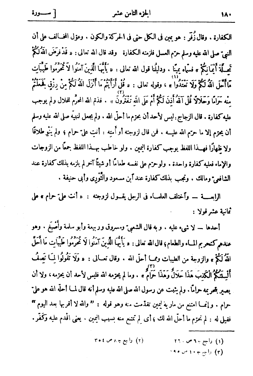 [التحريم: ٢] فَسَمَّاهُ يَمِينًا. وَدَلِيلُنَا قَوْلُ اللَّهِ تَعَالَى: يَا أَيُّهَا الَّذِينَ آمَنُوا لَا تُحَرِّمُوا طَيِّباتِ مَا أَحَلَّ اللَّهُ لَكُمْ وَلا تَعْتَدُوا [المائدة: ٨٧]، «١» وَقَوْلُهُ تَعَالَى: قُلْ أَرَأَيْتُمْ مَا أَنْزَلَ اللَّهُ لَكُمْ مِنْ رِزْقٍ فَجَعَلْتُمْ مِنْهُ حَراماً وَحَلالًا قُلْ آللَّهُ أَذِنَ لَكُمْ أَمْ عَلَى اللَّهِ تَفْتَرُونَ «٢» [يونس: ٥٩]. فَذَمَّ اللَّهُ الْمُحَرِّمَ لِلْحَلَالِ وَلَمْ يُوجِبْ عَلَيْهِ كَفَّارَةً. قَالَ الزَّجَّاجُ: لَيْسَ لِأَحَدٍ أَنْ يُحَرِّمَ مَا أَحَلَّ اللَّهُ. وَلَمْ يَجْعَلْ لِنَبِيِّهِ صَلَّى اللَّهُ عَلَيْهِ وَسَلَّمَ أَنْ يُحَرِّمَ إِلَّا مَا حَرَّمَ اللَّهُ عَلَيْهِ. فَمَنْ قَالَ لِزَوْجَتِهِ أَوْ أَمَتِهِ: أَنْتِ عَلَيَّ حَرَامٌ، وَلَمْ يَنْوِ طَلَاقًا وَلَا ظِهَارًا فَهَذَا اللَّفْظُ يُوجِبُ كَفَّارَةَ الْيَمِينِ. وَلَوْ خَاطَبَ بِهَذَا اللَّفْظِ جَمْعًا مِنَ الزَّوْجَاتِ وَالْإِمَاءِ فَعَلَيْهِ كَفَّارَةٌ وَاحِدَةٌ. وَلَوْ حَرَّمَ عَلَى نَفْسِهِ طَعَامًا أَوْ شَيْئًا آخَرَ لَمْ يَلْزَمْهُ بِذَلِكَ كَفَّارَةٌ عِنْدَ الشَّافِعِيِّ وَمَالِكٍ. وَتَجِبُ بِذَلِكَ كَفَّارَةٌ عِنْدَ ابْنِ مَسْعُودٍ وَالثَّوْرِيِّ وَأَبِي حَنِيفَةَ. الرَّابِعَةُ- وَاخْتَلَفَ الْعُلَمَاءُ فِي الرَّجُلِ يَقُولُ لِزَوْجَتِهِ:" أَنْتِ عَلَيَّ حَرَامٌ" عَلَى ثَمَانِيَةَ عَشَرَ قَوْلًا: أحدها- لا شي عَلَيْهِ. وَبِهِ قَالَ الشَّعْبِيُّ وَمَسْرُوقٌ وَرَبِيعَةُ وَأَبُو سَلَمَةَ وَأَصْبَغُ. وَهُوَ عِنْدَهُمْ كَتَحْرِيمِ الْمَاءِ وَالطَّعَامِ، قَالَ اللَّهُ تَعَالَى: يَا أَيُّهَا الَّذِينَ آمَنُوا لَا تُحَرِّمُوا طَيِّباتِ مَا أَحَلَّ اللَّهُ لَكُمْ [المائدة: ٨٧] وَالزَّوْجَةُ مِنَ الطَّيِّبَاتِ وَمِمَّا أَحَلَّ اللَّهُ. وَقَالَ تَعَالَى: وَلا تَقُولُوا لِما تَصِفُ أَلْسِنَتُكُمُ الْكَذِبَ هذا حَلالٌ وَهذا حَرامٌ»