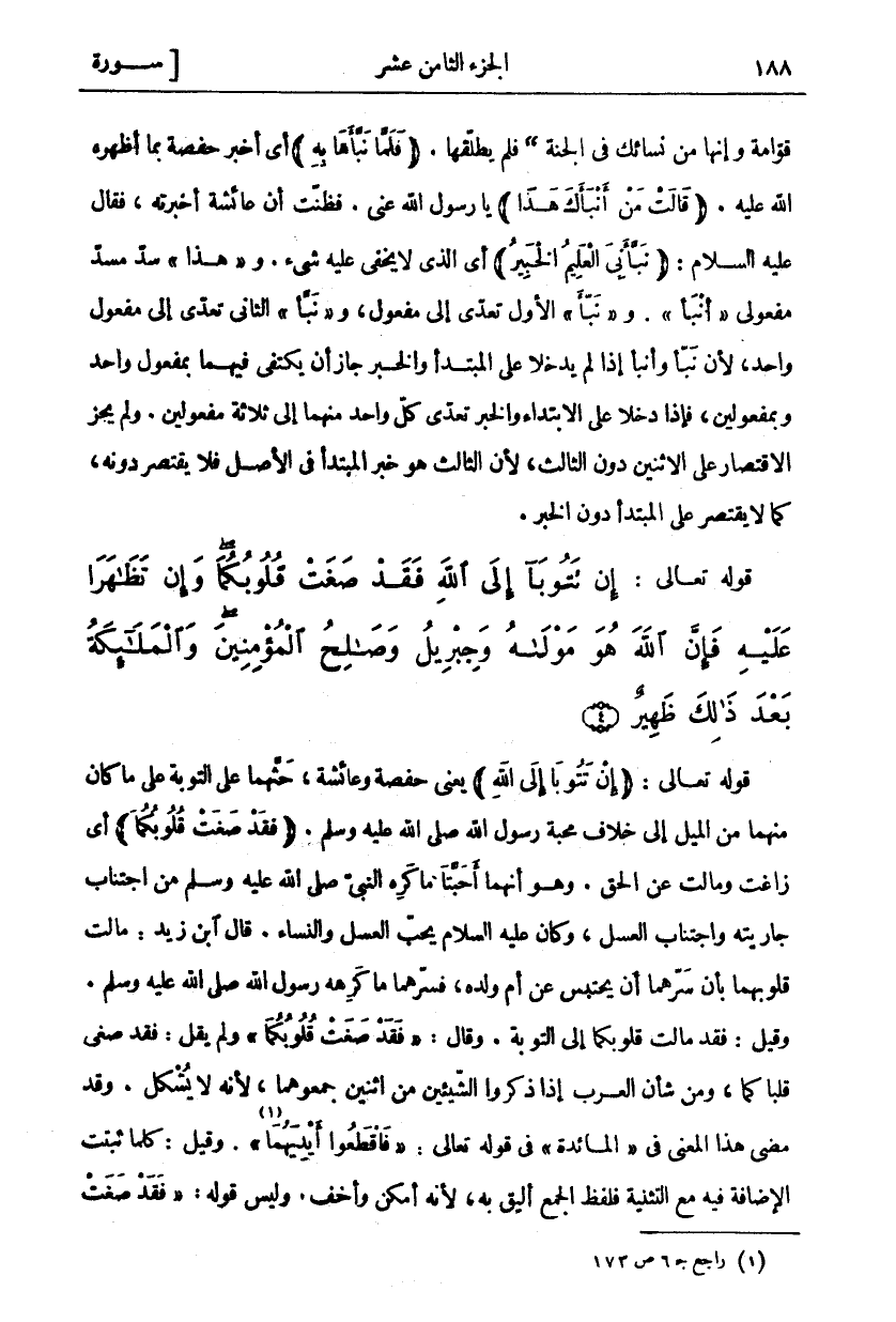 قَوَّامَةٌ وَإِنَّهَا مِنْ نِسَائِكَ فِي الْجَنَّةِ) فَلَمْ يُطَلِّقْهَا. (فَلَمَّا نَبَّأَها بِهِ) أَيْ أَخْبَرَ حَفْصَةَ بِمَا أَظْهَرَهُ اللَّهُ عَلَيْهِ. (قالَتْ مَنْ أَنْبَأَكَ هَذَا) يَا رَسُولَ اللَّهِ عَنِّي. فَظَنَّتْ أَنَّ عَائِشَةَ أَخْبَرَتْهُ، فَقَالَ عَلَيْهِ السَّلَامُ: (نَبَّأَنِيَ الْعَلِيمُ الْخَبِيرُ) أي الذي لا يخفى عليه شي. وَهَذَا سَدَّ مَسَدَّ مَفْعُولَيْ أَنْبَأَ. وَ (نَبَّأَ) الأول تعدى إلى مفعول، وَ (نَبَّأَ) الثَّانِي تَعَدَّى إِلَى مَفْعُولٍ وَاحِدٍ، لِأَنَّ نَبَّأَ وَأَنْبَأَ إِذَا لَمْ يَدْخُلَا عَلَى الْمُبْتَدَأِ وَالْخَبَرِ جَازَ أَنْ يُكْتَفَى فِيهِمَا بِمَفْعُولٍ وَاحِدٍ وَبِمَفْعُولَيْنِ، فَإِذَا دَخَلَا عَلَى الِابْتِدَاءِ وَالْخَبَرِ تعدى كل واحد منهما إلى ثلاثة مفعولين. وَلَمْ يَجُزِ الِاقْتِصَارُ عَلَى الِاثْنَيْنِ دُونَ الثَّالِثِ، لِأَنَّ الثَّالِثَ هُوَ خَبَرُ الْمُبْتَدَأِ فِي الْأَصْلِ فَلَا يُقْتَصَرُ دُونَهُ، كَمَا لَا يُقْتَصَرُ عَلَى المبتدأ دون الخبر.