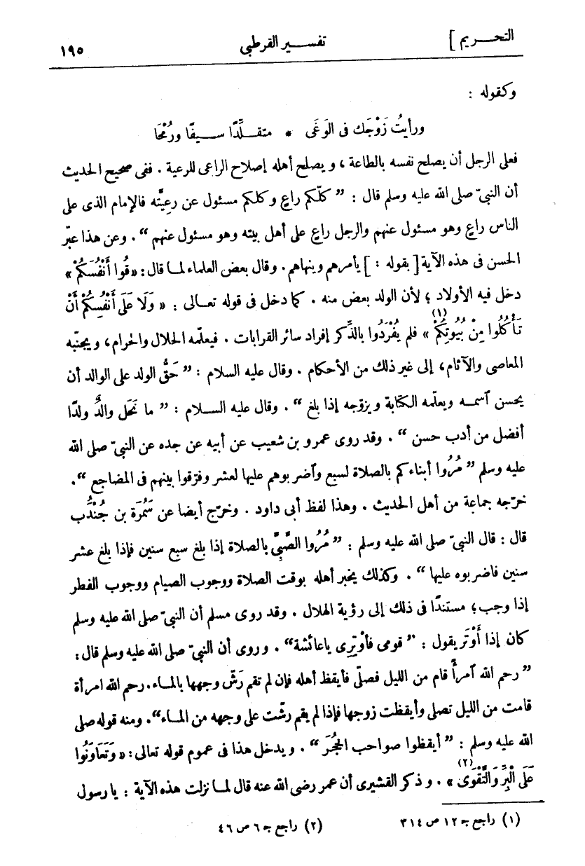 فَعَلَى الرَّجُلِ أَنْ يُصْلِحَ نَفْسَهُ بِالطَّاعَةِ، وَيُصْلِحَ أَهْلَهُ إِصْلَاحَ الرَّاعِي لِلرَّعِيَّةِ. فَفِي صَحِيحِ الْحَدِيثِ أَنَّ النَّبِيَّ صَلَّى اللَّهُ عَلَيْهِ وَسَلَّمَ قَالَ: (كُلُّكُمْ رَاعٍ وَكُلُّكُمْ مَسْئُولٌ عَنْ رَعِيَّتِهِ فَالْإِمَامُ الَّذِي عَلَى النَّاسِ رَاعٍ وَهُوَ مَسْئُولٌ عَنْهُمْ وَالرَّجُلُ رَاعٍ عَلَى أَهْلِ بَيْتِهِ وَهُوَ مَسْئُولٌ عَنْهُمْ (. وَعَنْ هَذَا عَبَّرَ الْحَسَنُ فِي هَذِهِ الْآيَةِ بِقَوْلِهِ: يَأْمُرُهُمْ وَيَنْهَاهُمْ. وَقَالَ بَعْضُ الْعُلَمَاءِ لَمَّا قَالَ: قُوا أَنْفُسَكُمْ دَخَلَ فِيهِ الْأَوْلَادُ، لِأَنَّ الْوَلَدَ بَعْضٌ مِنْهُ. كَمَا دَخَلَ فِي قَوْلَهُ تَعَالَى: وَلا عَلى أَنْفُسِكُمْ أَنْ تَأْكُلُوا مِنْ بُيُوتِكُمْ «١» [النور: ٦١] فَلَمْ يُفْرَدُوا بِالذِّكْرِ إِفْرَادَ سَائِرِ الْقَرَابَاتِ. فَيُعَلِّمُهُ الْحَلَالَ وَالْحَرَامَ، وَيُجَنِّبُهُ الْمَعَاصِيَ وَالْآثَامَ، إِلَى غَيْرِ ذَلِكَ مِنَ الْأَحْكَامِ. وَقَالَ عَلَيْهِ السَّلَامُ: (حَقُّ الْوَلَدِ عَلَى الْوَالِدِ أَنْ يُحْسِنَ اسْمَهُ وَيُعَلِّمَهُ الْكِتَابَةَ وَيُزَوِّجَهُ إِذَا بَلَغَ). وَقَالَ عَلَيْهِ السَّلَامُ: (مَا نَحَلَ وَالِدٌ وَلَدًا أَفْضَلَ مِنْ أَدَبٍ حَسَنٍ). وَقَدْ رَوَى عَمْرُو بْنُ شُعَيْبٍ عَنْ أَبِيهِ عَنْ جَدِّهِ عَنِ النَّبِيِّ صَلَّى اللَّهُ عَلَيْهِ وَسَلَّمَ (مُرُوا أَبْنَاءَكُمْ بِالصَّلَاةِ لِسَبْعٍ وَاضْرِبُوهُمْ عَلَيْهَا لِعَشْرٍ وَفَرِّقُوا بَيْنَهُمْ فِي الْمَضَاجِعِ). خَرَّجَهُ جَمَاعَةٌ مِنْ أَهْلِ الْحَدِيثِ. وَهَذَا لَفْظُ أَبِي دَاوُدَ. وَخَرَّجَ أَيْضًا عَنْ سَمُرَةَ بْنِ جُنْدَبٍ قَالَ: قَالَ النَّبِيُّ صَلَّى اللَّهُ عَلَيْهِ وَسَلَّمَ: (مُرُوا الصَّبِيَّ بِالصَّلَاةِ إِذَا بَلَغَ سَبْعَ سِنِينَ فَإِذَا بَلَغَ عَشْرَ سِنِينَ فَاضْرِبُوهُ عَلَيْهَا). وَكَذَلِكَ يُخْبِرُ أَهْلَهُ بِوَقْتِ الصَّلَاةِ وَوُجُوبِ الصِّيَامِ وَوُجُوبِ الْفِطْرِ إِذَا وَجَبَ، مُسْتَنِدًا فِي ذَلِكَ إِلَى رُؤْيَةِ الْهِلَالِ. وَقَدْ رَوَى مُسْلِمٍ أَنَّ النَّبِيَّ صَلَّى اللَّهُ عَلَيْهِ وَسَلَّمَ كَانَ إِذَا أَوْتَرَ يَقُولُ: (قُومِي فَأَوْتِرِي يَا عَائِشَةُ). وَرُوِيَ أَنَّ النَّبِيَّ صَلَّى اللَّهُ عَلَيْهِ وَسَلَّمَ قَالَ: (رَحِمَ اللَّهُ امْرَأً قَامَ مِنَ اللَّيْلِ فَصَلَّى فَأَيْقَظَ أَهْلَهُ فَإِنْ لَمْ تَقُمْ رَشَّ وَجْهَهَا بِالْمَاءِ. رَحِمَ اللَّهُ امْرَأَةً قَامَتْ مِنَ اللَّيْلِ تُصَلِّي وَأَيْقَظَتْ زَوْجَهَا فَإِذَا لَمْ يَقُمْ رَشَّتْ عَلَى وَجْهِهِ مِنَ الْمَاءِ (. وَمِنْهُ قَوْلُهُ صَلَّى اللَّهُ عَلَيْهِ وَسَلَّمَ:) أَيْقِظُوا صَوَاحِبَ الْحُجَرِ (. وَيَدْخُلُ هَذَا فِي عُمُومِ قَوْلِهِ تَعَالَى: وَتَعاوَنُوا عَلَى الْبِرِّ وَالتَّقْوى «٢» [المائدة: ٢]. وَذَكَرَ الْقُشَيْرِيُّ أَنَّ عُمَرَ رَضِيَ اللَّهُ عَنْهُ قَالَ لَمَّا نَزَلَتْ هَذِهِ الْآيَةُ: يَا رَسُولَ