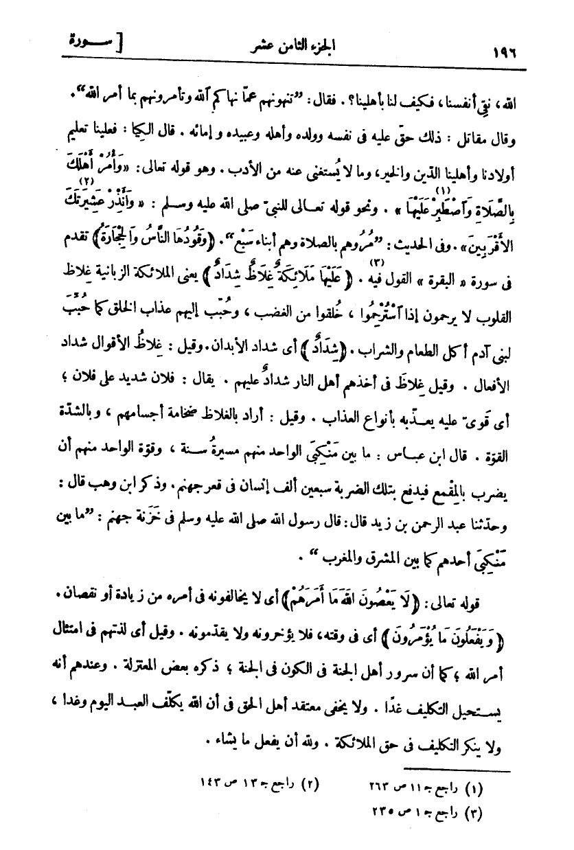 الله، نقي أنفسنا، فكيف لنبإ علينا؟. فَقَالَ: (تَنْهَوْنَهُمْ عَمَّا نَهَاكُمُ اللَّهُ وَتَأْمُرُونَهُمْ بِمَا أَمَرَ اللَّهُ). وَقَالَ مُقَاتِلٌ: ذَلِكَ حَقٌّ عَلَيْهِ فِي نَفْسِهِ وَوَلَدِهِ وَأَهْلِهِ وَعَبِيدِهِ وَإِمَائِهِ. قَالَ الْكِيَا: فَعَلَيْنَا تَعْلِيمُ أَوْلَادِنَا وَأَهْلِينَا الدِّينَ وَالْخَيْرَ، وَمَا لَا يُسْتَغْنَى عَنْهُ مِنَ الْأَدَبِ. وَهُوَ قَوْلُهُ تَعَالَى: وَأْمُرْ أَهْلَكَ بِالصَّلاةِ وَاصْطَبِرْ «١» عَلَيْها [طه: ١٣٢]. وَنَحْوَ قَوْلِهِ تَعَالَى لِلنَّبِيِّ صَلَّى اللَّهُ عَلَيْهِ وسلم: وَأَنْذِرْ عَشِيرَتَكَ «٢» الْأَقْرَبِينَ. [الشعراء: ٢١٤]. وَفِي الْحَدِيثِ:" مُرُوهُمْ بِالصَّلَاةِ وَهُمْ أَبْنَاءُ سَبْعٍ". (وَقُودُهَا النَّاسُ وَالْحِجارَةُ) تَقَدَّمَ فِي سُورَةِ" الْبَقَرَةِ" القول فيه «٣». (عَلَيْها مَلائِكَةٌ غِلاظٌ شِدادٌ) يَعْنِي الْمَلَائِكَةَ الزَّبَانِيَةَ غِلَاظَ الْقُلُوبِ لَا يَرْحَمُونَ إِذَا اسْتُرْحِمُوا، خُلِقُوا مِنَ الْغَضَبِ، وَحُبِّبَ إِلَيْهِمْ عَذَابُ الْخَلْقِ كَمَا حُبِّبَ لِبَنِي آدَمَ أَكْلُ الطَّعَامِ وَالشَّرَابِ. شِدادٌ أَيْ شِدَادُ الْأَبْدَانِ. وَقِيلَ: غِلَاظُ الْأَقْوَالِ شِدَادُ الْأَفْعَالِ. وَقِيلَ غِلَاظٌ فِي أَخْذِهِمْ أَهْلَ النَّارِ شِدَادٌ عَلَيْهِمْ. يُقَالُ: فُلَانٌ شَدِيدٌ عَلَى فُلَانٍ، أَيْ قَوِيٌّ عَلَيْهِ يُعَذِّبُهُ بِأَنْوَاعِ الْعَذَابِ. وَقِيلَ: أَرَادَ بِالْغِلَاظِ ضَخَامَةَ أَجْسَامِهِمْ، وَبِالشِّدَّةِ الْقُوَّةَ. قَالَ ابْنُ عَبَّاسٍ: مَا بَيْنَ مَنْكِبَيِ الْوَاحِدِ مِنْهُمْ مسيرة سنة، وقوة الواحد منهم أن يضرب بالمقمع فيدفع بتلك الضربة سبعين ألف إنسان فِي قَعْرِ جَهَنَّمَ. وَذَكَرَ ابْنُ وَهْبٍ قَالَ: وَحَدَّثَنَا عَبْدُ الرَّحْمَنِ بْنُ زَيْدٍ قَالَ: قَالَ رَسُولُ اللَّهِ صَلَّى اللَّهُ عَلَيْهِ وسلم في خَزَنَةِ جَهَنَّمَ: (مَا بَيْنَ مَنْكِبَيْ أَحَدِهِمْ كَمَا بَيْنَ الْمَشْرِقِ وَالْمَغْرِبِ). قَوْلُهُ تَعَالَى: (لَا يَعْصُونَ اللَّهَ مَا أَمَرَهُمْ) أَيْ لَا يُخَالِفُونَهُ فِي أَمْرِهِ مِنْ زِيَادَةٍ أَوْ نُقْصَانٍ. (وَيَفْعَلُونَ مَا يُؤْمَرُونَ) أَيْ فِي وَقْتِهِ، فَلَا يُؤَخِّرُونَهُ وَلَا يُقَدِّمُونَهُ. وَقِيلَ أَيْ لَذَّتُهُمْ فِي امْتِثَالِ أَمْرِ اللَّهِ، كَمَا أَنَّ سُرُورَ أَهْلِ الْجَنَّةِ فِي الْكَوْنِ فِي الْجَنَّةِ، ذَكَرَهُ بَعْضُ الْمُعْتَزِلَةِ. وَعِنْدَهُمْ أَنَّهُ يَسْتَحِيلُ التَّكْلِيفُ غَدًا. وَلَا يَخْفَى مُعْتَقَدُ أَهْلِ الْحَقِّ فِي أَنَّ اللَّهَ يُكَلِّفُ الْعَبْدَ الْيَوْمَ وَغَدًا، وَلَا يُنْكَرُ التَّكْلِيفُ فِي حَقِّ الملائكة. ولله أن يفعل ما يشاء.