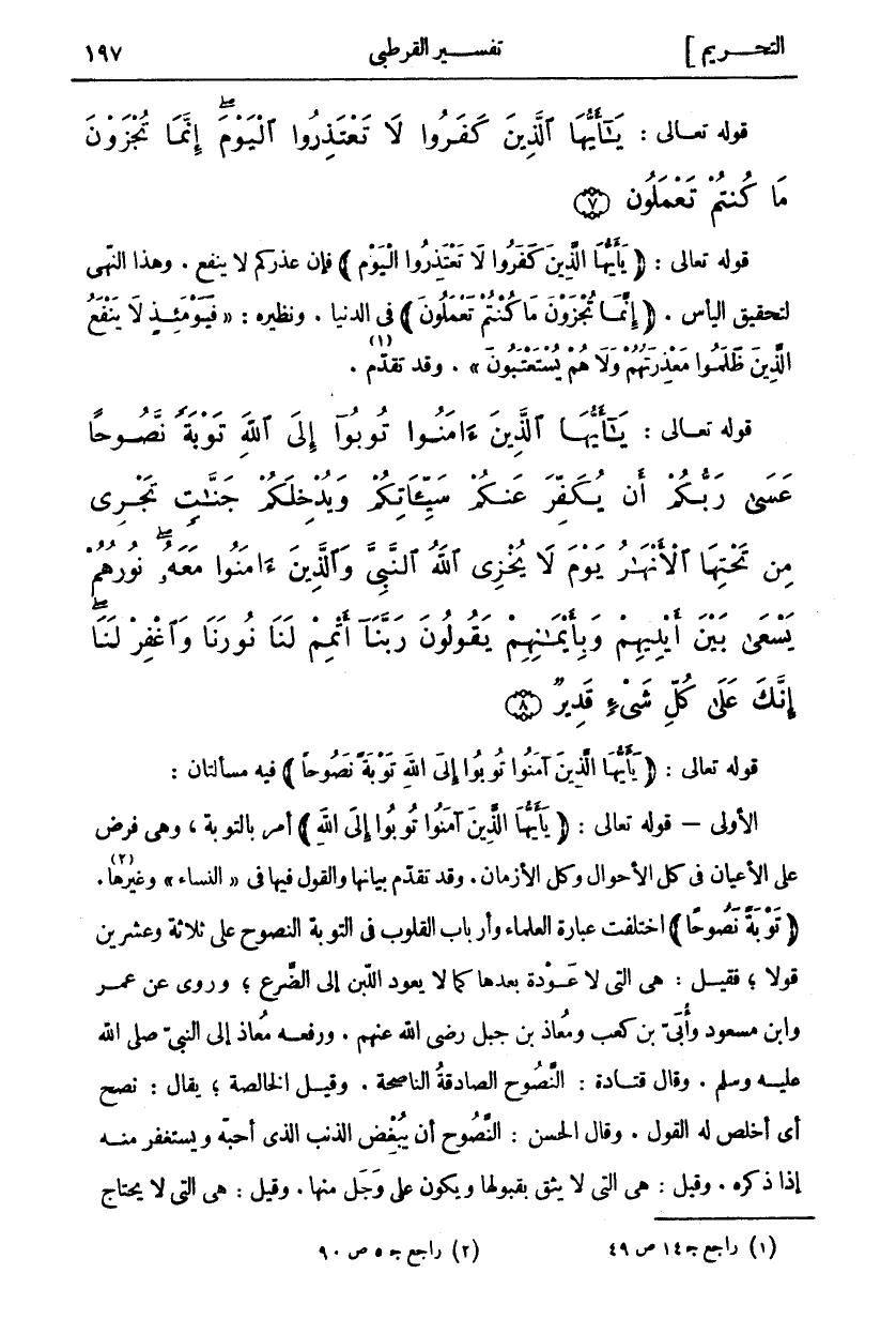 قَوْلُهُ تَعَالَى: (يَا أَيُّهَا الَّذِينَ آمَنُوا تُوبُوا إِلَى اللَّهِ تَوْبَةً نَصُوحاً) فِيهِ مَسْأَلَتَانِ: الْأُولَى- قَوْلُهُ تَعَالَى: يَا أَيُّهَا الَّذِينَ آمَنُوا تُوبُوا إِلَى اللَّهِ أَمْرٌ بِالتَّوْبَةِ وَهِيَ فَرْضٌ عَلَى الْأَعْيَانِ فِي كُلِّ الْأَحْوَالِ وَكُلِّ الْأَزْمَانِ. وَقَدْ تَقَدَّمَ بَيَانُهَا وَالْقَوْلُ فِيهَا فِي" النِّسَاءِ" وَغَيْرِهَا «٢». تَوْبَةً نَصُوحاً اخْتَلَفَتْ عِبَارَةُ الْعُلَمَاءِ وَأَرْبَابِ الْقُلُوبِ فِي التَّوْبَةِ النَّصُوحِ عَلَى ثَلَاثَةٍ وَعِشْرِينَ قَوْلًا، فَقِيلَ: هِيَ الَّتِي لا عودة بعدها كمالا يَعُودُ اللَّبَنُ إِلَى الضَّرْعِ، وَرُوِيَ عَنْ عُمَرَ وَابْنِ مَسْعُودٍ وَأُبَيِّ بْنِ كَعْبٍ وَمُعَاذِ بْنِ جَبَلٍ رَضِيَ اللَّهُ عَنْهُمْ. وَرَفَعَهُ مُعَاذٌ إِلَى النَّبِيِّ صَلَّى اللَّهُ عَلَيْهِ وَسَلَّمَ. وَقَالَ قَتَادَةُ: النَّصُوحُ الصَّادِقَةُ النَّاصِحَةُ. وَقِيلَ الْخَالِصَةُ، يُقَالُ: نَصَحَ أَيْ أَخْلَصَ لَهُ الْقَوْلَ. وَقَالَ الْحَسَنُ: النَّصُوحُ أَنْ يُبْغِضَ الذَّنْبَ الَّذِي أَحَبَّهُ وَيَسْتَغْفِرَ مِنْهُ إِذَا ذَكَرَهُ. وَقِيلَ: هِيَ الَّتِي لَا يَثِقُ بِقَبُولِهَا وَيَكُونُ عَلَى وَجَلٍ مِنْهَا. وَقِيلَ: هِيَ التي لا يحتاج