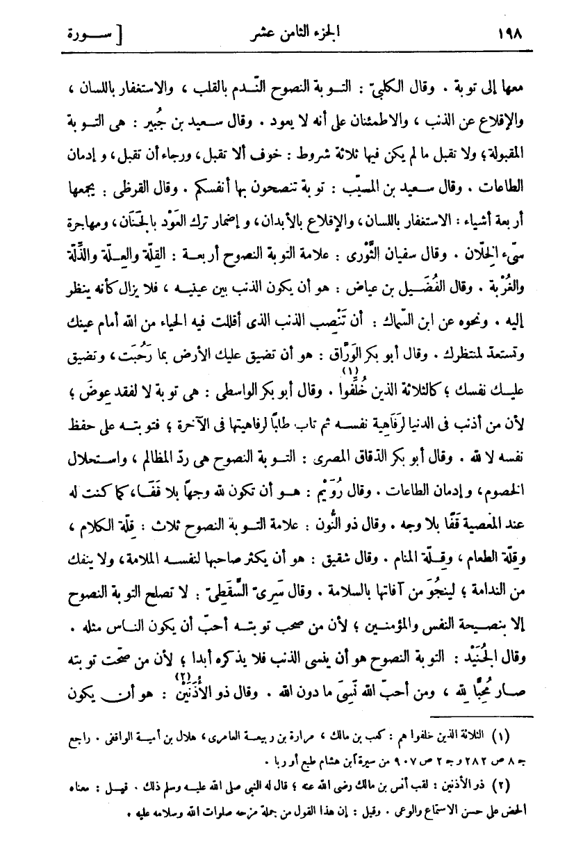 مَعَهَا إِلَى تَوْبَةٍ. وَقَالَ الْكَلْبِيُّ: التَّوْبَةُ النَّصُوحُ النَّدَمُ بِالْقَلْبِ، وَالِاسْتِغْفَارُ بِاللِّسَانِ، وَالْإِقْلَاعُ عَنِ الذَّنْبِ، وَالِاطْمِئْنَانُ عَلَى أَنَّهُ لَا يَعُودُ .. وَقَالَ سَعِيدُ بْنُ جُبَيْرٍ: هِيَ التَّوْبَةُ الْمَقْبُولَةُ، وَلَا تُقْبَلُ مَا لَمْ يَكُنْ فِيهَا ثَلَاثَةُ شُرُوطٍ: خَوْفُ أَلَّا تُقْبَلَ، وَرَجَاءُ أَنْ تُقْبَلَ، وَإِدْمَانُ الطَّاعَاتِ. وَقَالَ سَعِيدُ بْنُ الْمُسَيَّبِ: تَوْبَةٌ تَنْصَحُونَ بِهَا أَنْفُسَكُمْ. وَقَالَ الْقُرَظِيُّ: يَجْمَعُهَا أَرْبَعَةُ أَشْيَاءَ: الِاسْتِغْفَارُ بِاللِّسَانِ، وَإِقْلَاعٌ بِالْأَبْدَانِ، وَإِضْمَارُ تَرْكِ الْعَوْدِ بِالْجِنَانِ، وَمُهَاجَرَةُ سَيِّئِ الْخِلَّانِ. وَقَالَ سُفْيَانُ الثَّوْرِيُّ: عَلَامَةُ التَّوْبَةِ النَّصُوحِ أَرْبَعَةٌ: الْقِلَّةُ وَالْعِلَّةُ وَالذِّلَّةُ وَالْغُرْبَةُ. وَقَالَ الْفُضَيْلُ بْنُ عِيَاضٍ: هُوَ أَنْ يَكُونَ الذَّنْبُ بَيْنَ عَيْنَيْهِ، فَلَا يَزَالُ كَأَنَّهُ يَنْظُرُ إِلَيْهِ. وَنَحْوَهُ عَنِ ابْنِ السِّمَاكِ: أَنْ تَنْصِبَ الذَّنْبَ الَّذِي أَقْلَلْتَ فِيهِ الْحَيَاءَ مِنَ اللَّهِ أَمَامَ عَيْنِكَ وَتَسْتَعِدُّ لِمُنْتَظِرِكَ. وَقَالَ أَبُو بَكْرٍ الْوَرَّاقُ: هُوَ أَنْ تَضِيقَ عَلَيْكَ الْأَرْضُ بِمَا رَحُبَتْ، وَتَضِيقَ عَلَيْكَ نَفْسُكَ، كَالثَّلَاثَةِ الَّذِينَ خُلِّفُوا «١». وَقَالَ أَبُو بَكْرٍ الْوَاسِطِيُّ: هِيَ تَوْبَةٌ لَا لِفَقْدِ عِوَضٍ، لِأَنَّ مَنْ أَذْنَبَ فِي الدُّنْيَا لِرَفَاهِيَةِ نَفْسِهِ ثُمَّ تَابَ طَلَبًا لِرَفَاهِيَتِهَا فِي الْآخِرَةِ، فَتَوْبَتُهُ عَلَى حِفْظِ نَفْسِهِ لَا لِلَّهِ. وَقَالَ أَبُو بَكْرٍ الدَّقَّاقُ الْمِصْرِيُّ: التَّوْبَةُ النَّصُوحُ هِيَ رَدُّ الْمَظَالِمِ، وَاسْتِحْلَالُ الْخُصُومِ، وَإِدْمَانُ الطَّاعَاتِ. وَقَالَ رُوَيْمٌ: هُوَ أَنْ تَكُونَ لِلَّهِ وَجْهًا بِلَا قَفًا، كَمَا كُنْتَ لَهُ عِنْدَ الْمَعْصِيَةِ قَفًا بِلَا وَجْهٍ. وَقَالَ ذُو النُّونِ: عَلَامَةُ التَّوْبَةِ النَّصُوحِ ثَلَاثٌ: قِلَّةُ الْكَلَامِ، وَقِلَّةُ الطَّعَامِ، وَقِلَّةُ الْمَنَامِ. وَقَالَ شَقِيقٌ: هُوَ أَنْ يُكْثِرَ صَاحِبُهَا لِنَفْسِهِ الْمَلَامَةَ، وَلَا يَنْفَكَّ مِنَ النَّدَامَةِ، لِيَنْجُوَ مِنْ آفَاتِهَا بِالسَّلَامَةِ. وَقَالَ سَرِيٌّ السَّقَطِيُّ: لَا تَصْلُحُ التَّوْبَةُ النَّصُوحُ إِلَّا بِنَصِيحَةٍ النَّفْسِ والمؤمنين، لان من صحب تَوْبَتُهُ أَحَبَّ أَنْ يَكُونَ النَّاسُ مِثْلَهُ. وَقَالَ الْجُنَيْدُ: التَّوْبَةُ النَّصُوحُ هُوَ أَنْ يَنْسَى الذَّنْبَ فَلَا يَذْكُرُهُ أَبَدًا، لِأَنَّ مَنْ صَحَّتْ تَوْبَتُهُ صَارَ مُحِبًّا لِلَّهِ، وَمَنْ أَحَبَّ اللَّهَ نَسِيَ مَا دُونَ اللَّهِ. وَقَالَ ذُو الْأُذُنَيْنِ: «٢» هُوَ أن يكون